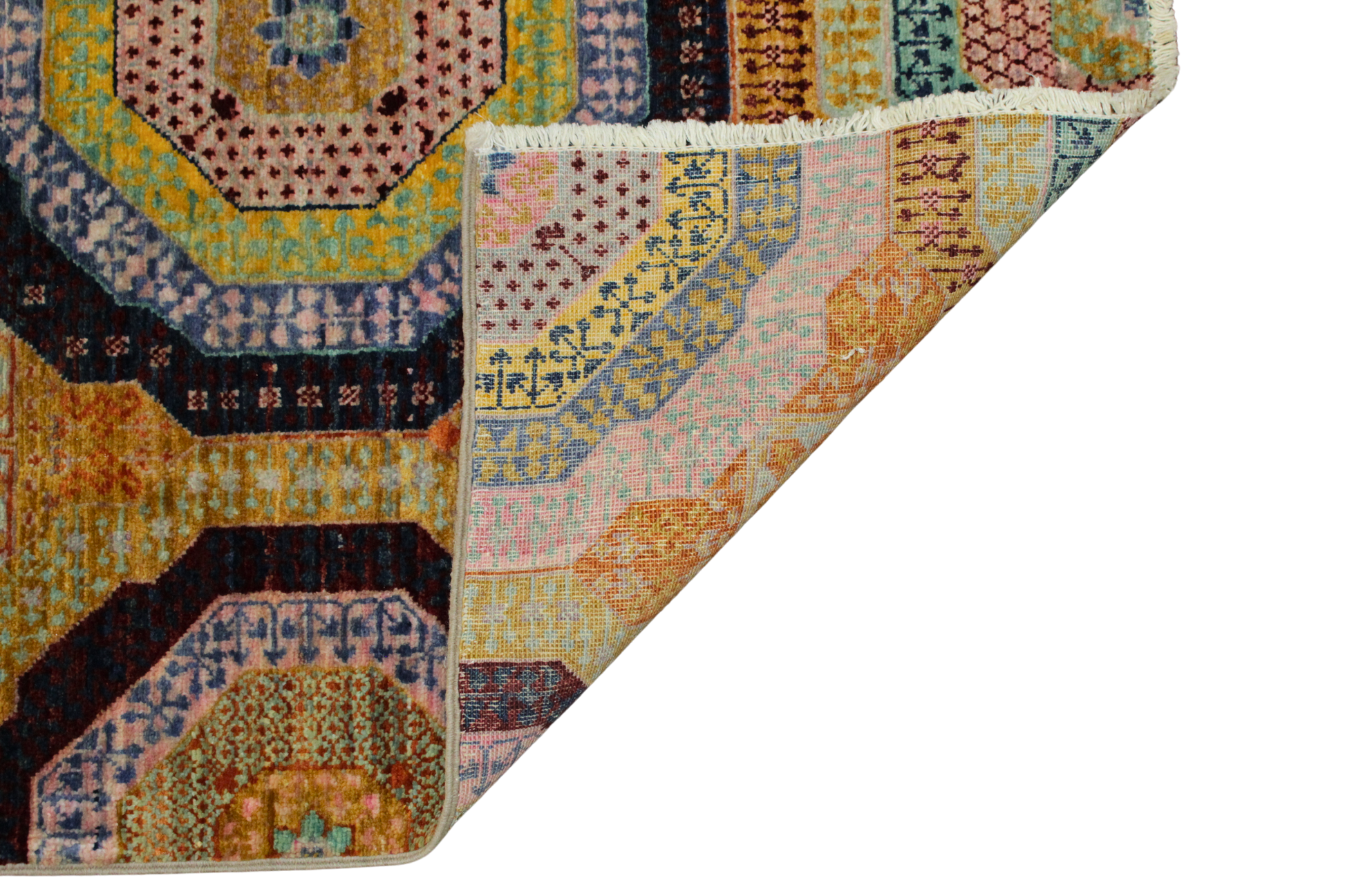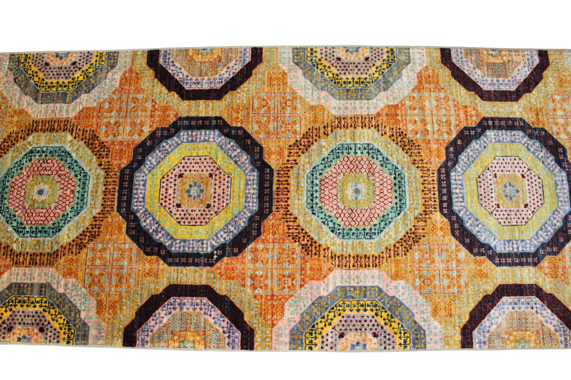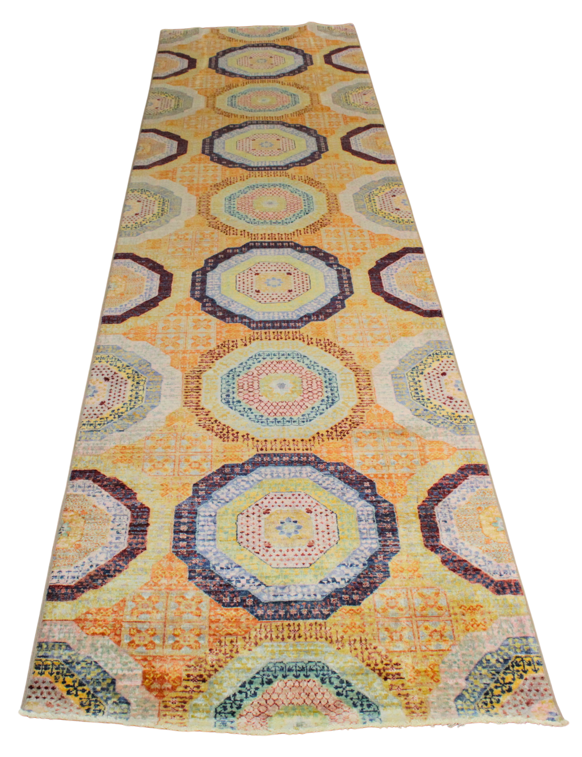 A dazzling tribute to the courtly elegance of 15th-century Cairo, this Afghan Mamluk runner bursts with powerful geometry and kaleidoscopic color. Each medallion unfolds like a jewel box, with precise octagonal forms radiating outward in vibrant tones of saffron, rose, indigo, turquoise, and plum — a rare and regal palette executed with masterful control.