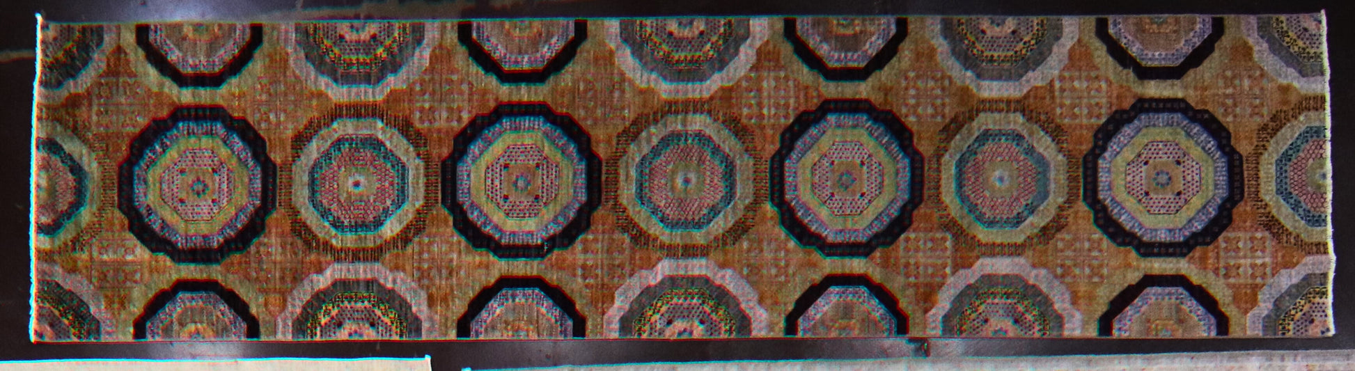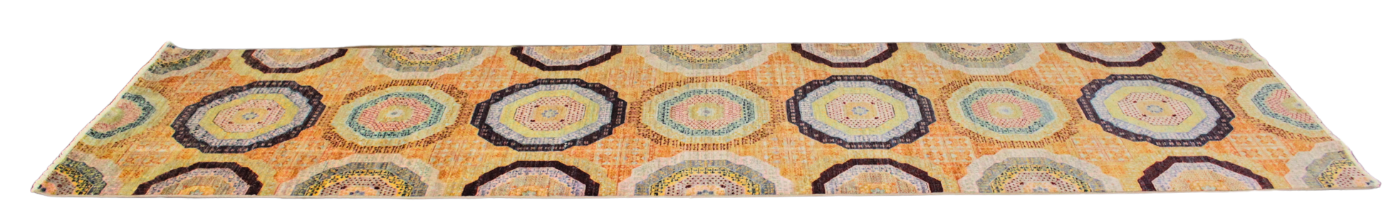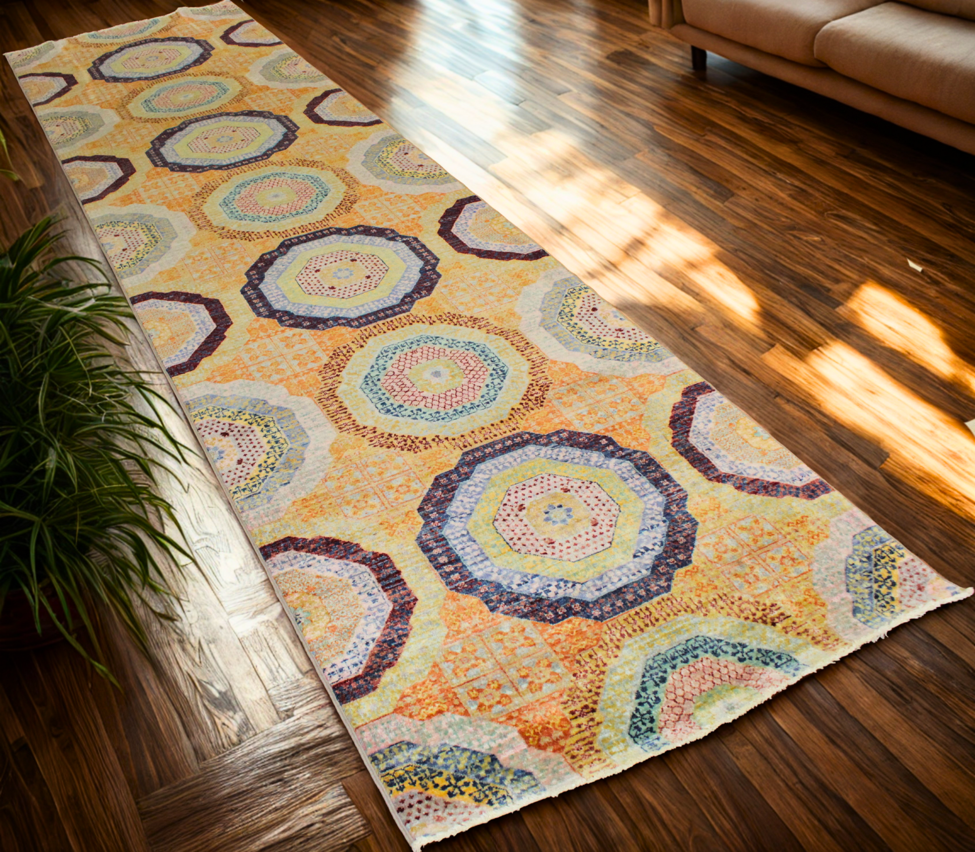 A dazzling tribute to the courtly elegance of 15th-century Cairo, this Afghan Mamluk runner bursts with powerful geometry and kaleidoscopic color. Each medallion unfolds like a jewel box, with precise octagonal forms radiating outward in vibrant tones of saffron, rose, indigo, turquoise, and plum — a rare and regal palette executed with masterful control.