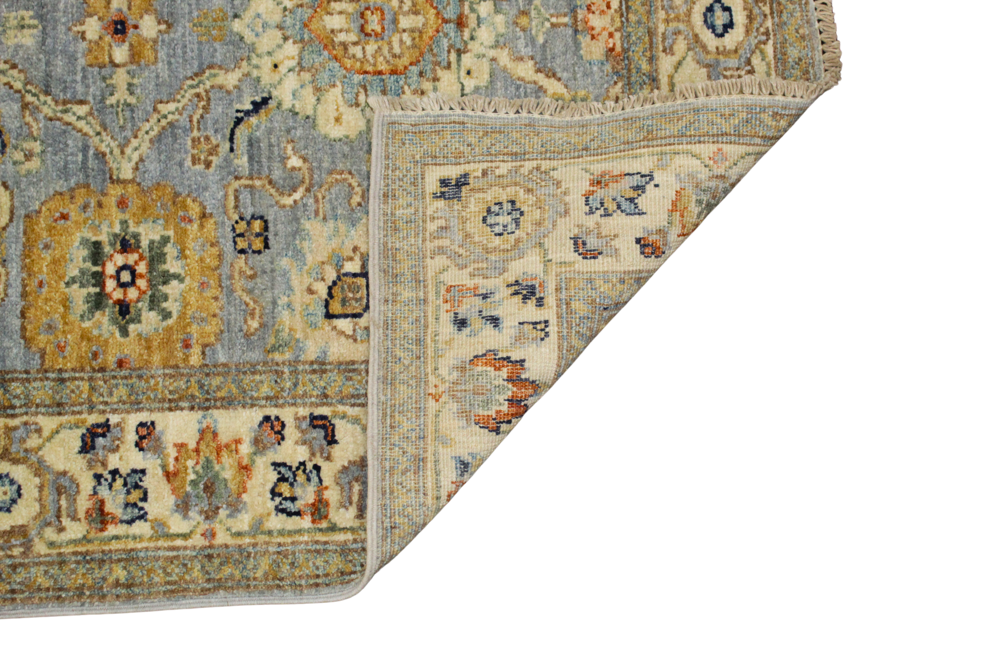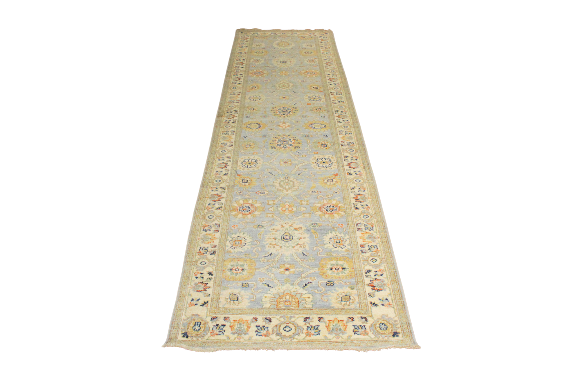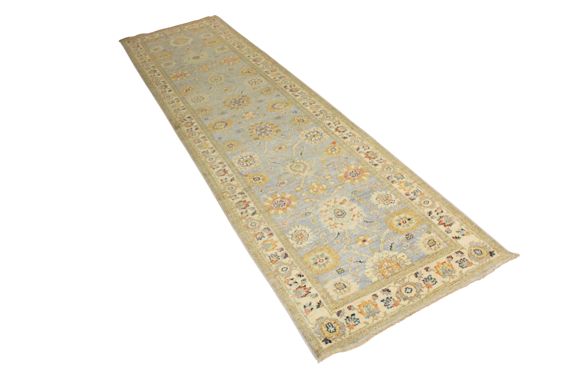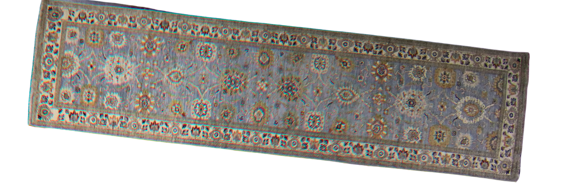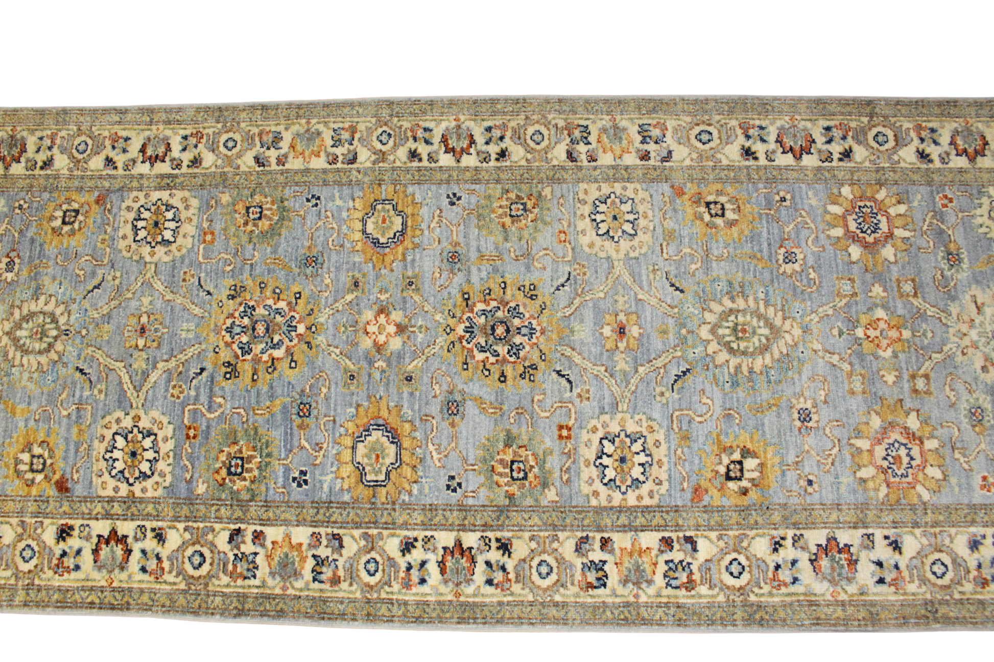 With a palette reminiscent of faded frescoes and a design steeped in classical refinement, this Afghan Mahal runner exudes quiet grandeur. Set against a powdery blue-gray field, the floral motifs bloom in mellow tones of ivory, rust, sage, and soft gold — delivering a harmonious yet intricate allover pattern with understated drama.