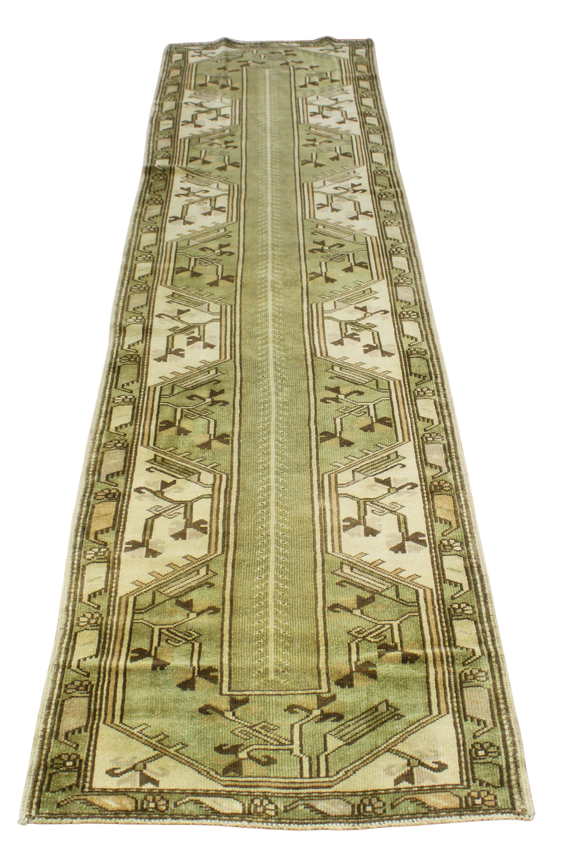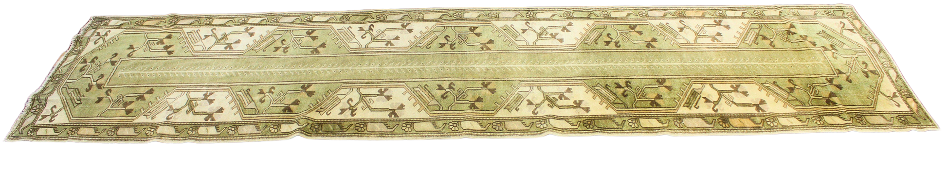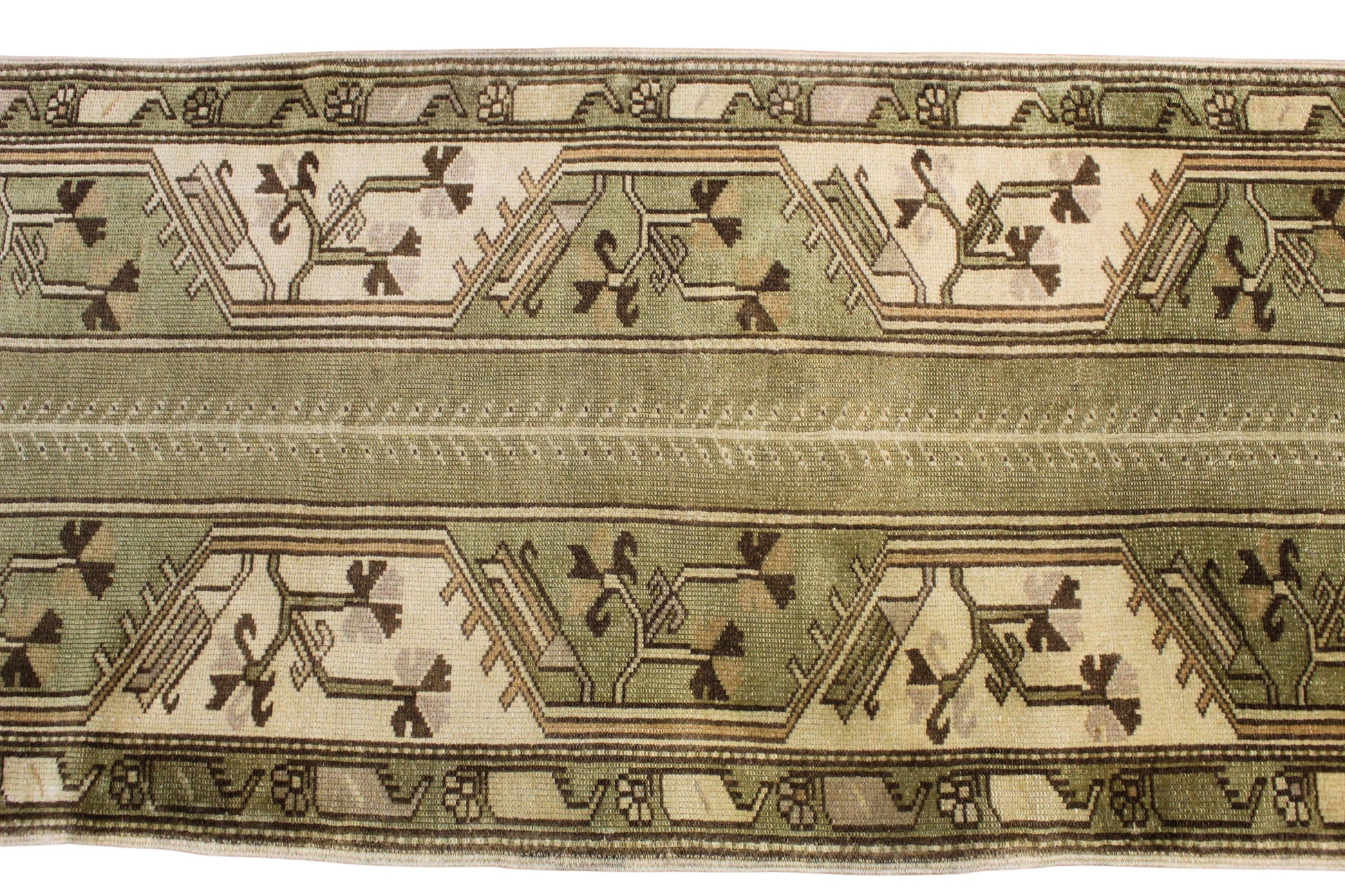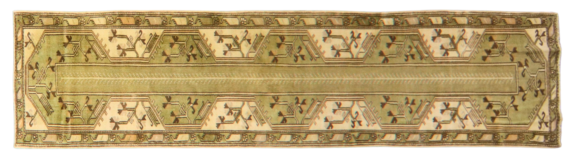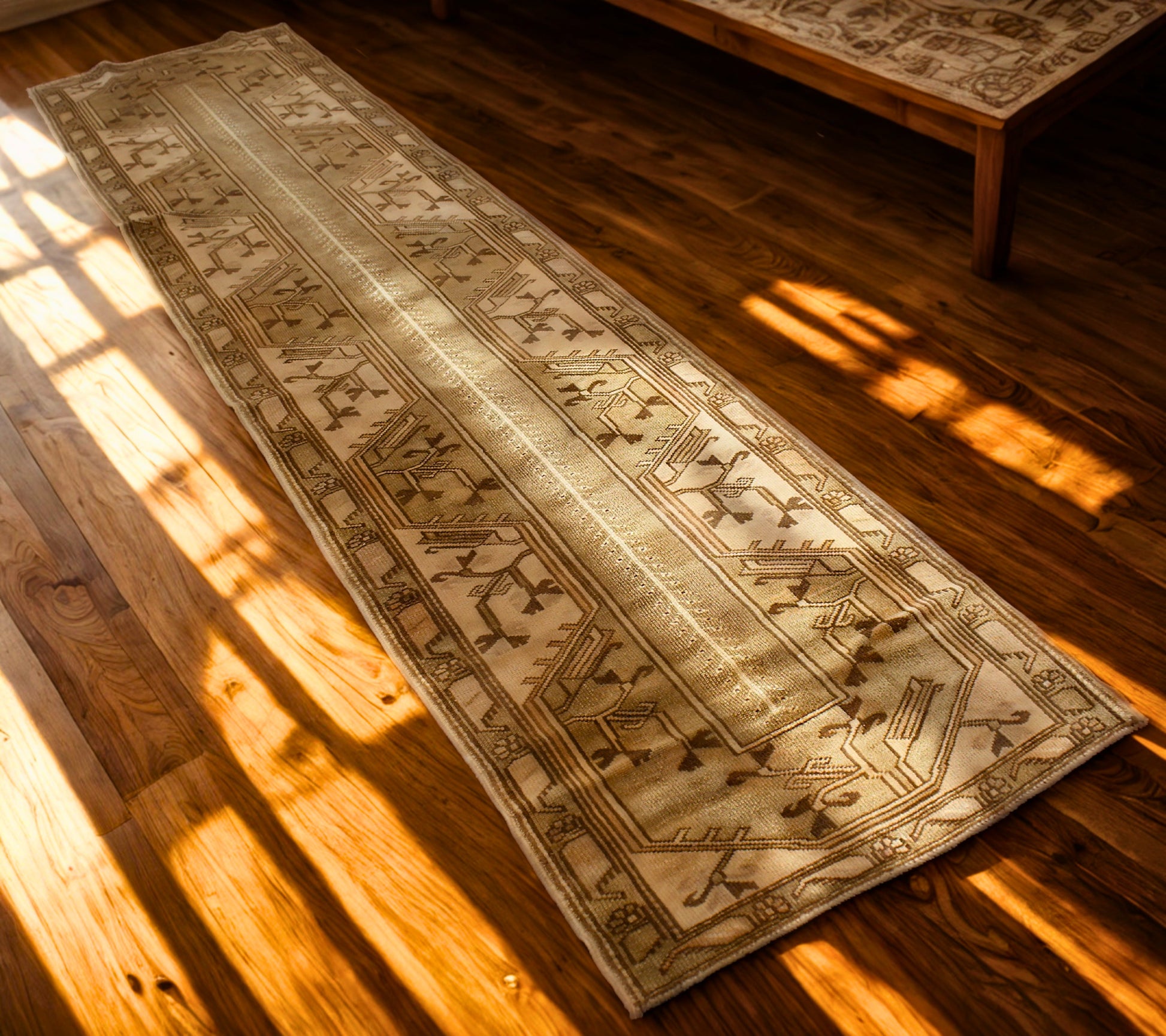 This exquisite 3.3 × 13.6 ft antique Malayer runner presents a mesmerizing wash of patina-rich color that only time can achieve. Its elongated field features an allover Herati-inspired pattern—delicate rosettes, stylized leaves, and diamond latticework—in soft tones of pale sky blue, rust, and ivory on a timeworn ground of earthy tan and olive. The abrash (color variation) running through the rug enhances its character and authenticity.