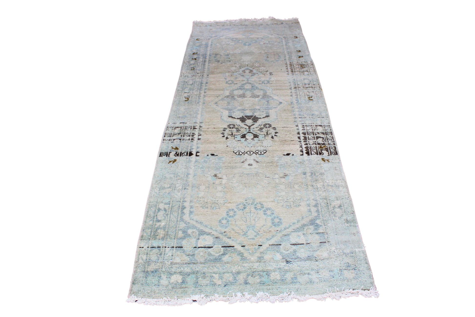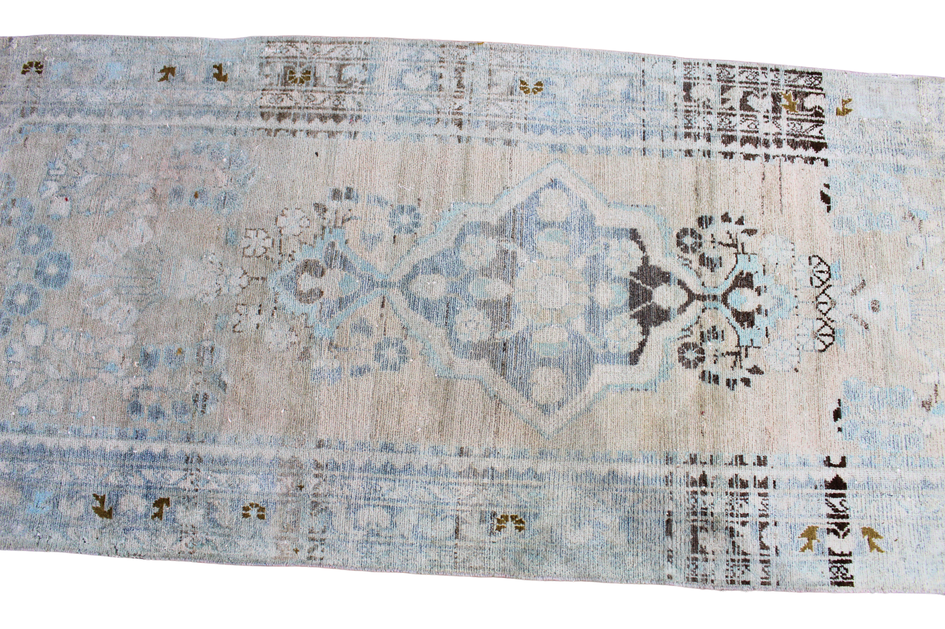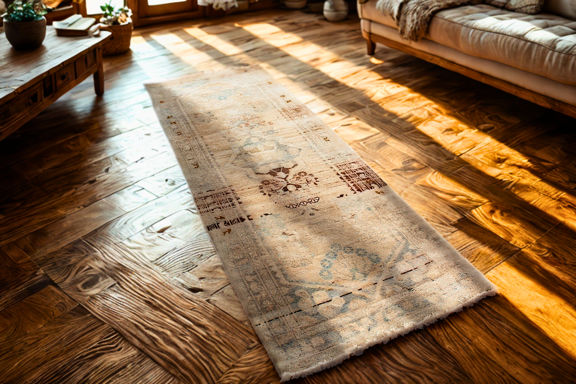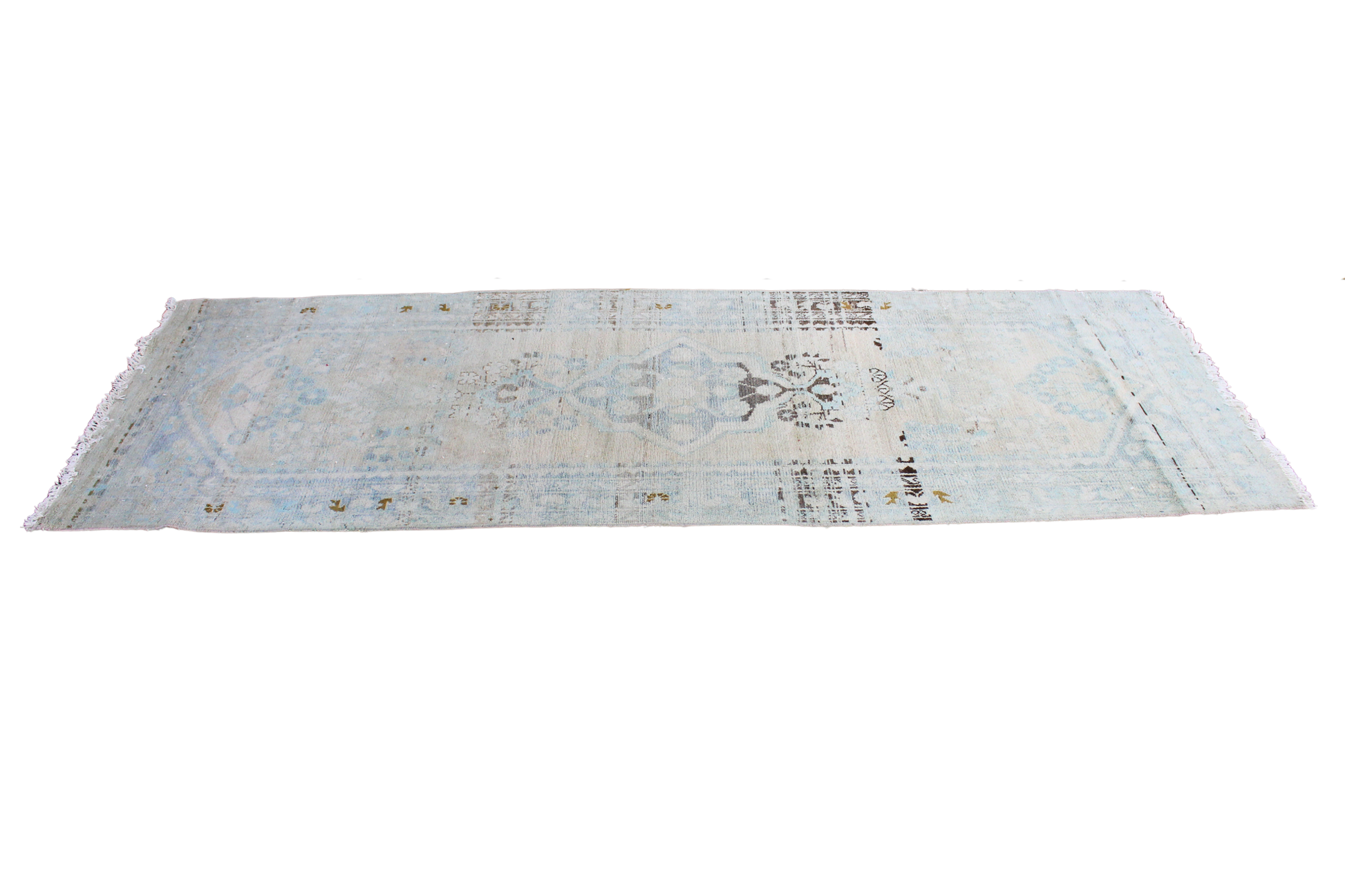 A delicate beauty aged to perfection, this antique Persian Malayer runner (3.7 × 10 ft) carries a quiet elegance that only time can bestow. Its washed, almost ethereal palette of silvery blues, ivory, and soft greys lends a whisper-like presence, with ghosted floral medallions and trailing vines subtly emerging through its patinated wool surface.