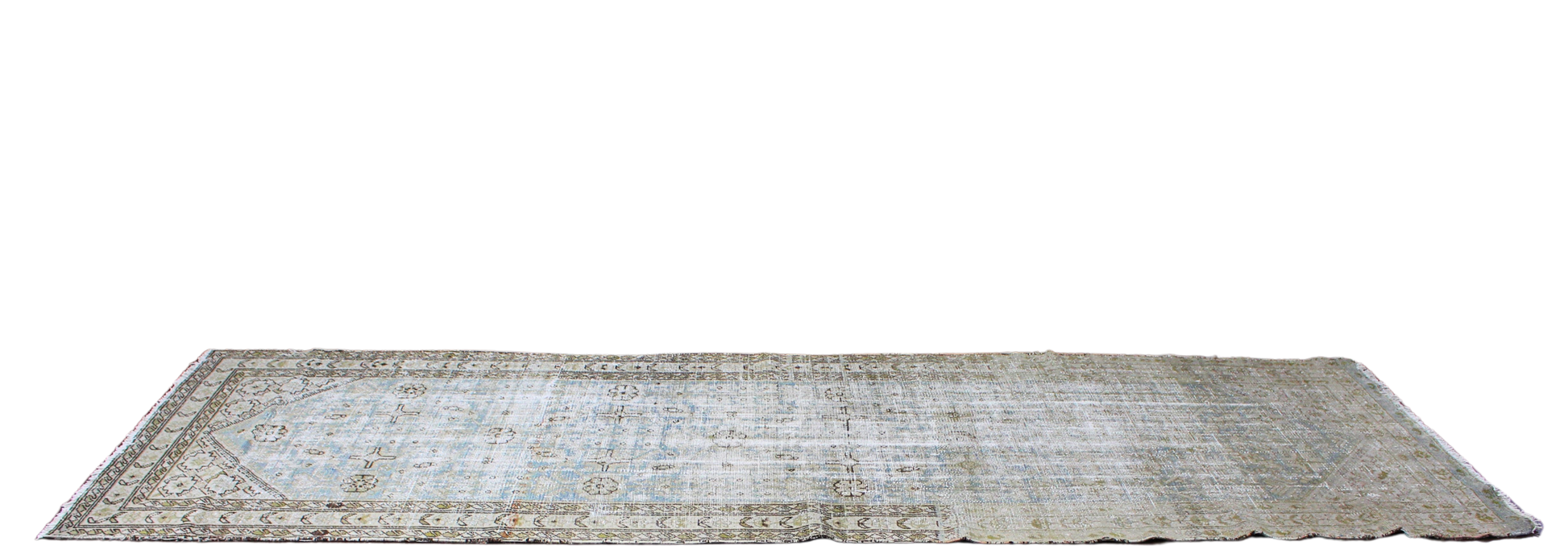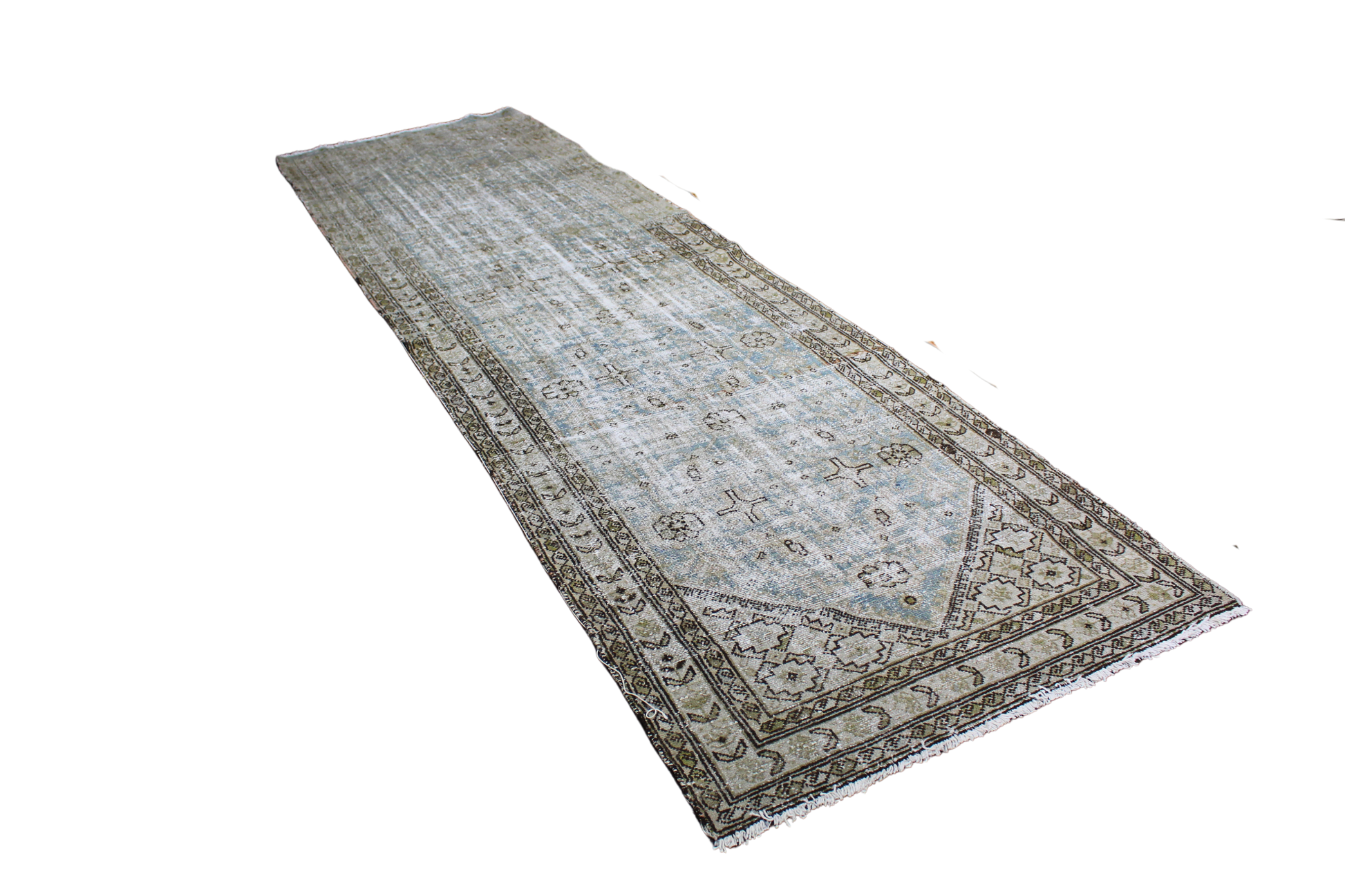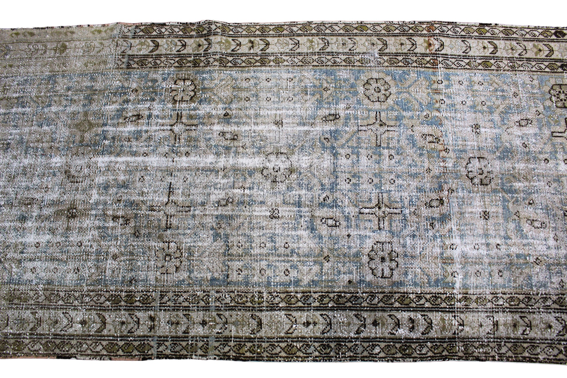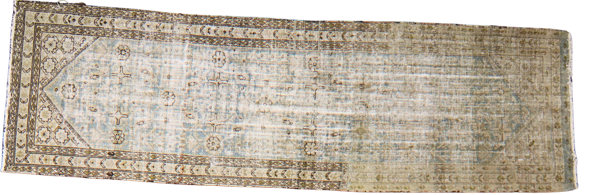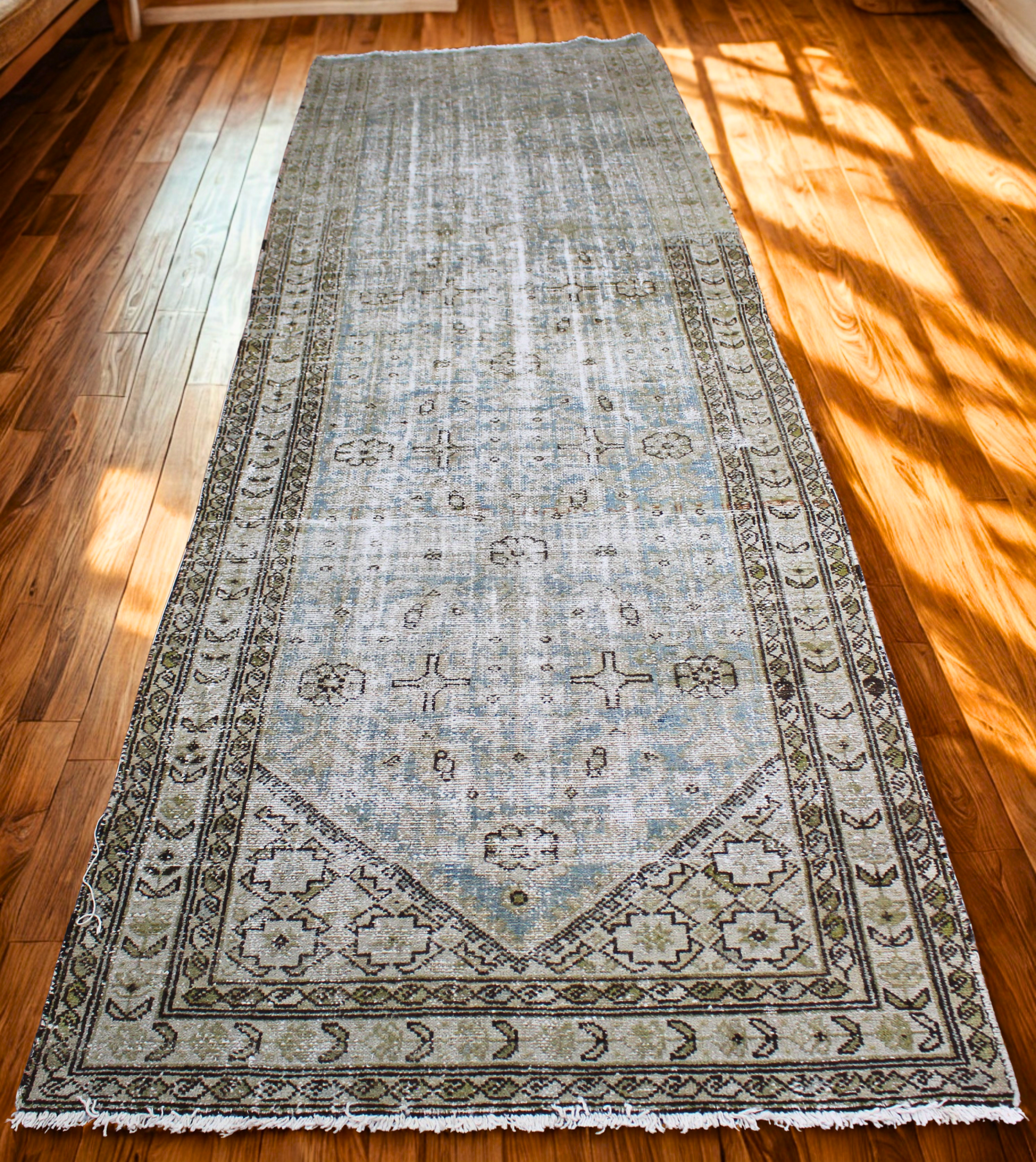 With its beautifully worn patina and muted blue-green palette, this antique Malayer runner (3.7 × 11.9 ft) tells its story through subtlety. The field is adorned with delicate floral motifs and soft latticework, framed by a detailed border with repeated rosettes and vine scrolls. Decades of gentle fading have created a watercolor effect, giving the rug an ethereal, almost ghostlike charm that only time can bestow.