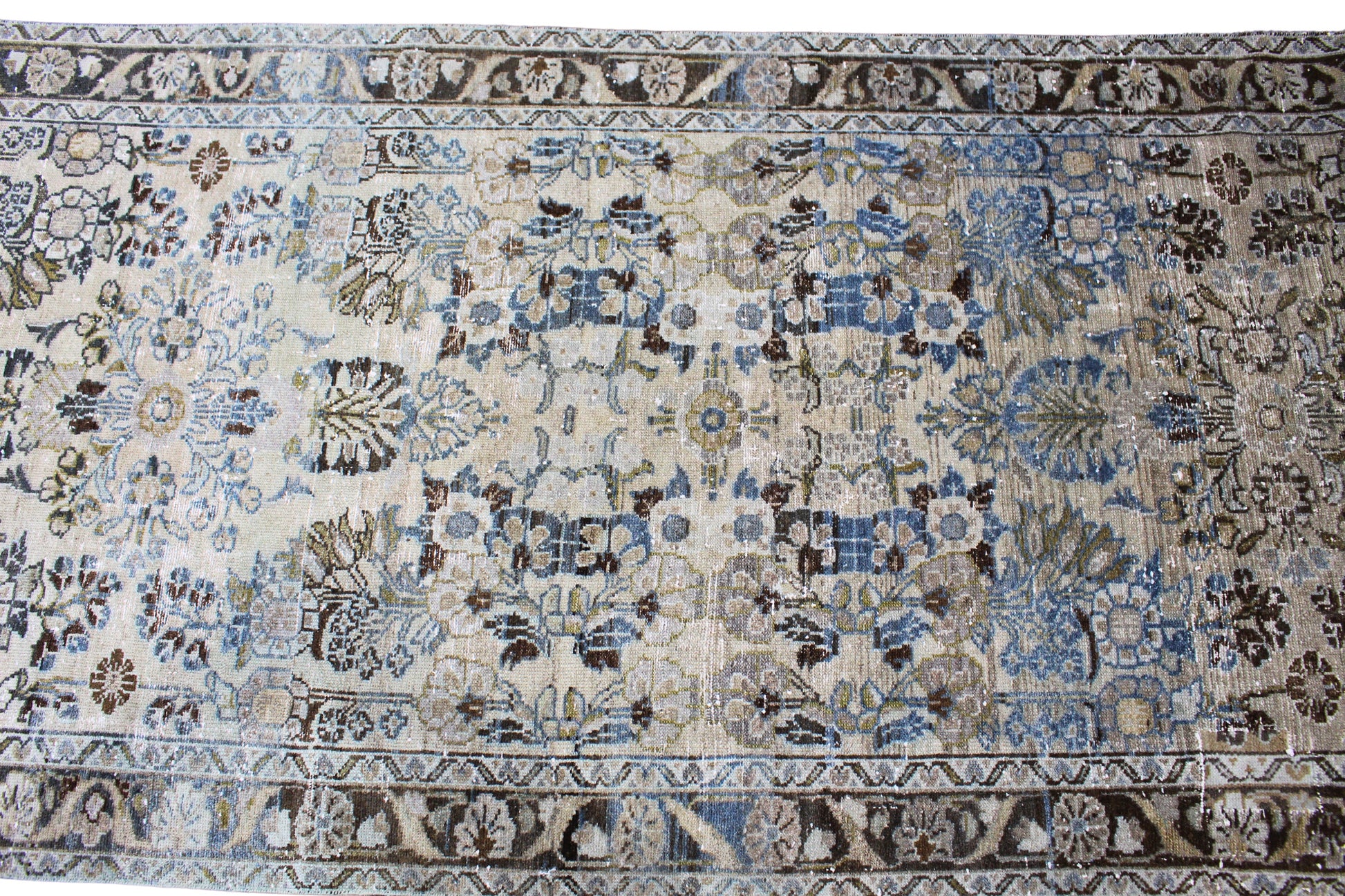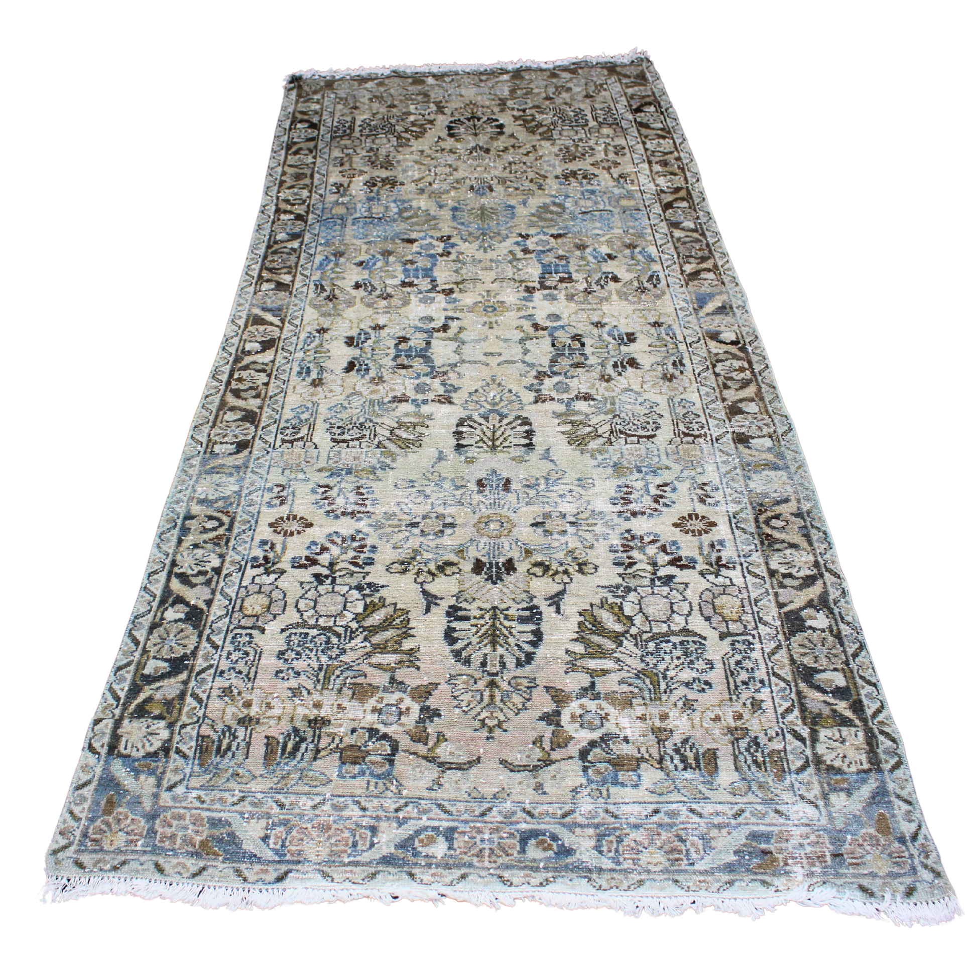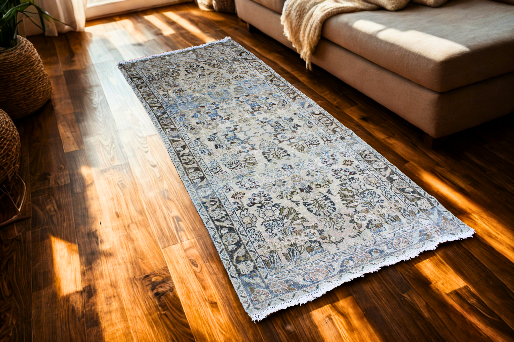 Subtle sophistication defines this antique Malayer rug (3.10 × 9.7 ft), featuring a gracefully timeworn field of floral rosettes and vine-scrolls woven in pale slate blue, misty taupe, soft ivory, and delicate hints of olive. Its low pile and gentle abrash reflect decades of natural aging, making it not just a floor covering but a quiet storyteller of Persian village craftsmanship.