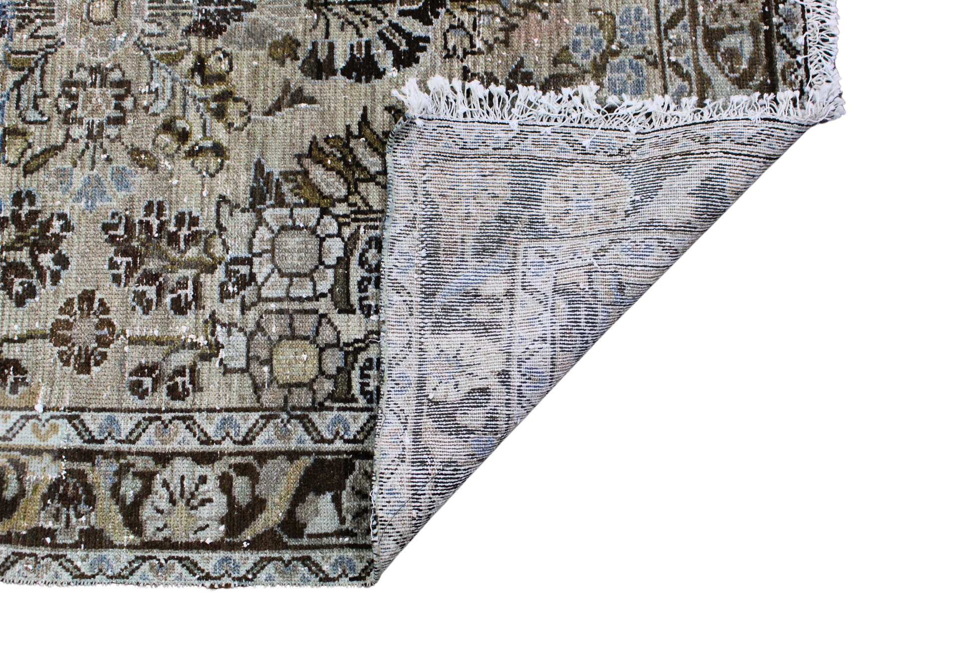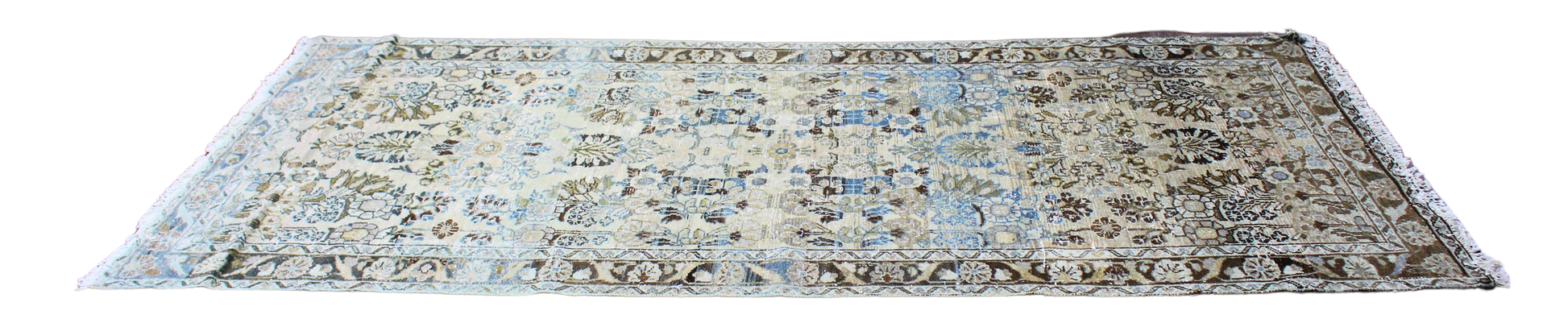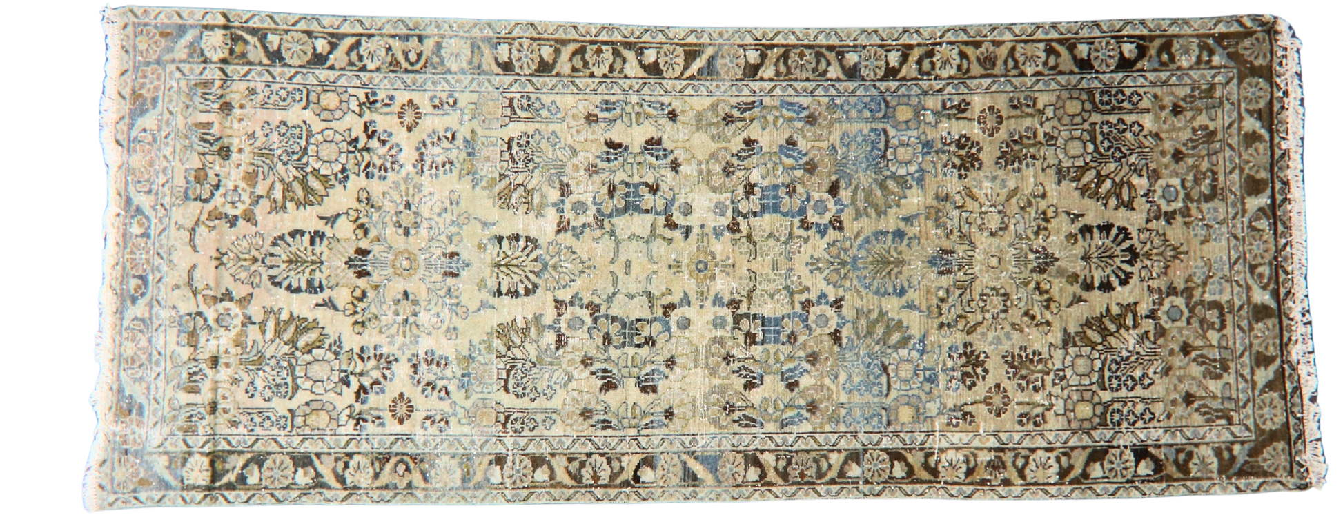 Subtle sophistication defines this antique Malayer rug (3.10 × 9.7 ft), featuring a gracefully timeworn field of floral rosettes and vine-scrolls woven in pale slate blue, misty taupe, soft ivory, and delicate hints of olive. Its low pile and gentle abrash reflect decades of natural aging, making it not just a floor covering but a quiet storyteller of Persian village craftsmanship.