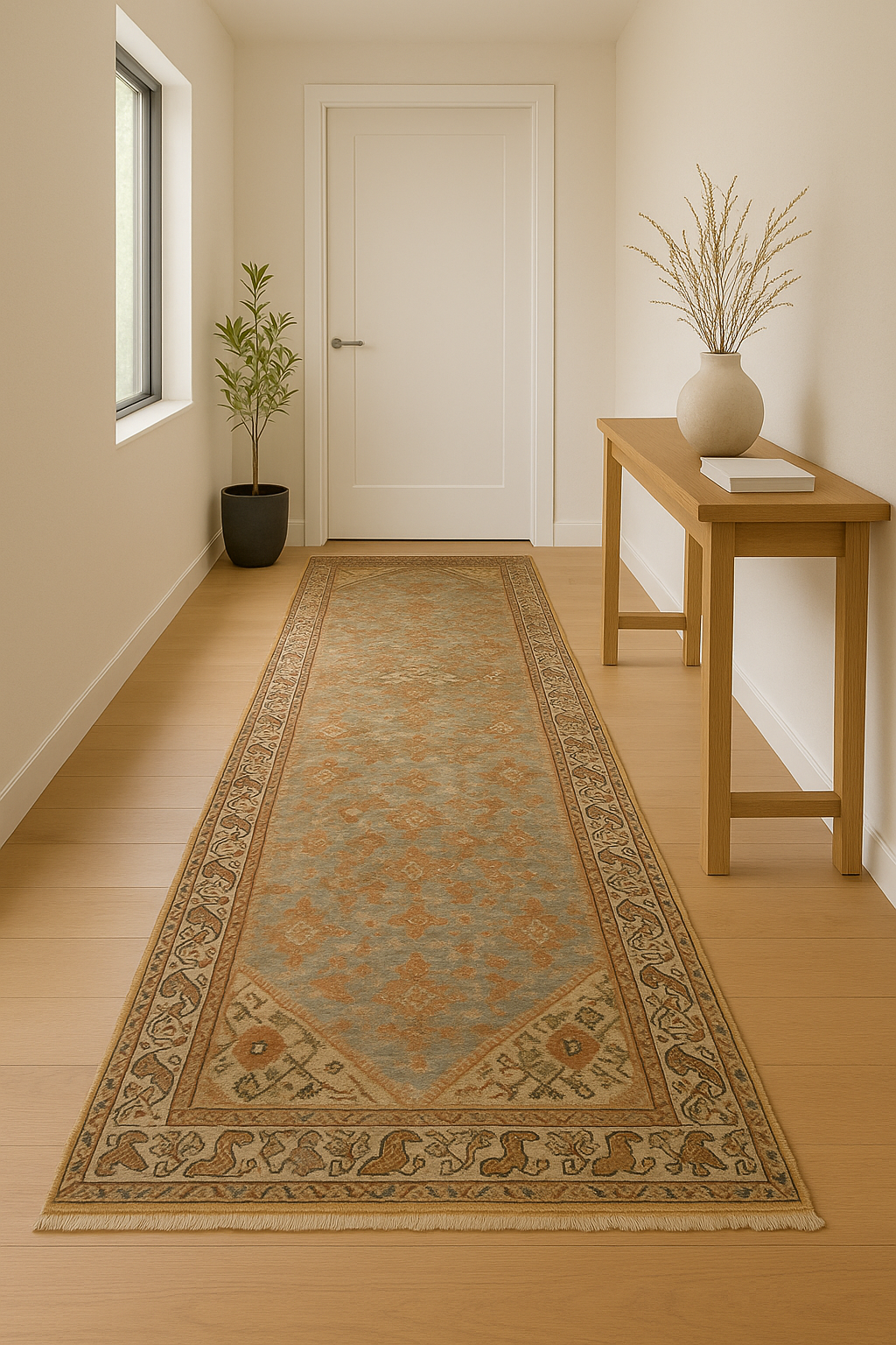 What truly sets this piece apart is its remarkable border — filled with stylized animal figures and angular motifs in warm earth tones, lending a playful folkloric energy to an otherwise restrained composition. The camel-tone spandrels at each end draw attention to the finely tapered shape, ideal for creating depth and flow in a corridor or long gallery.