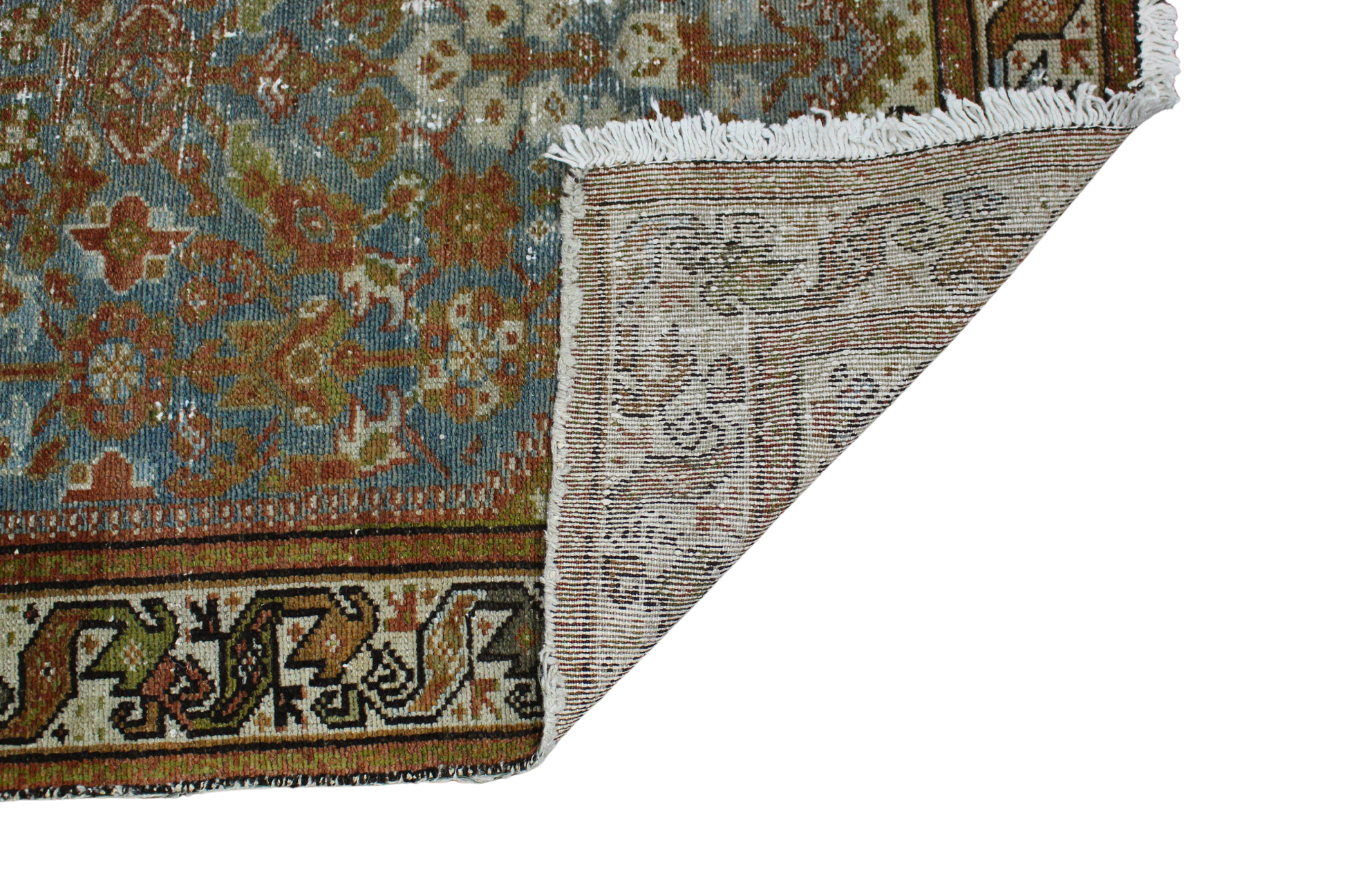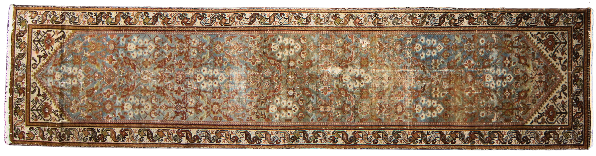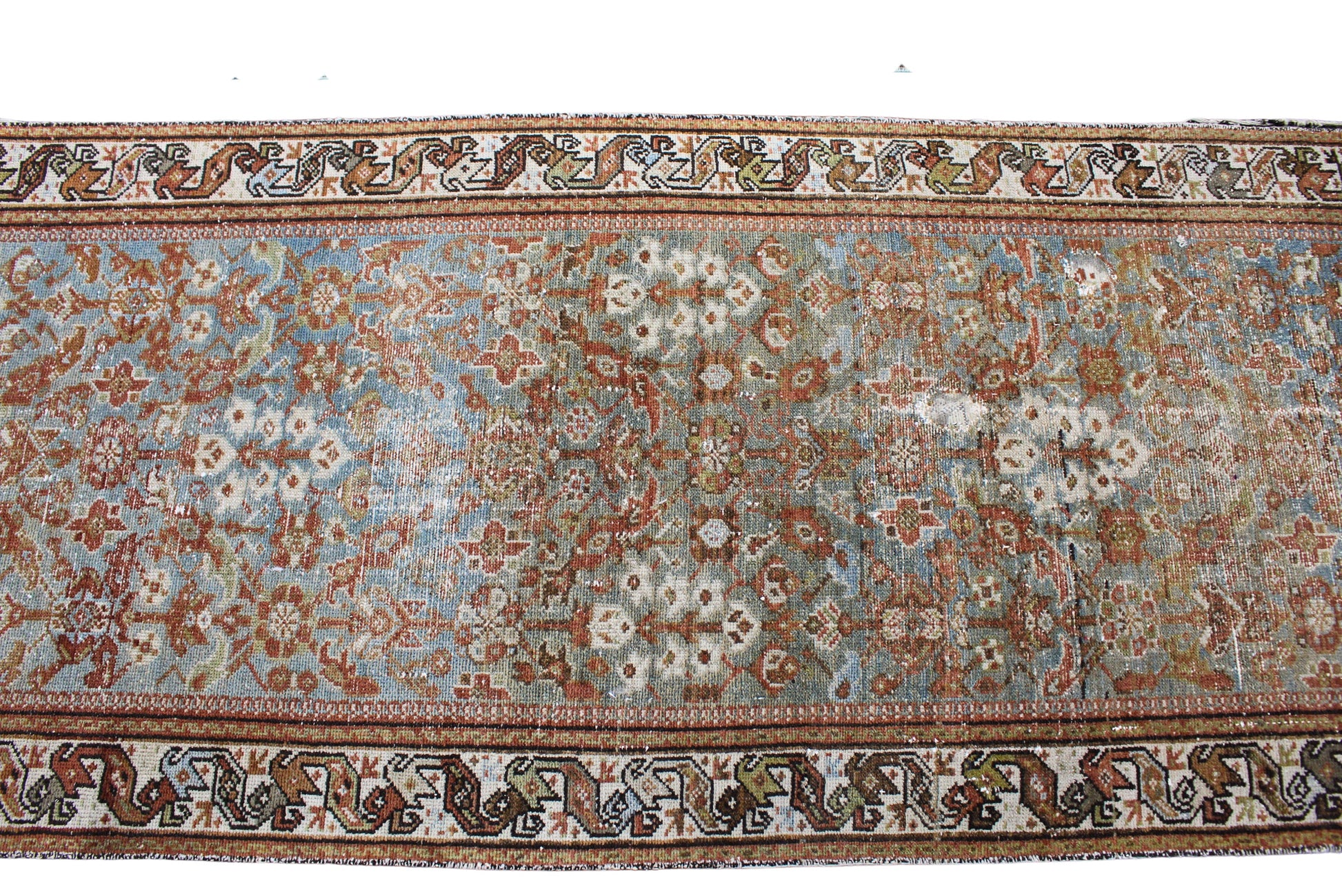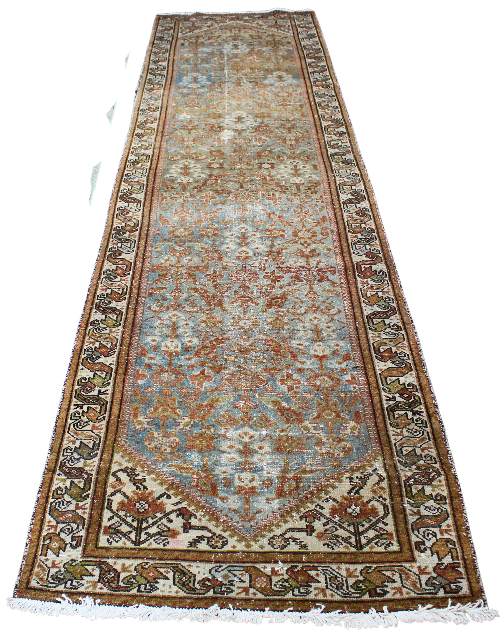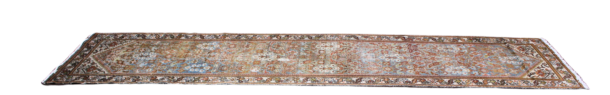 Worn to perfection, this antique Persian Malayer runner (3.3 × 13.6 ft) is a masterclass in muted elegance. A soft wash of sky blue and terracotta forms the ground for an intricate all-over floral and vine design, with delicate rosettes and leafy tendrils flowing from end to end. The age-softened pile, with areas of gentle wear, adds to the runner's ethereal, timeworn charm.