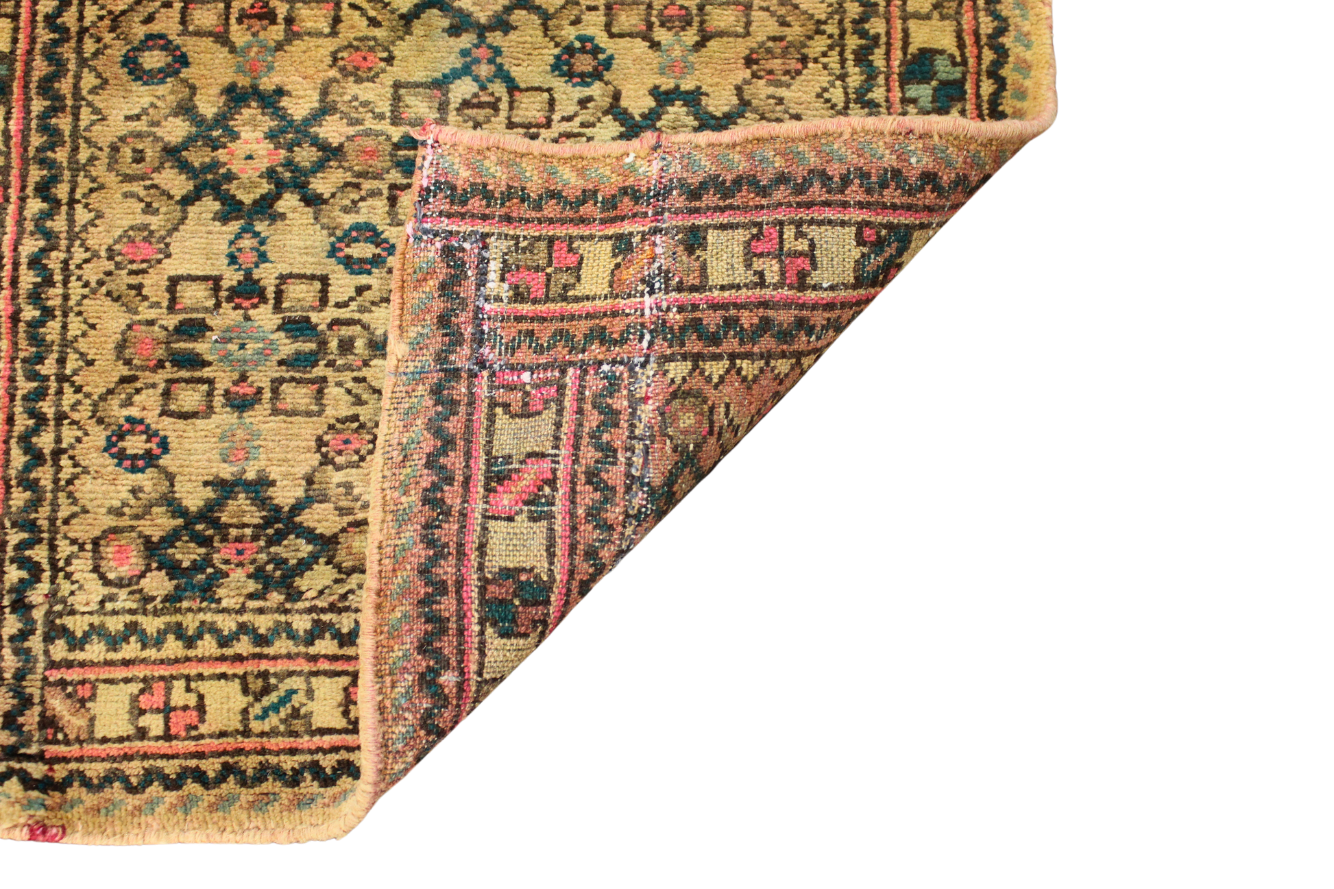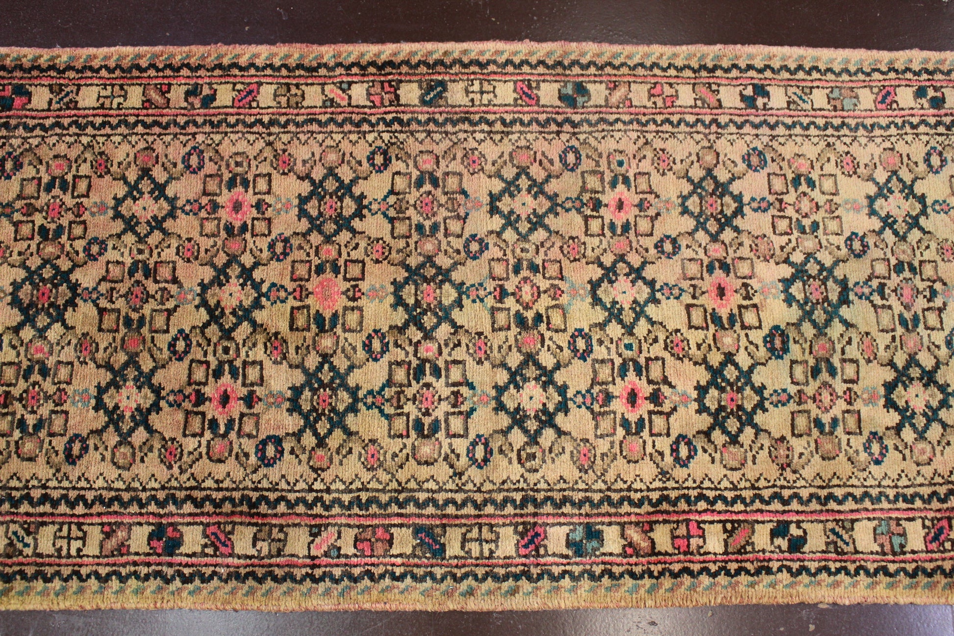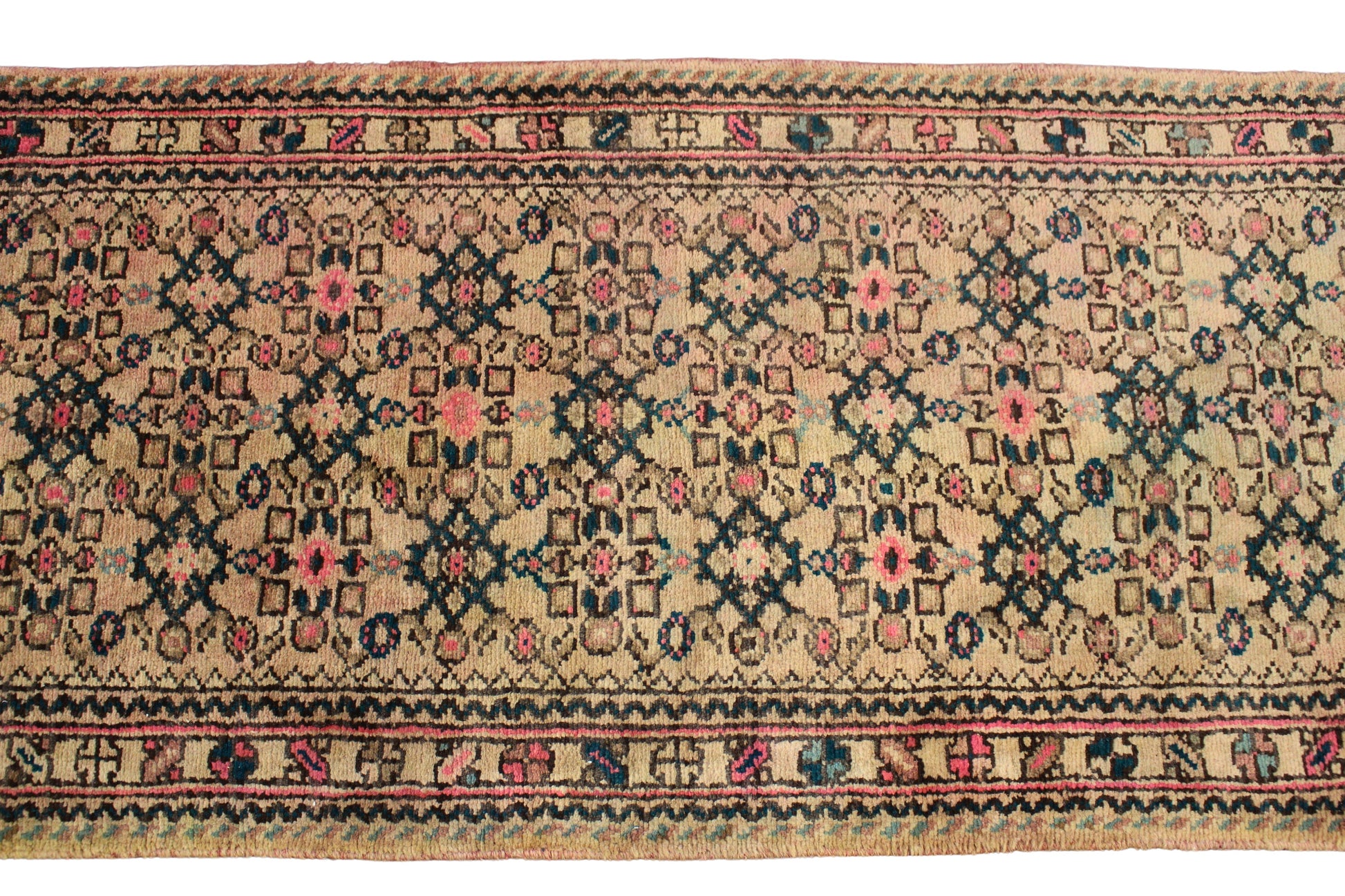 This slender antique Hamedan runner (2.4 × 9.4 ft) embodies a quiet elegance with its muted rose, cream, and deep teal palette, woven into a lattice of stylized floral rosettes and linked diamond motifs. The field is softened by years of age, giving the wool pile a powdery, timeworn finish that enhances its antique charm.