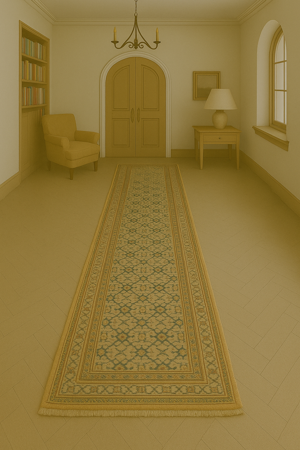 Framed by ivory-toned borders filled with petite geometric blossoms, the rug strikes a delicate balance between symmetry and softness. Its proportions make it ideal for refined hallways, narrow foyers, or alongside a bed, adding a layer of history and subtle color.