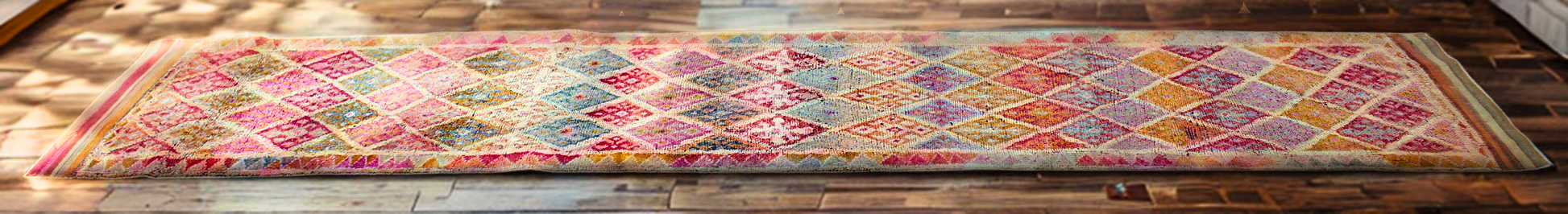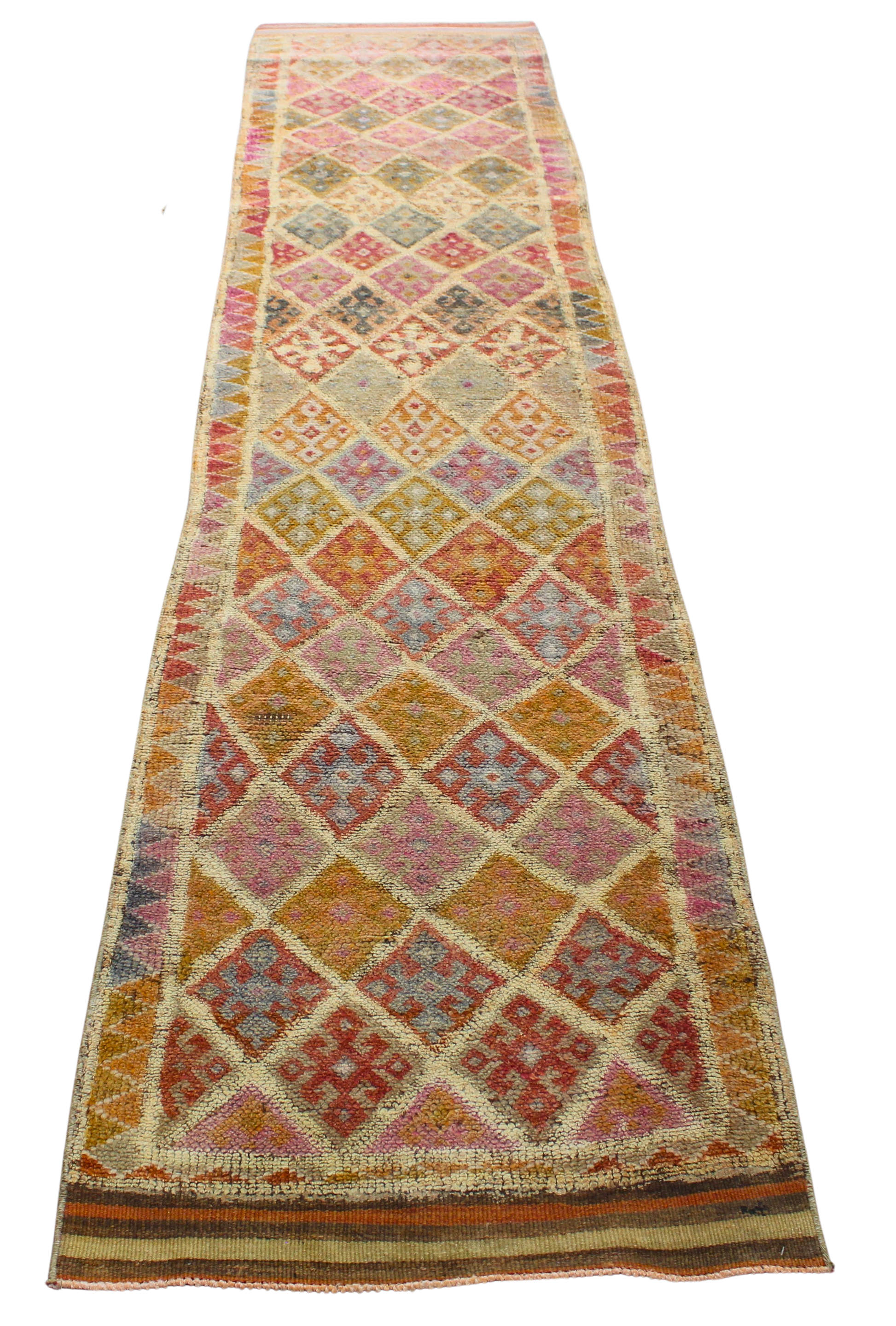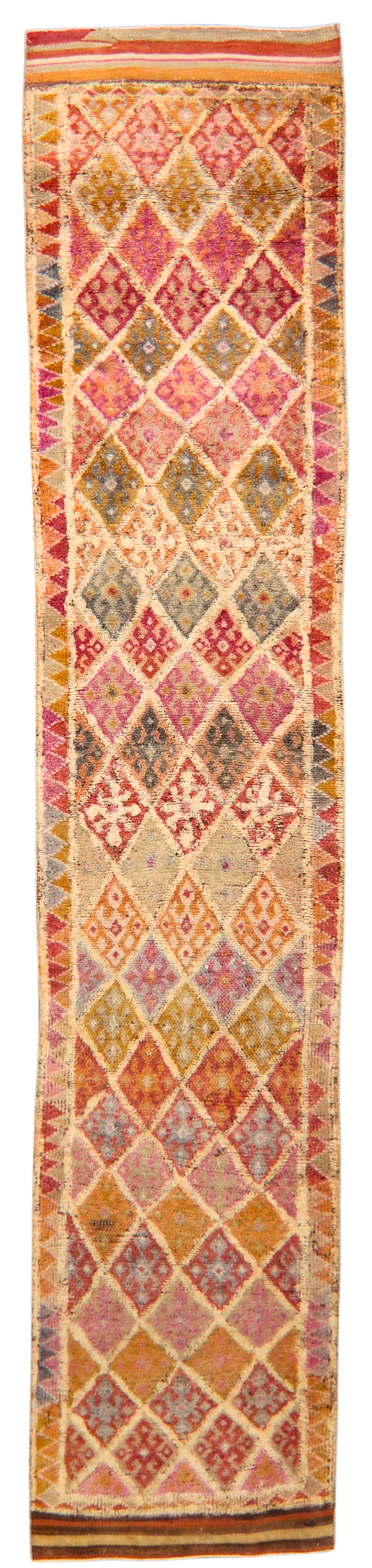 Brimming with charm and saturated in jewel tones, this antique Turkish Oushak runner (2.7 × 12 ft) is a visual celebration of Anatolian folk artistry. The allover lattice of hooked diamonds is filled with lively geometric and floral accents, each one slightly varied, echoing the hand of its maker. A wide array of faded colors — coral, rose, soft orange, gold, sky blue, ivory, and mauve — interweave across the field with a sense of improvisational joy.