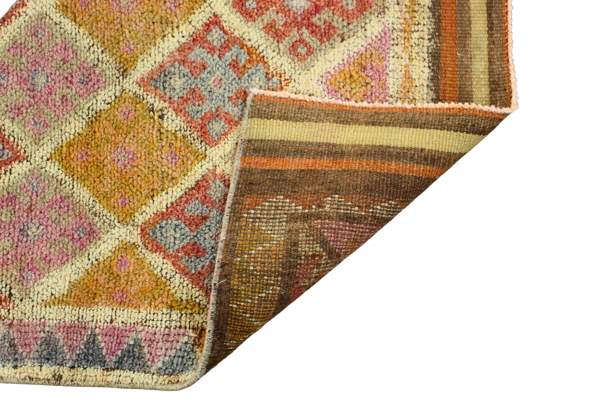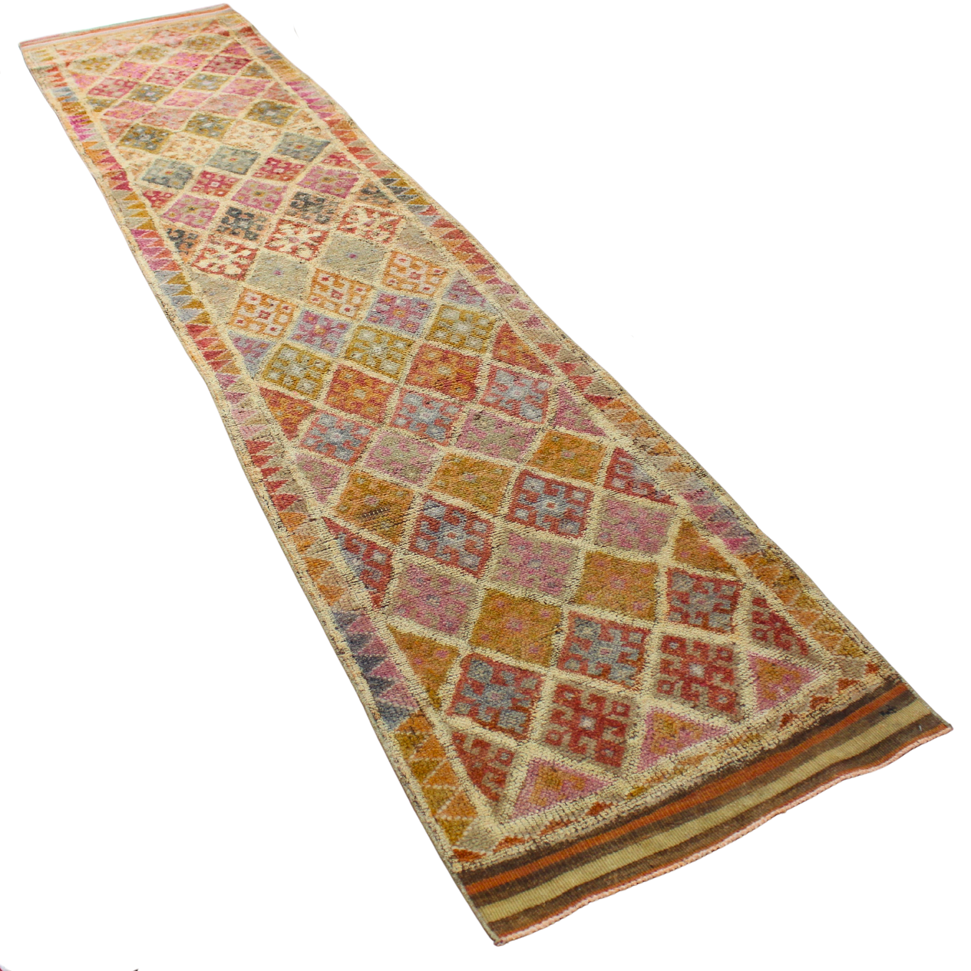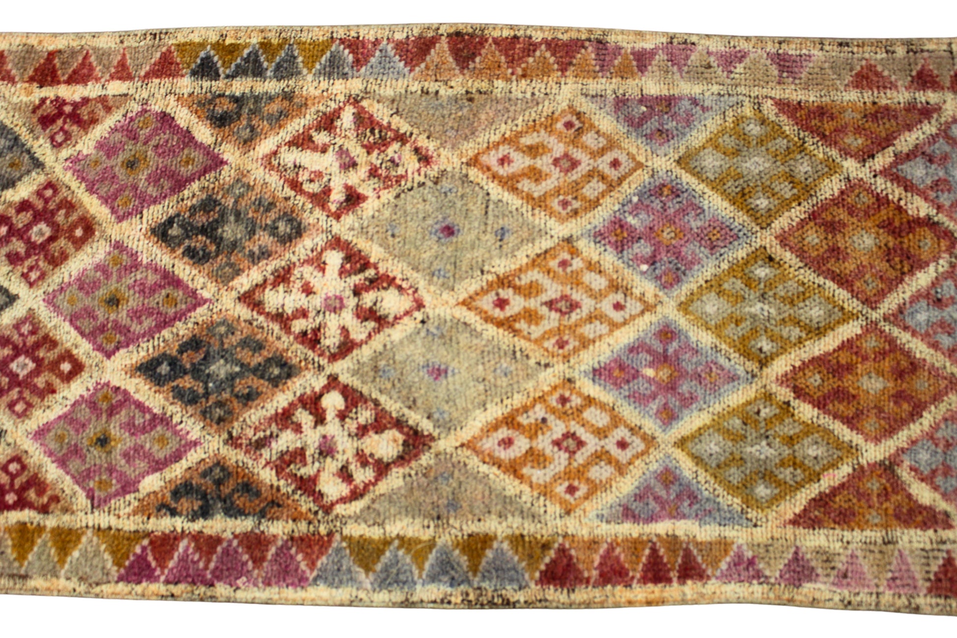 Brimming with charm and saturated in jewel tones, this antique Turkish Oushak runner (2.7 × 12 ft) is a visual celebration of Anatolian folk artistry. The allover lattice of hooked diamonds is filled with lively geometric and floral accents, each one slightly varied, echoing the hand of its maker. A wide array of faded colors — coral, rose, soft orange, gold, sky blue, ivory, and mauve — interweave across the field with a sense of improvisational joy.