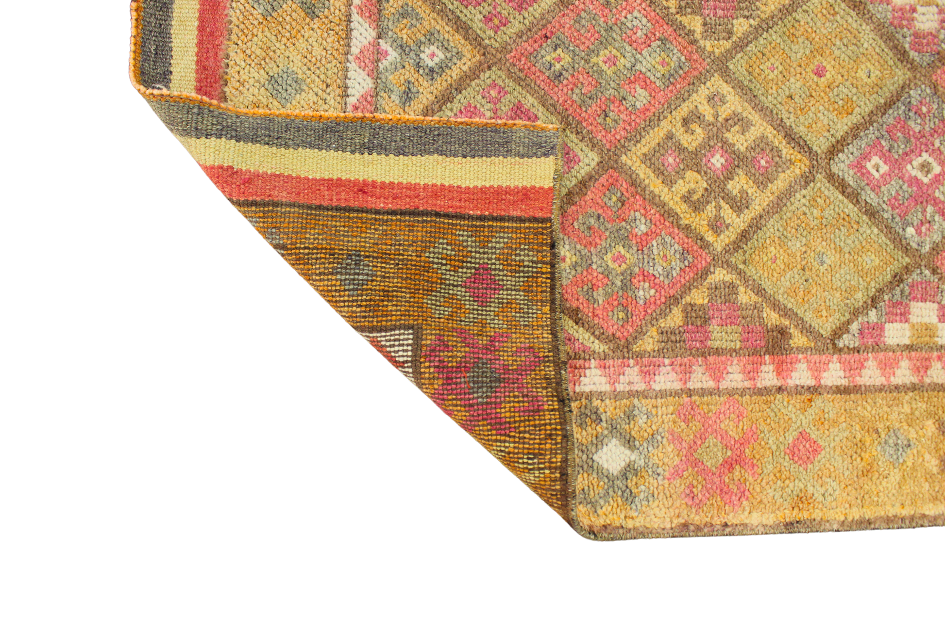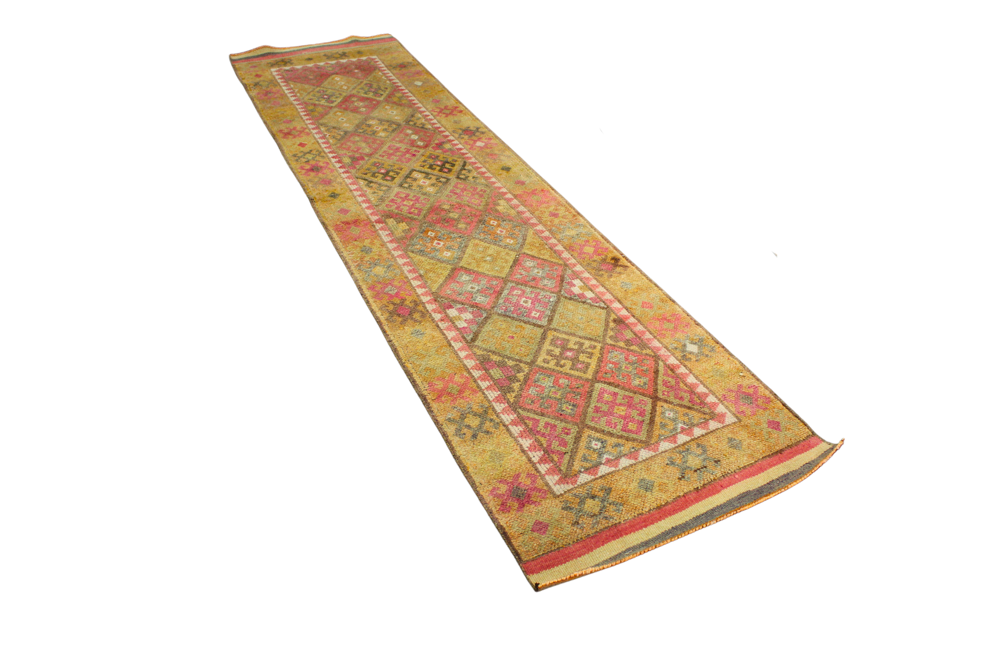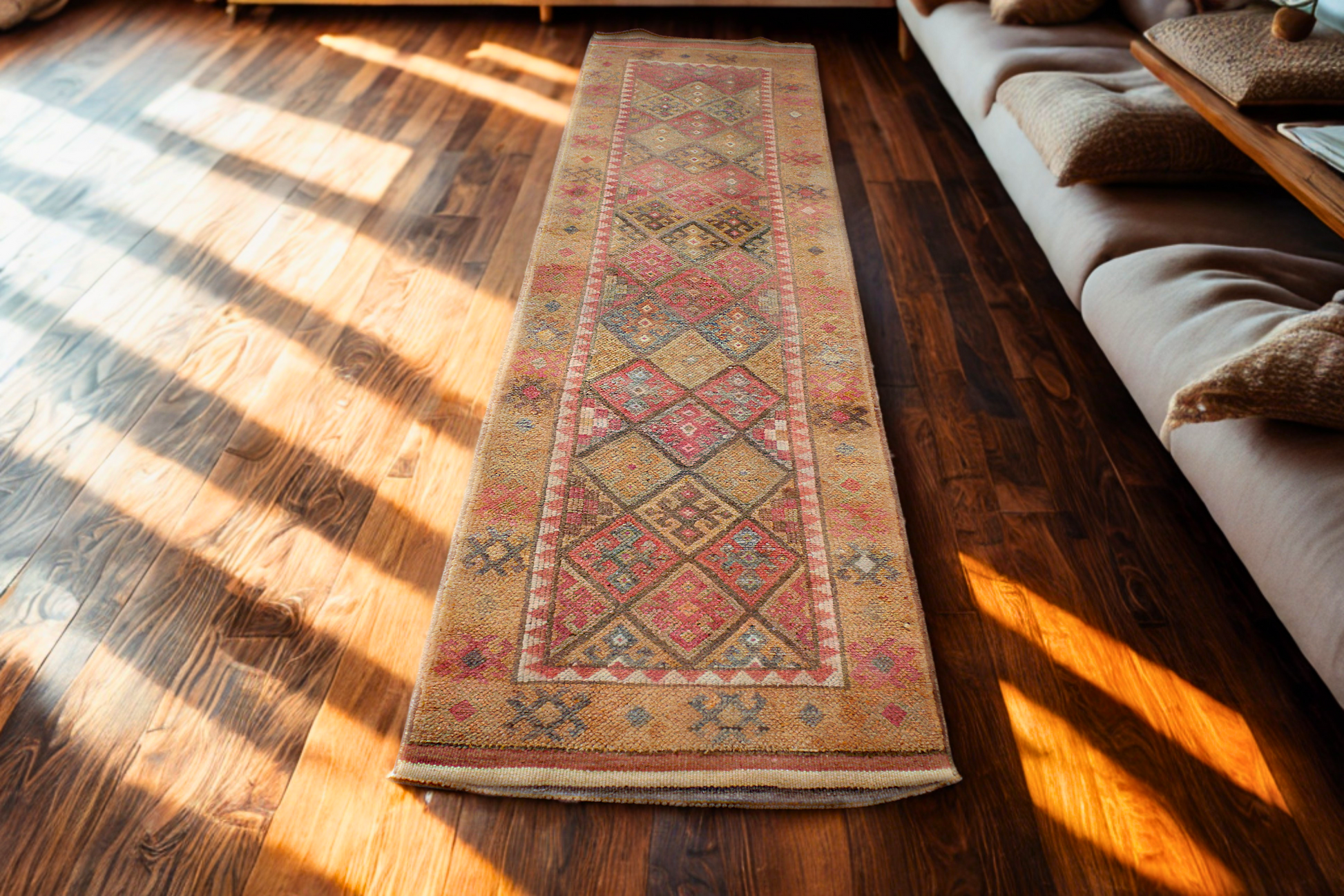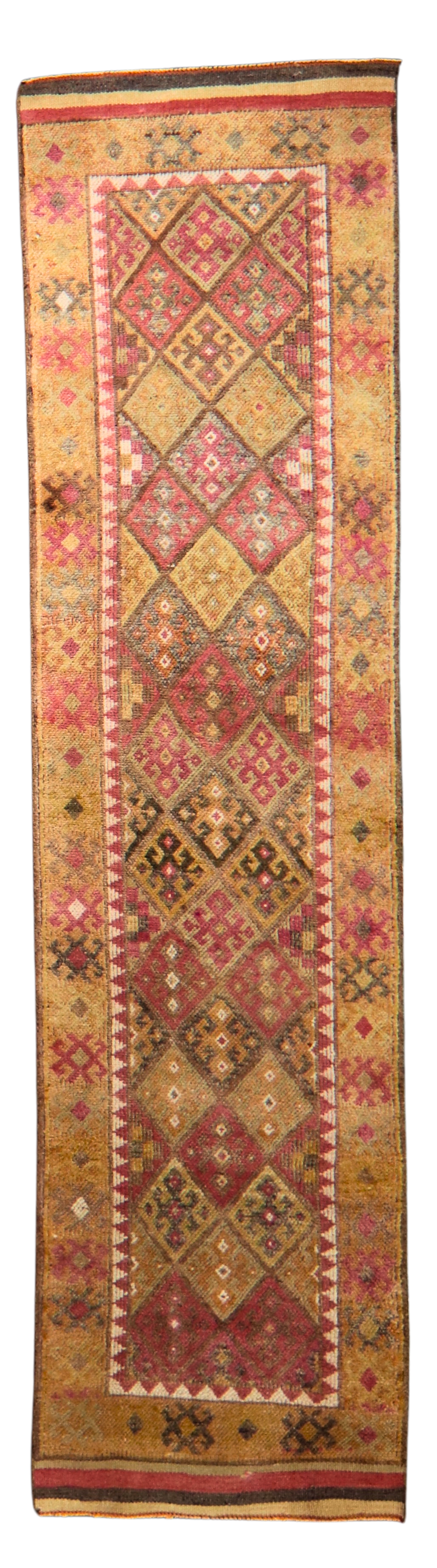 This antique Turkish Oushak runner (2.9 × 10.7 ft) pulses with geometric vitality and time-softened earth tones. A dynamic lattice of hooked diamonds marches confidently down the center, each filled with hand-drawn tribal motifs in coral red, ochre, ivory, faded indigo, and soft walnut. The deep camel-toned border, peppered with scattered motifs, frames the central field with grounded symmetry and casual elegance.