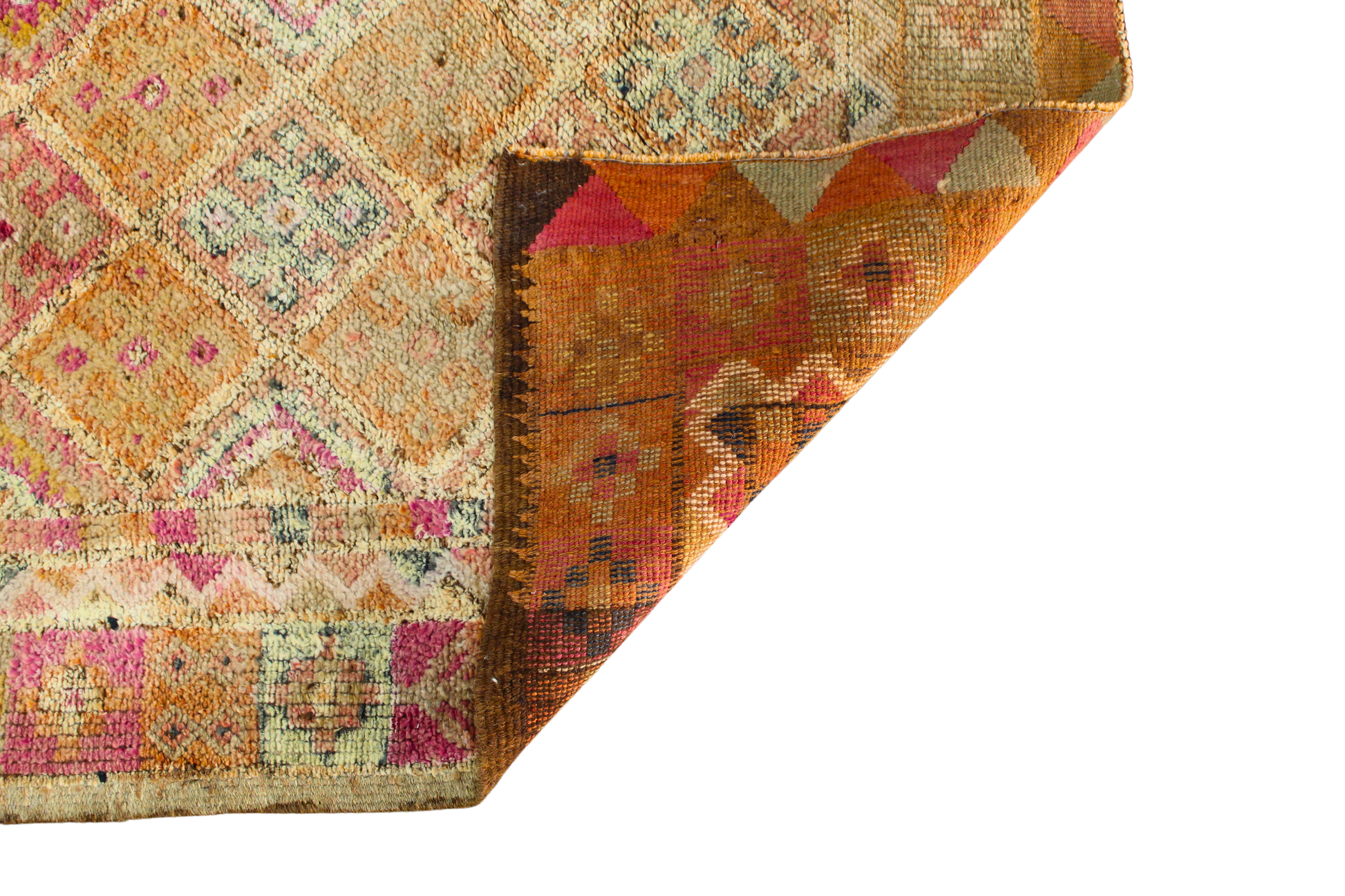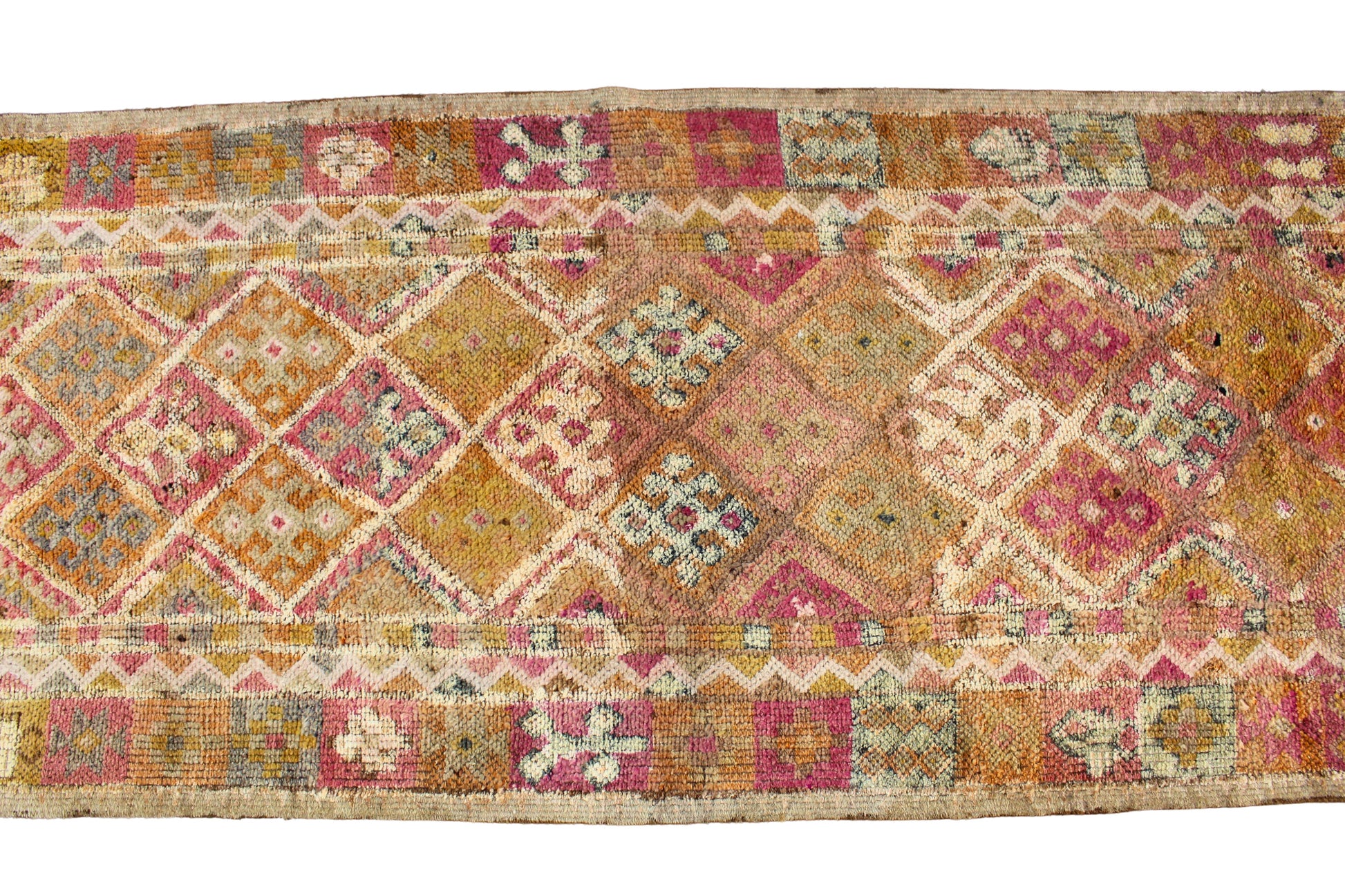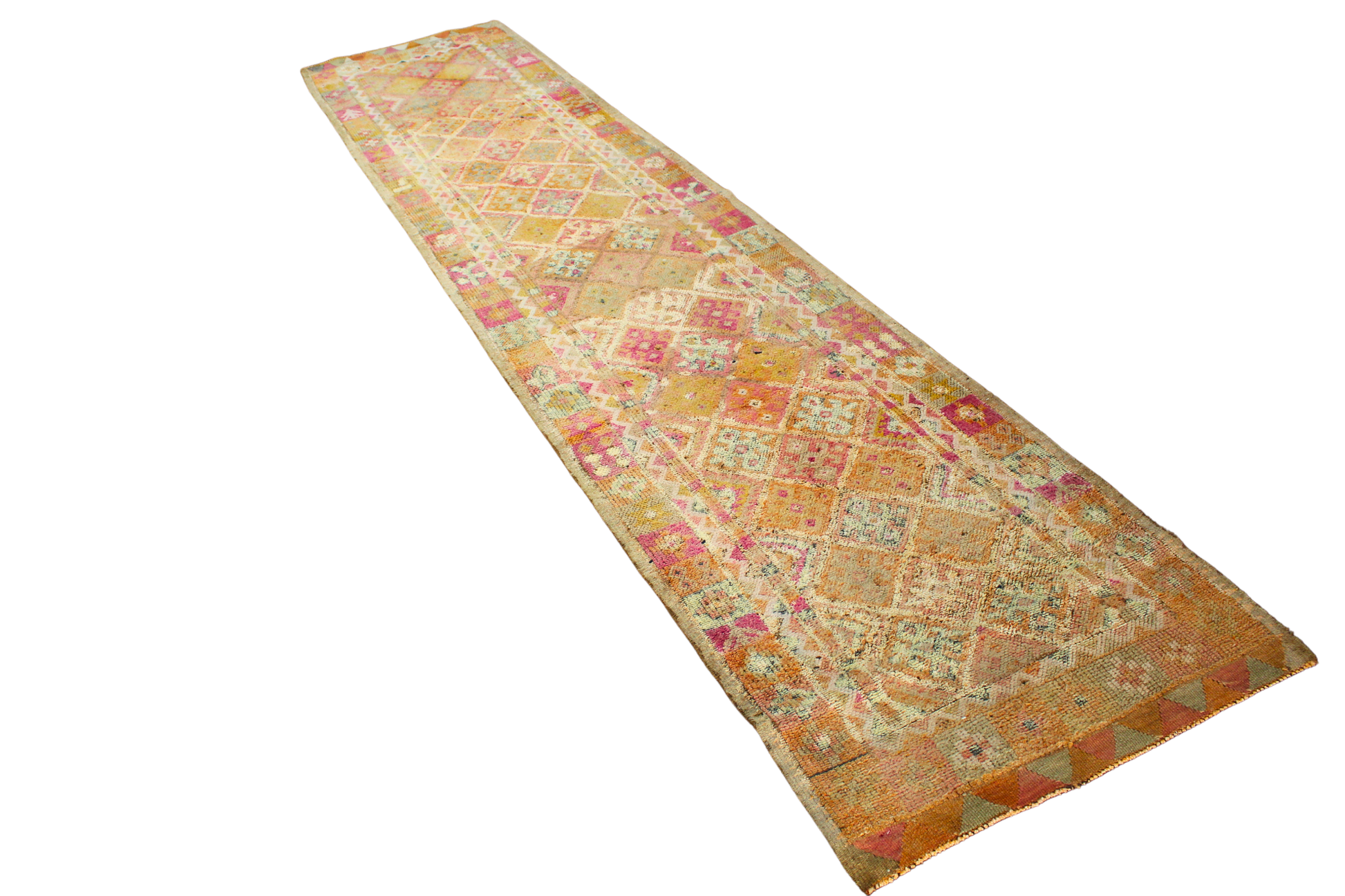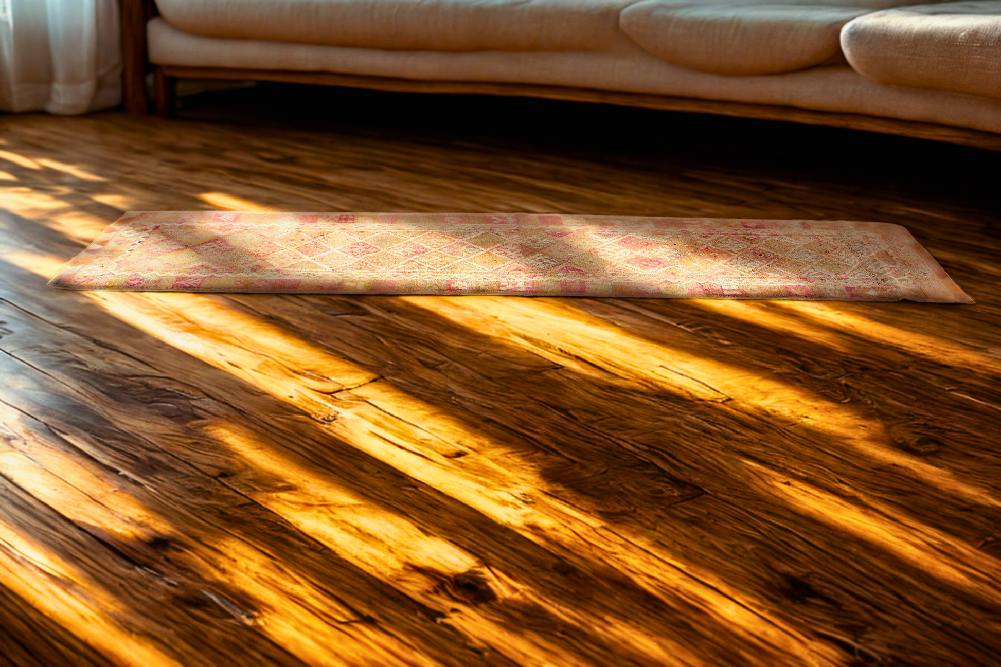 The saturated palette and crisply defined central medallions evoke regal elegance, while the flower-filled border—encircling the rug like a garland—adds charm and rhythm. The wool pile is dense yet aged to a soft patina, highlighting the handmade character of this long-format piece.
