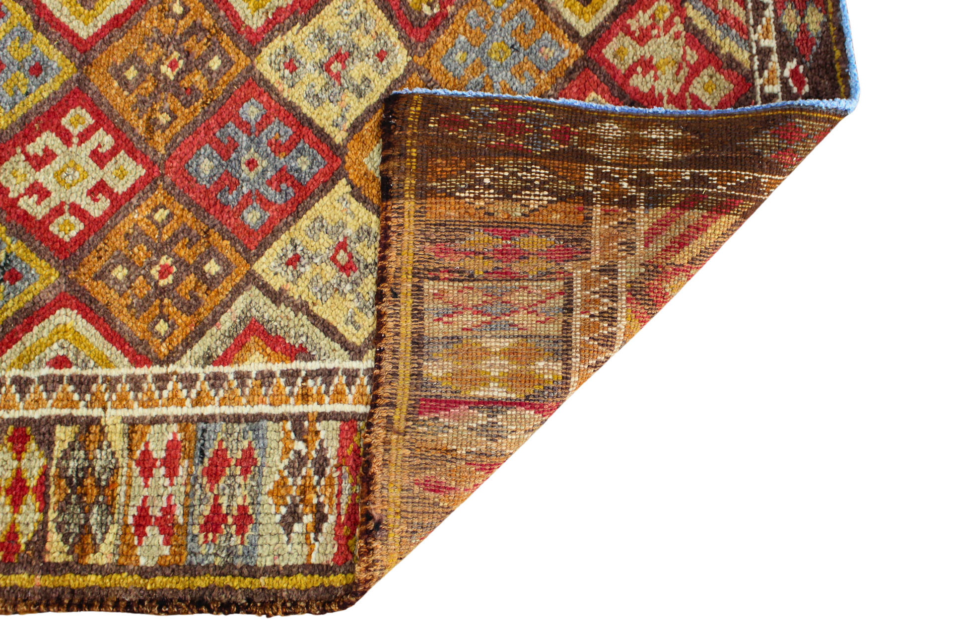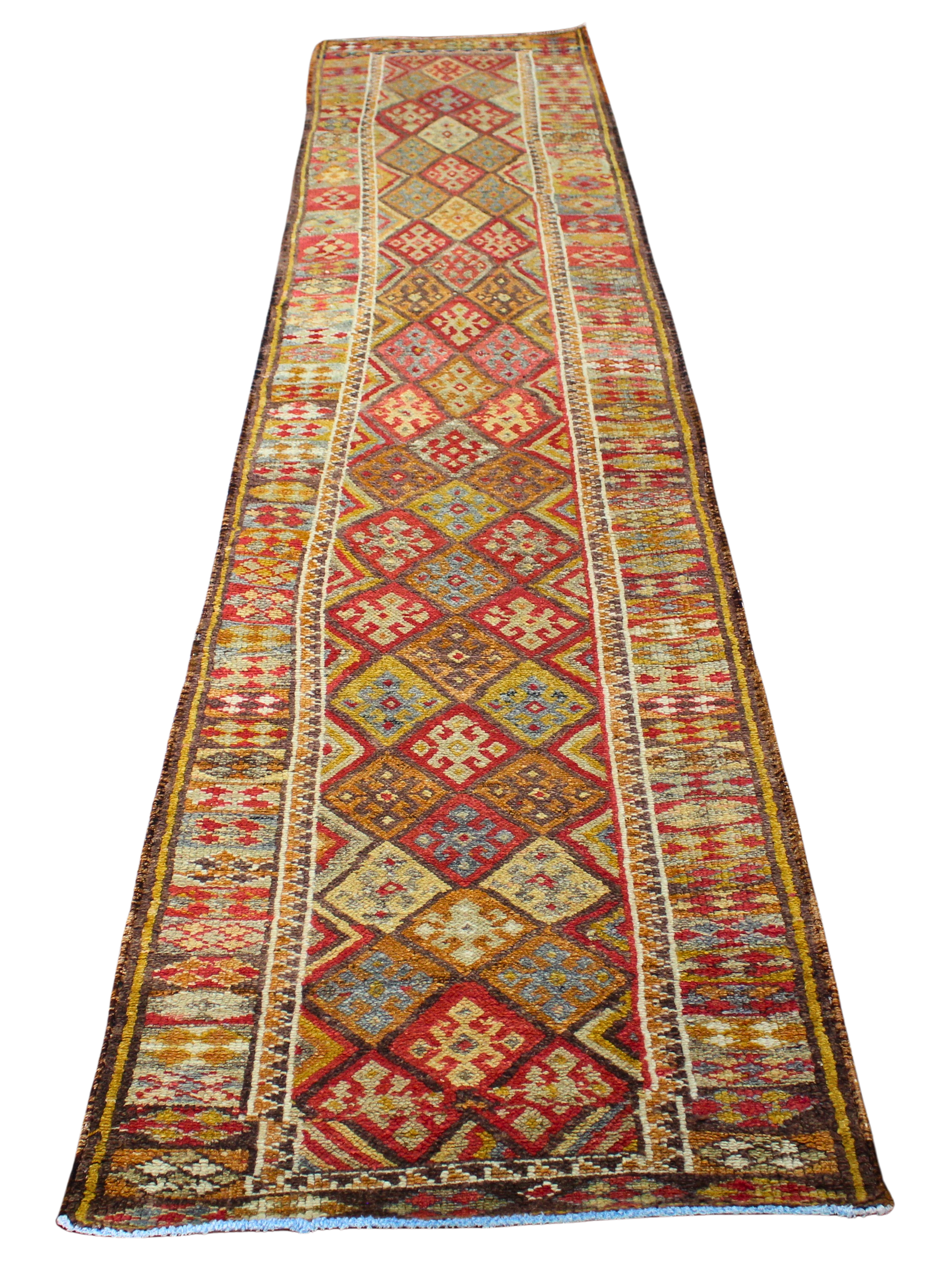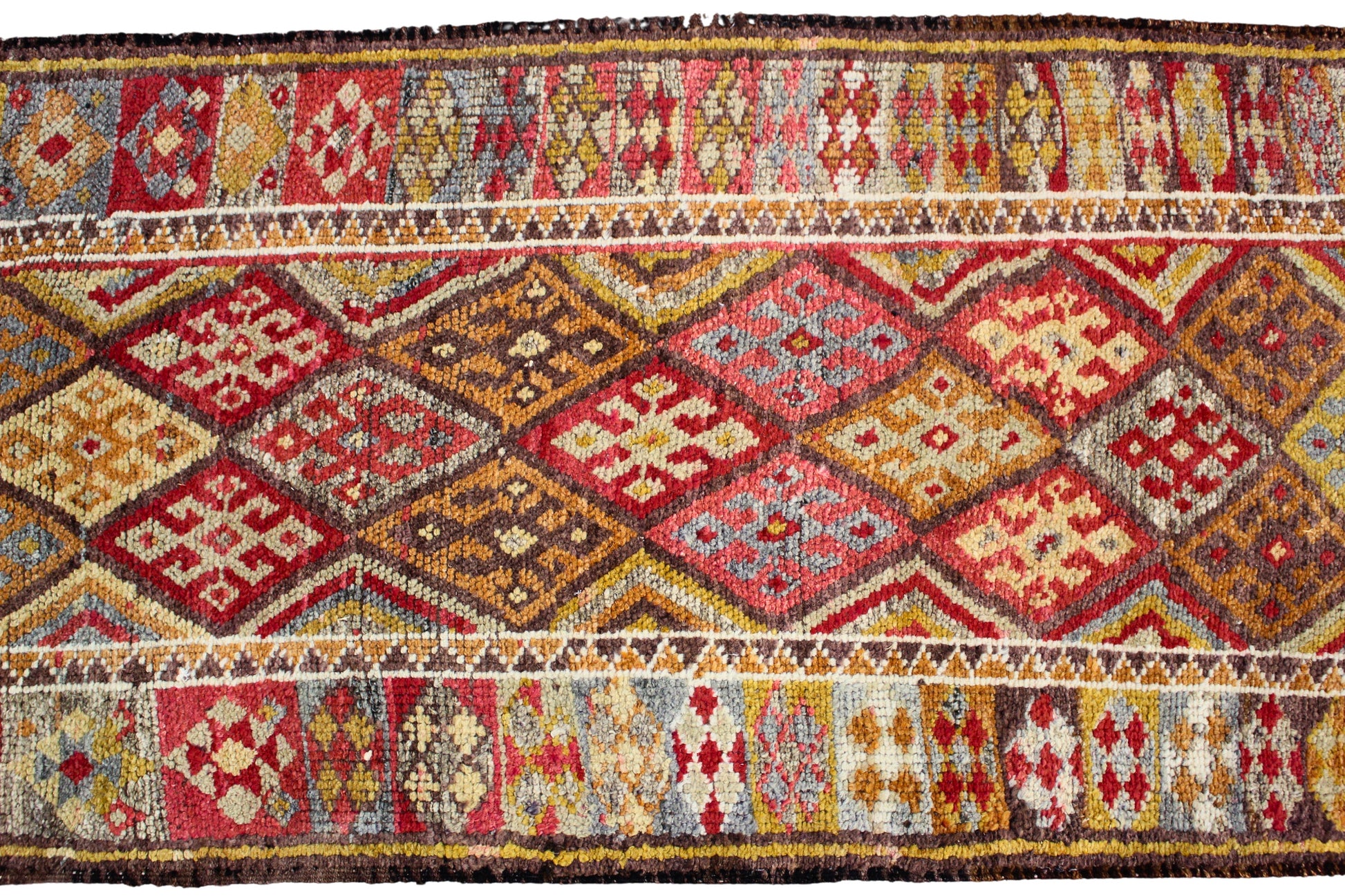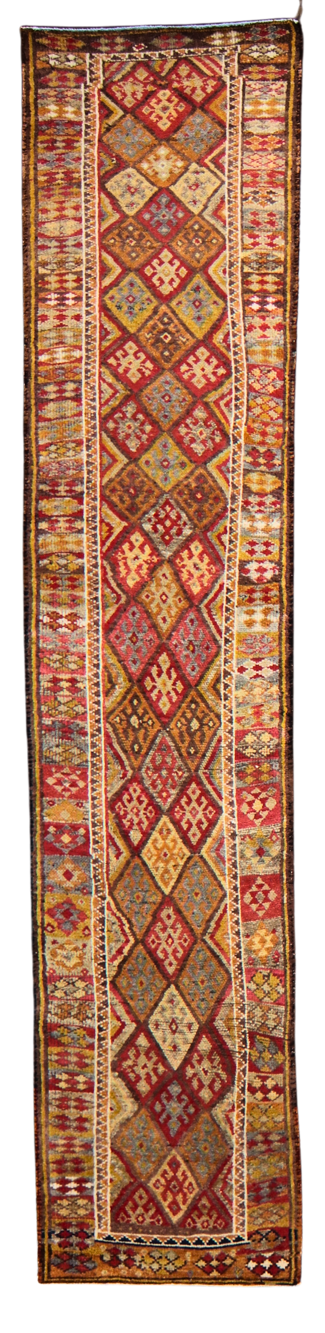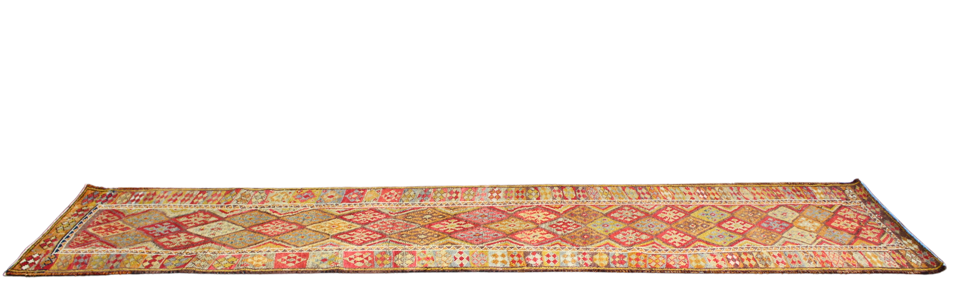 Bold, rhythmic, and full of movement, this antique Turkish Oushak runner (2.9 × 12.10 ft) is a striking example of tribal artistry from Anatolia. A long field of nested diamond motifs runs the length of the rug in vivid tones of brick red, burnt orange, ochre, and muted teal — each shape carrying its own distinct character, as if woven with purpose and storytelling.