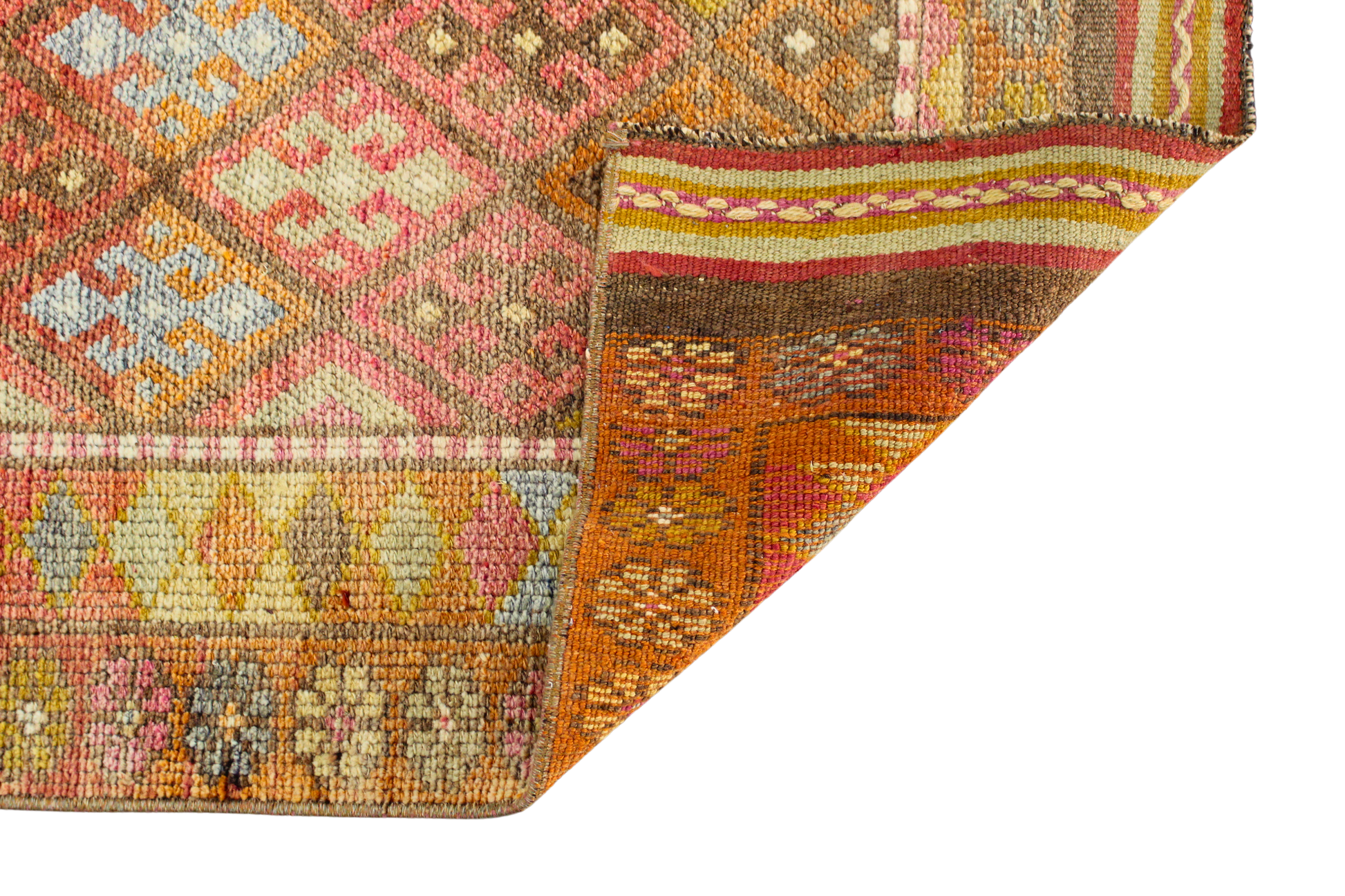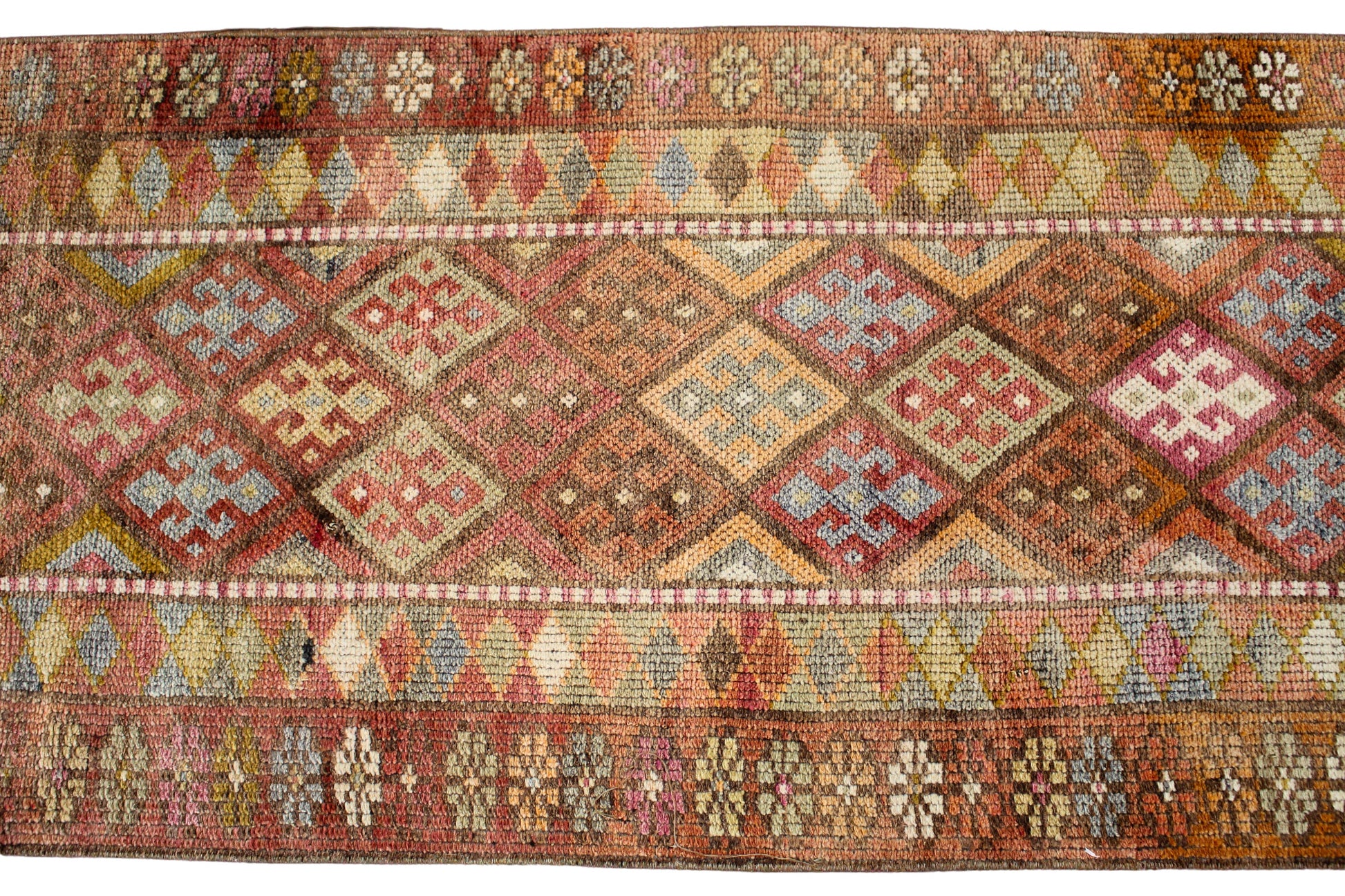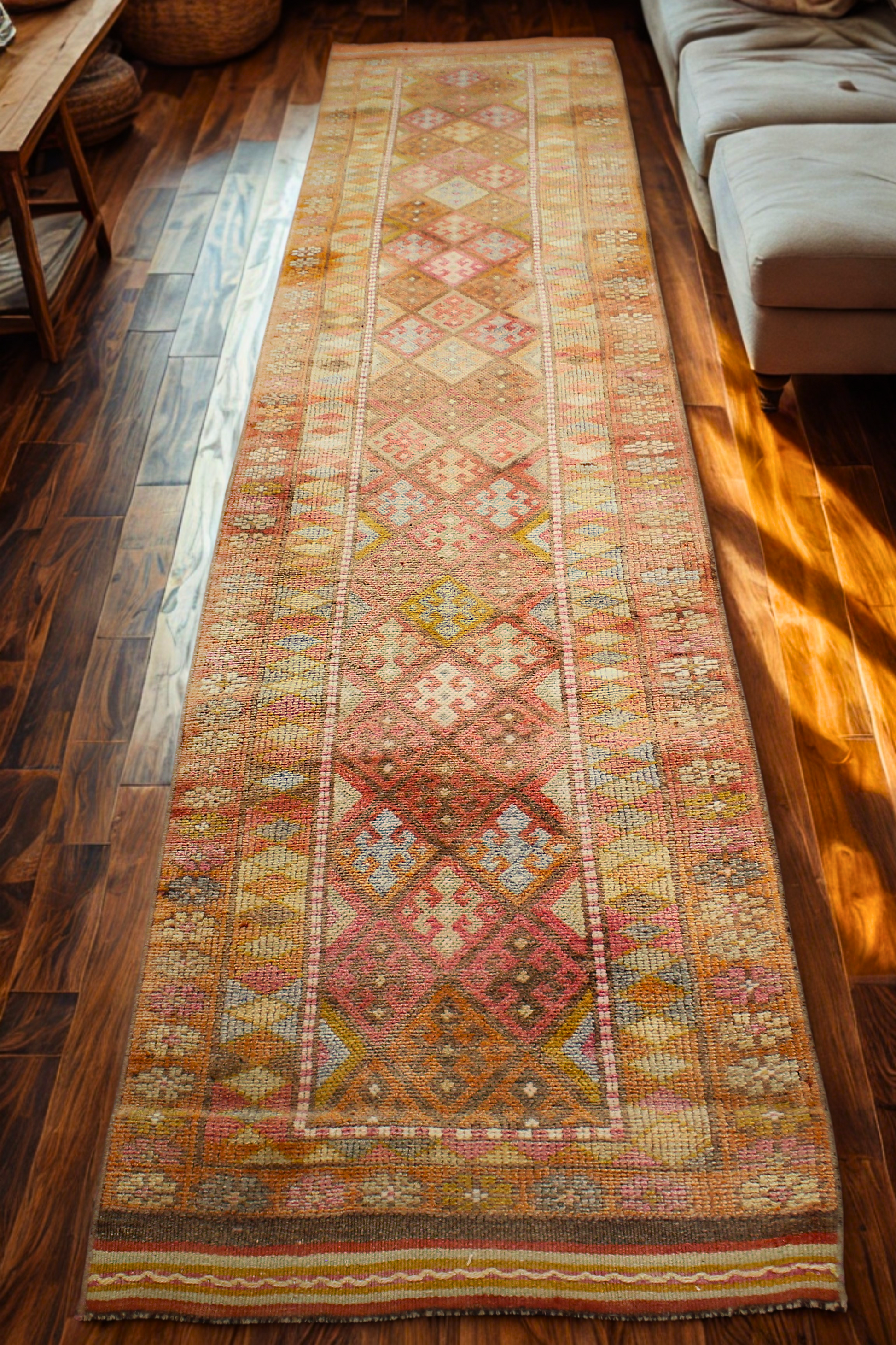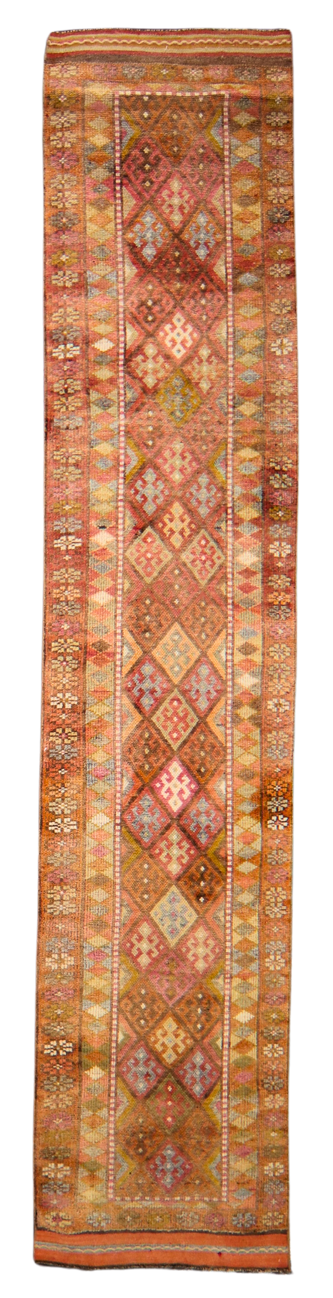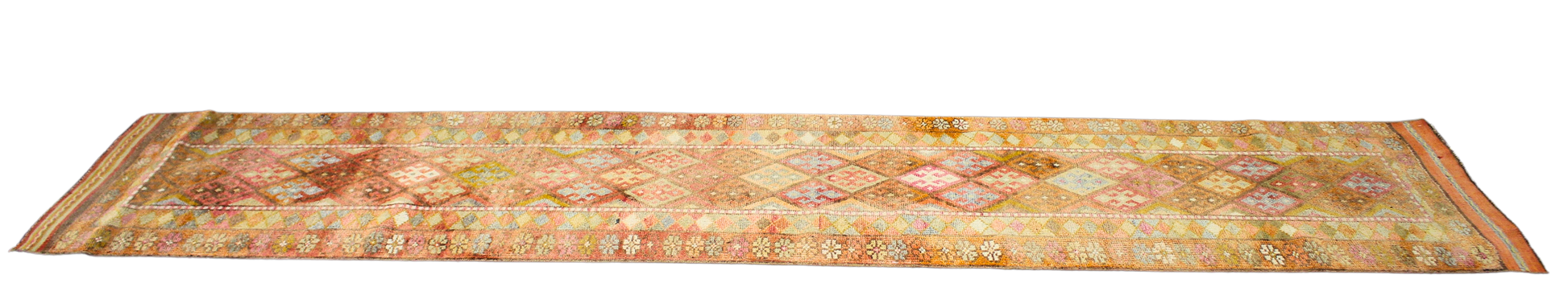 Infused with the natural hues of sun-warmed earth, this antique Turkish Oushak runner (2.8 × 12.8 ft) brings a softly aged elegance to any space. Its narrow field is filled with a rhythmic diamond lattice pattern, each lozenge rendered in a blend of terracotta, pale teal, faded ochre, salmon, and garnet — worn and mellowed by time.