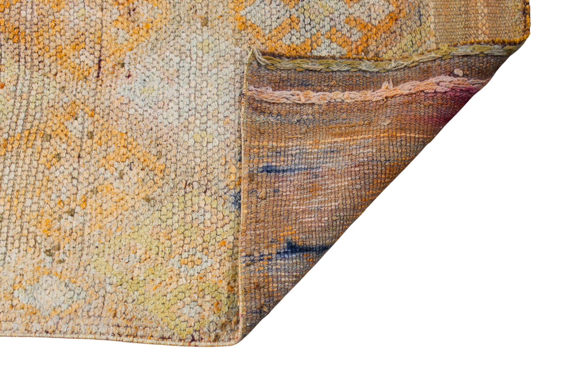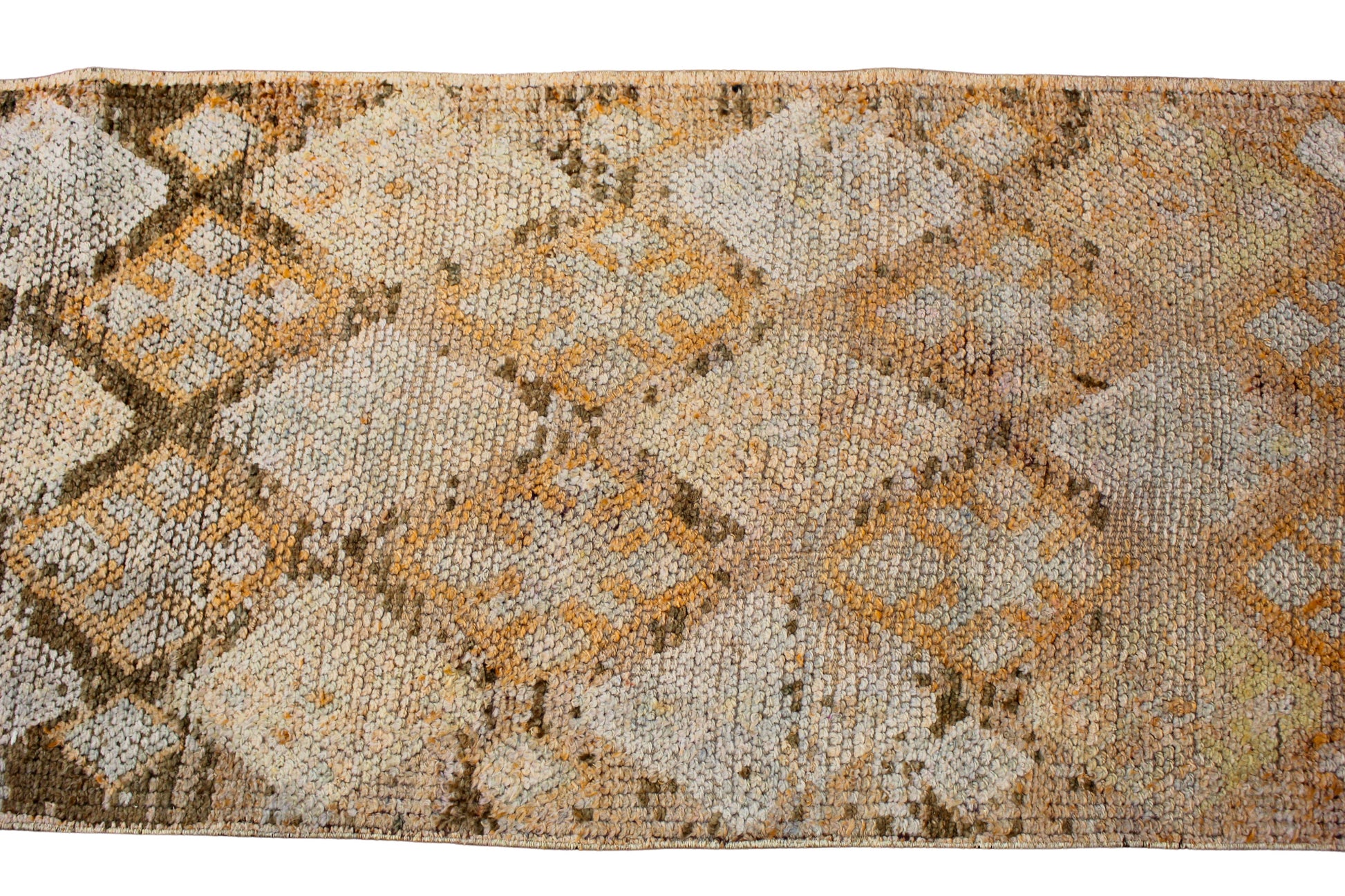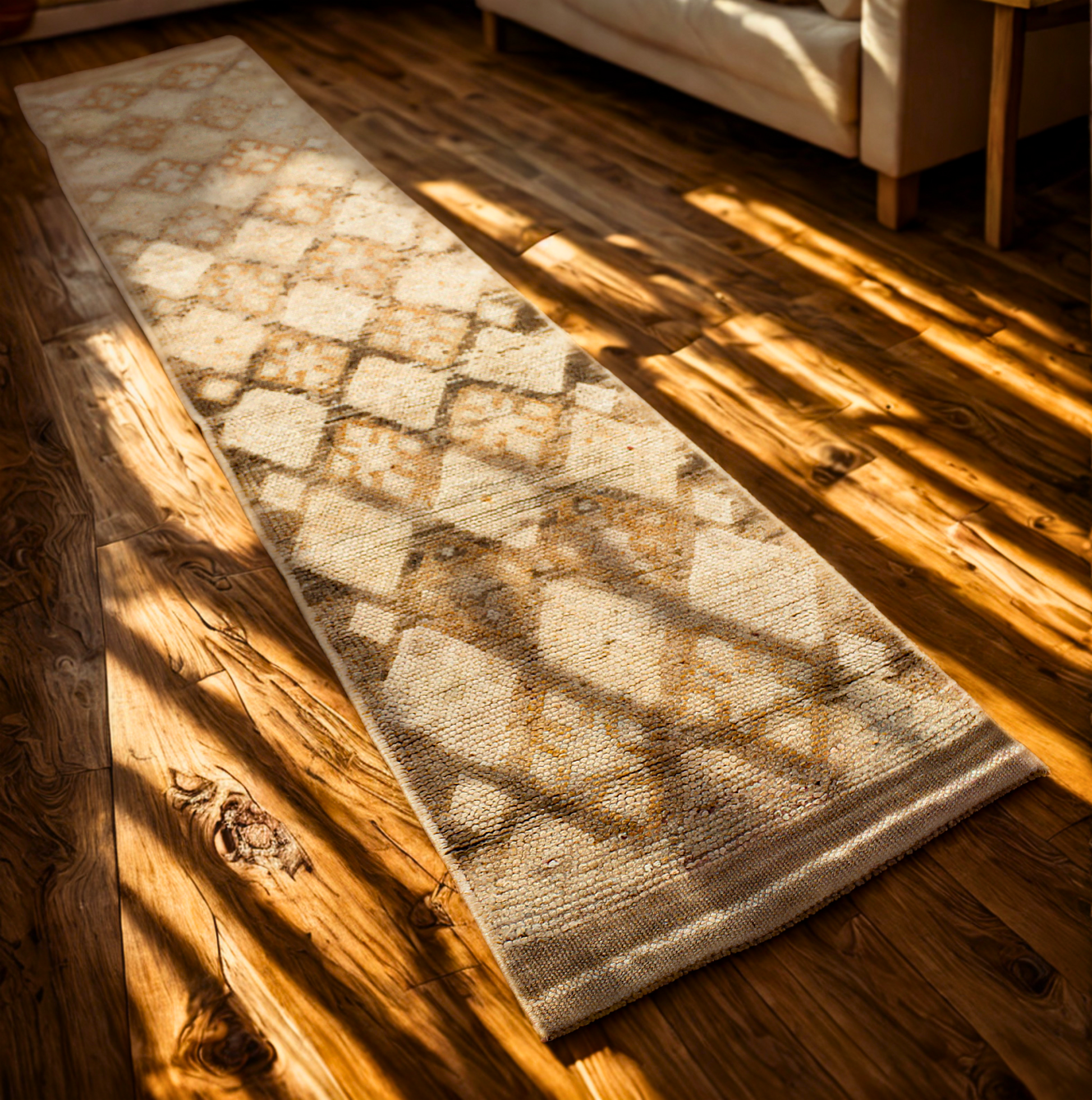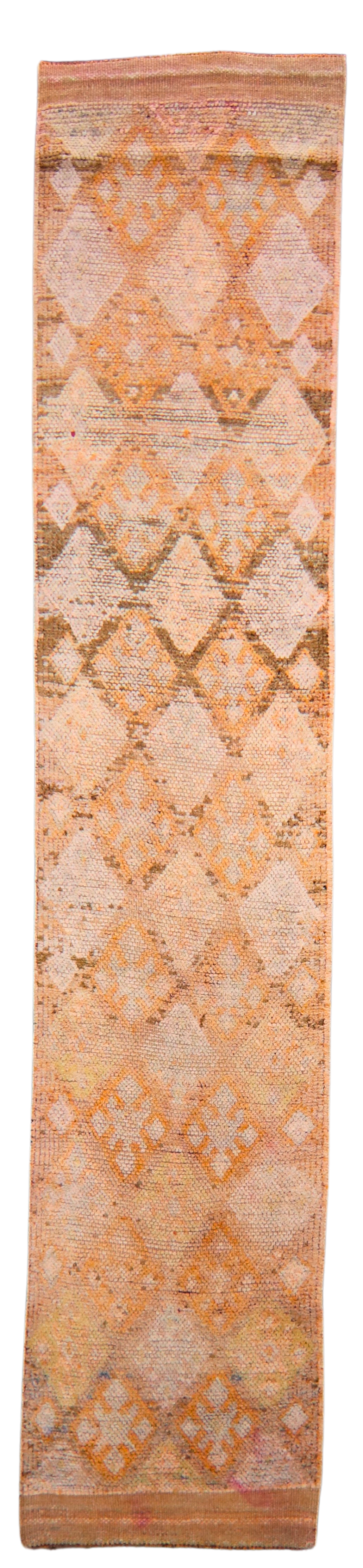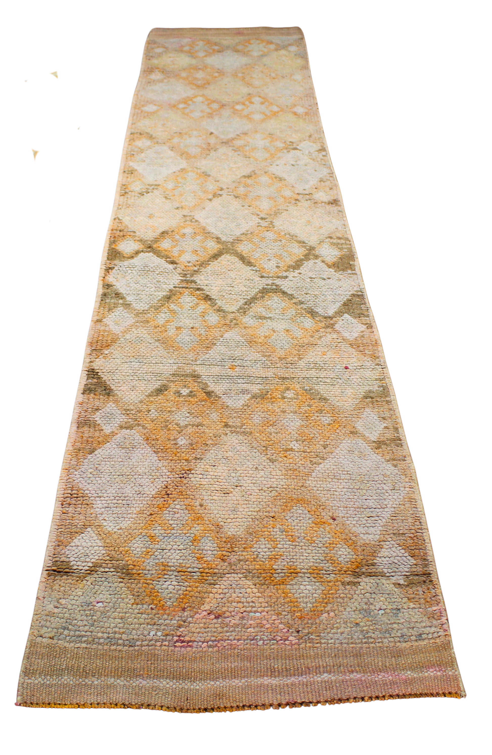 Delicate and serene, this antique Turkish Oushak runner (2.8 × 13.1 ft) presents a faded geometric motif that feels as if it’s been gently kissed by time and sun. Rendered in an airy palette of soft apricot, ivory, and faded gold, the rug displays a lattice of diamond medallions filled with simplified tribal motifs — ghostly yet harmonious, like a memory of past grandeur.
