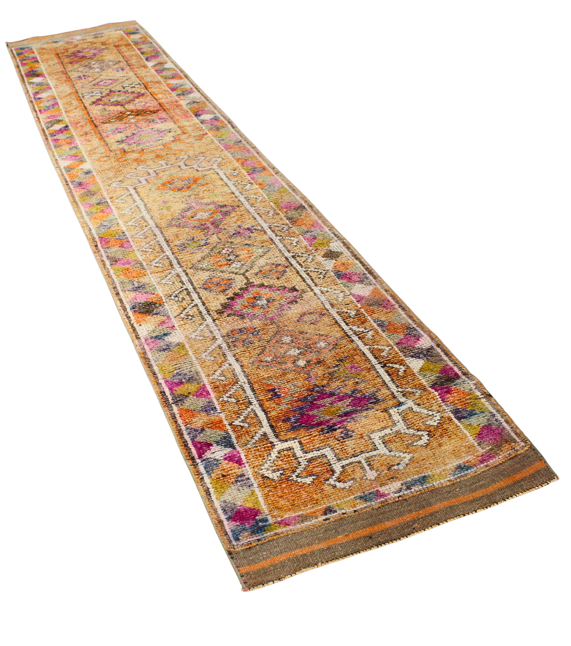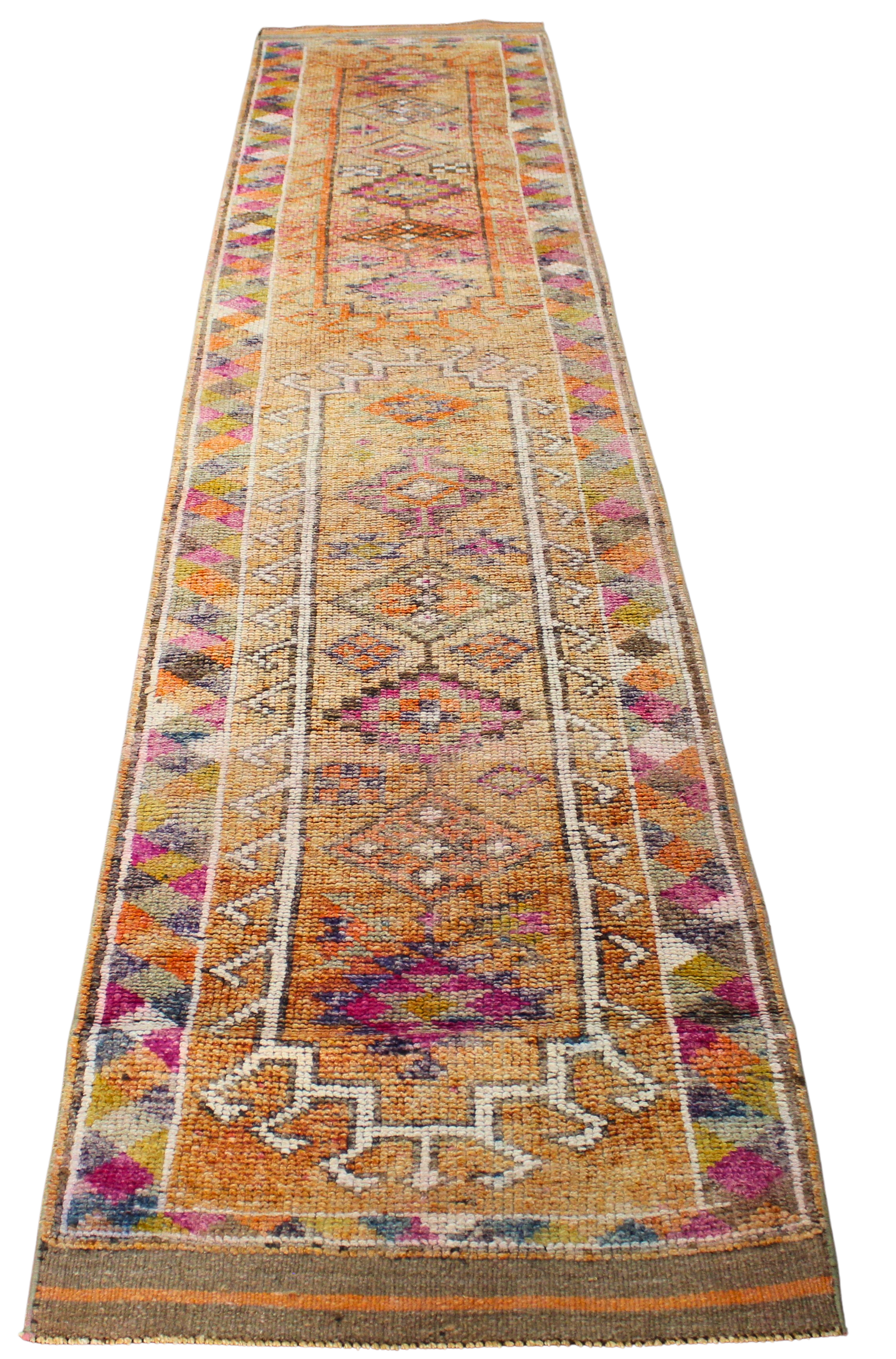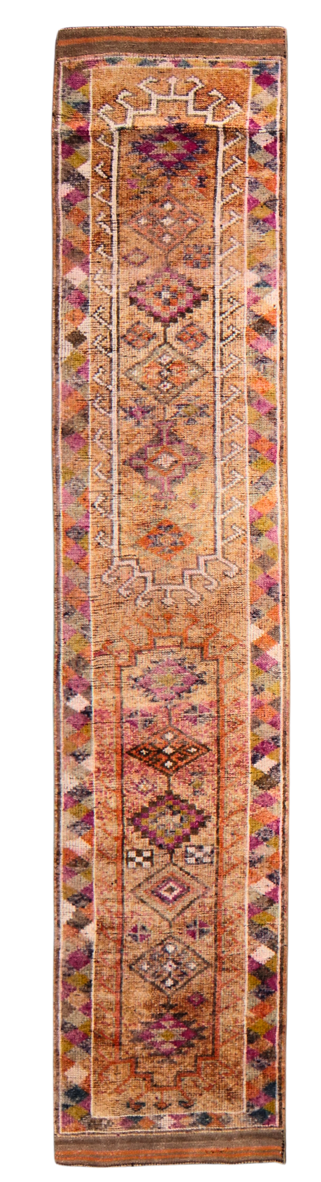 This long and slender antique Oushak runner (2.10 × 13 ft) offers a rustic tapestry of tradition and subtle vibrance. Its central field is defined by a sequence of stylized hexagonal medallions filled with tribal diamond motifs, gently faded through time to tones of clay, apricot, rose, plum, and olive. Framed by stepped white guardrails and a multicolor serrated border, the rug’s geometry exudes a primitive yet poetic rhythm.