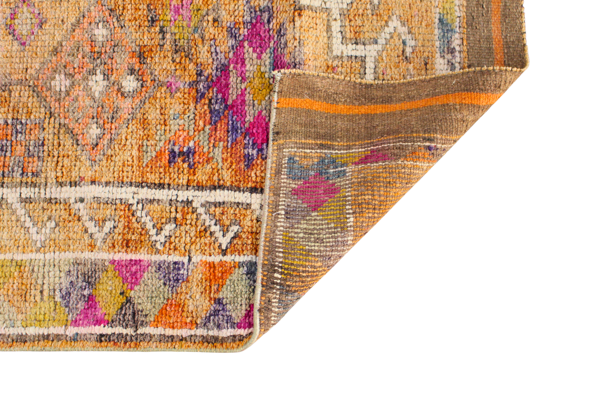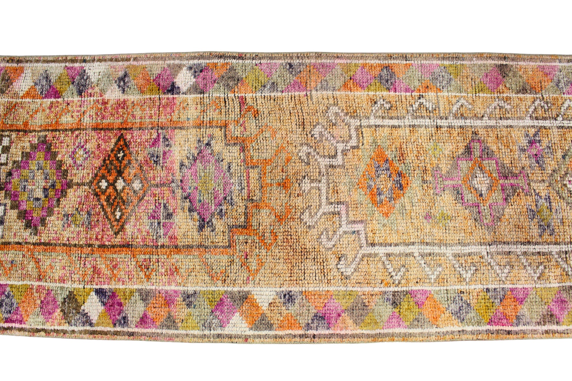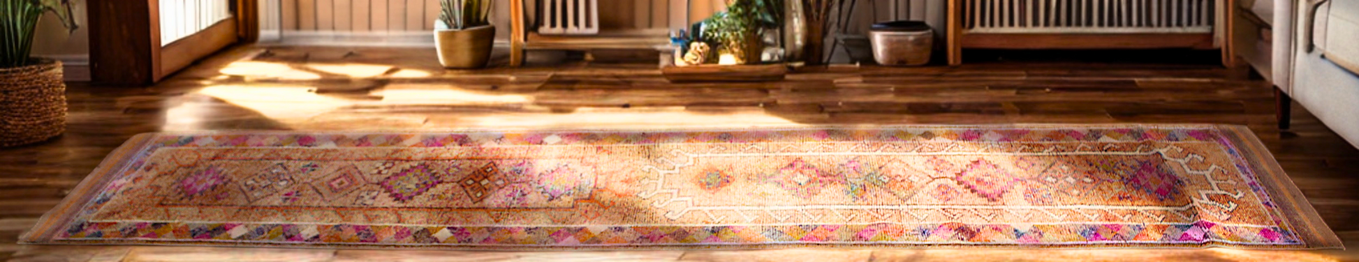 This long and slender antique Oushak runner (2.10 × 13 ft) offers a rustic tapestry of tradition and subtle vibrance. Its central field is defined by a sequence of stylized hexagonal medallions filled with tribal diamond motifs, gently faded through time to tones of clay, apricot, rose, plum, and olive. Framed by stepped white guardrails and a multicolor serrated border, the rug’s geometry exudes a primitive yet poetic rhythm.