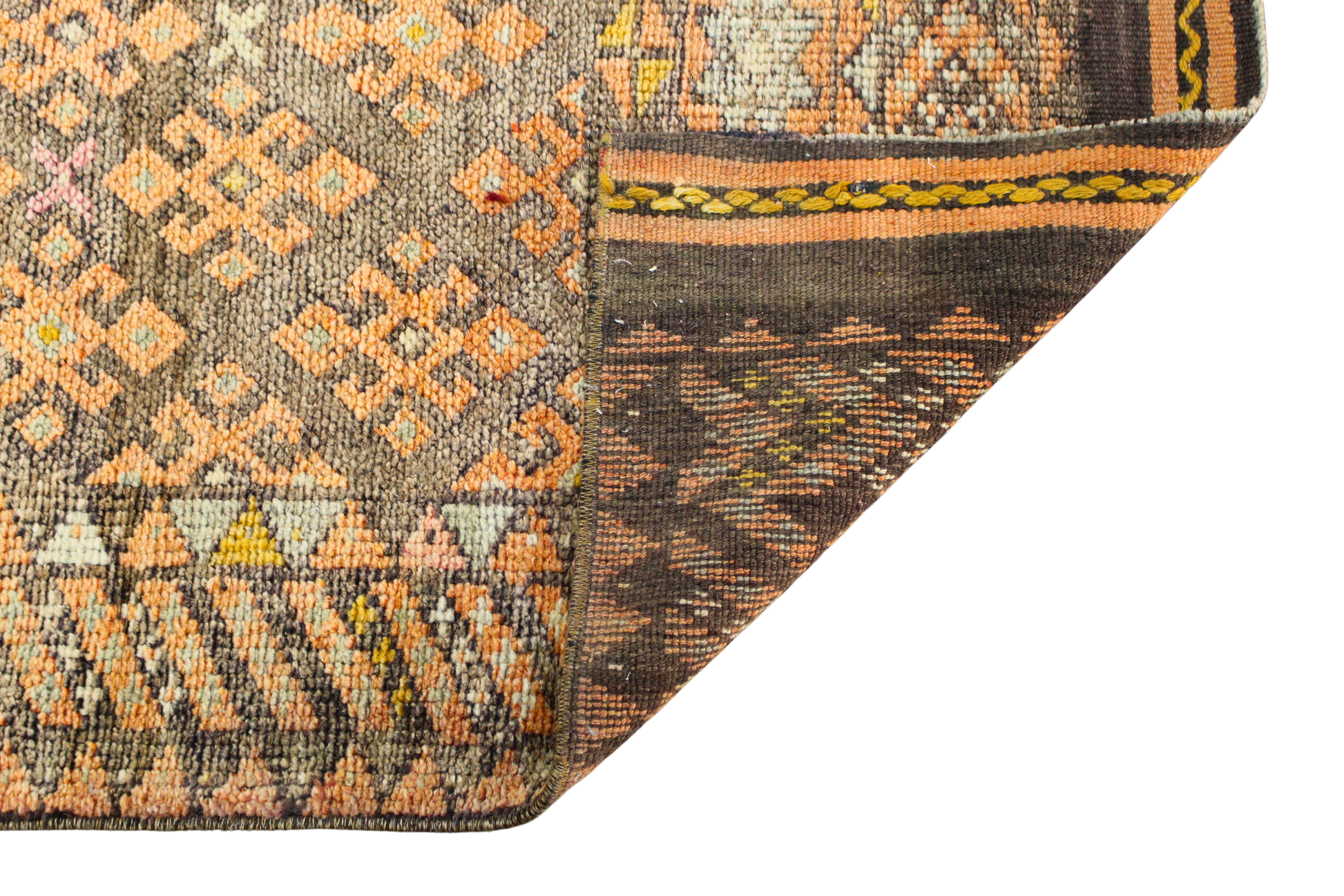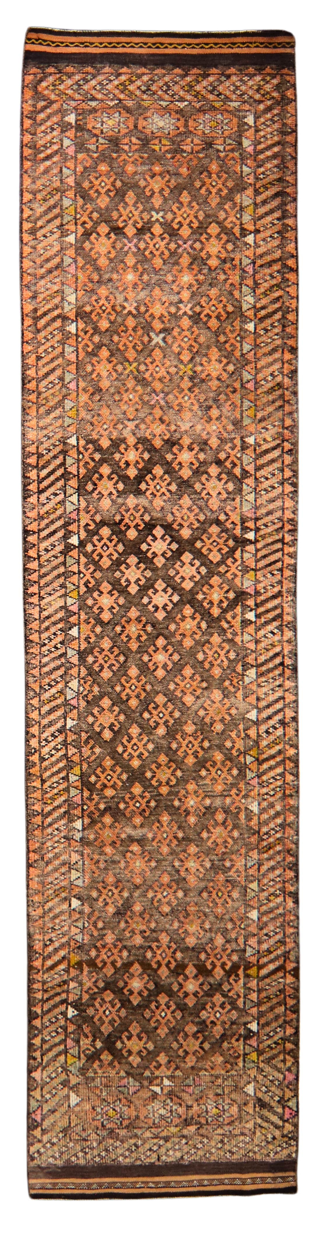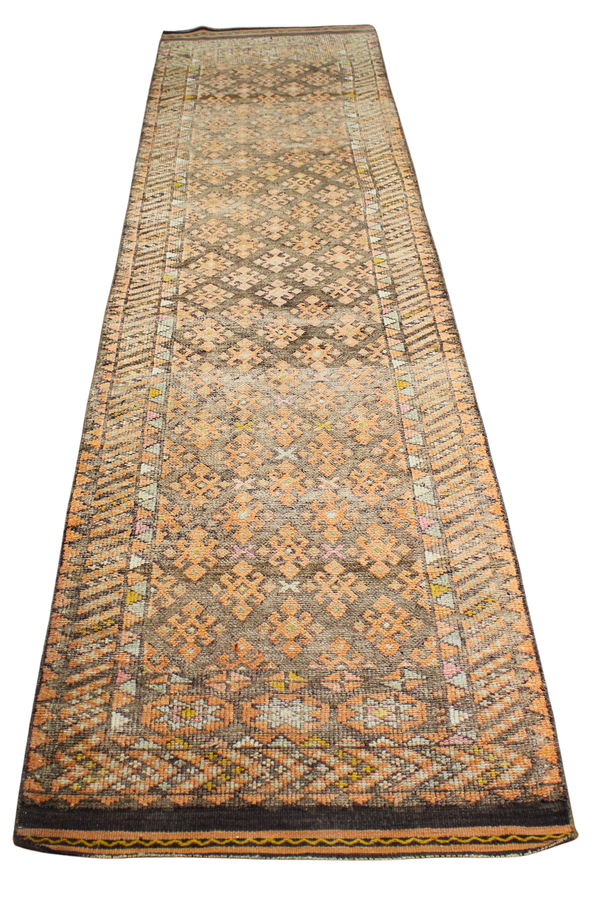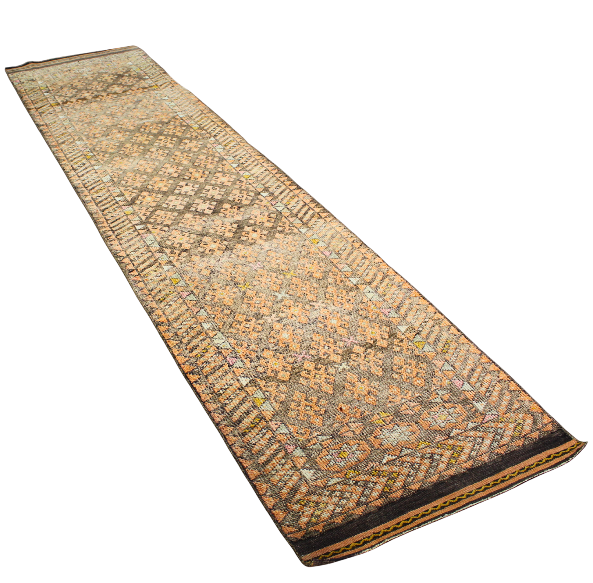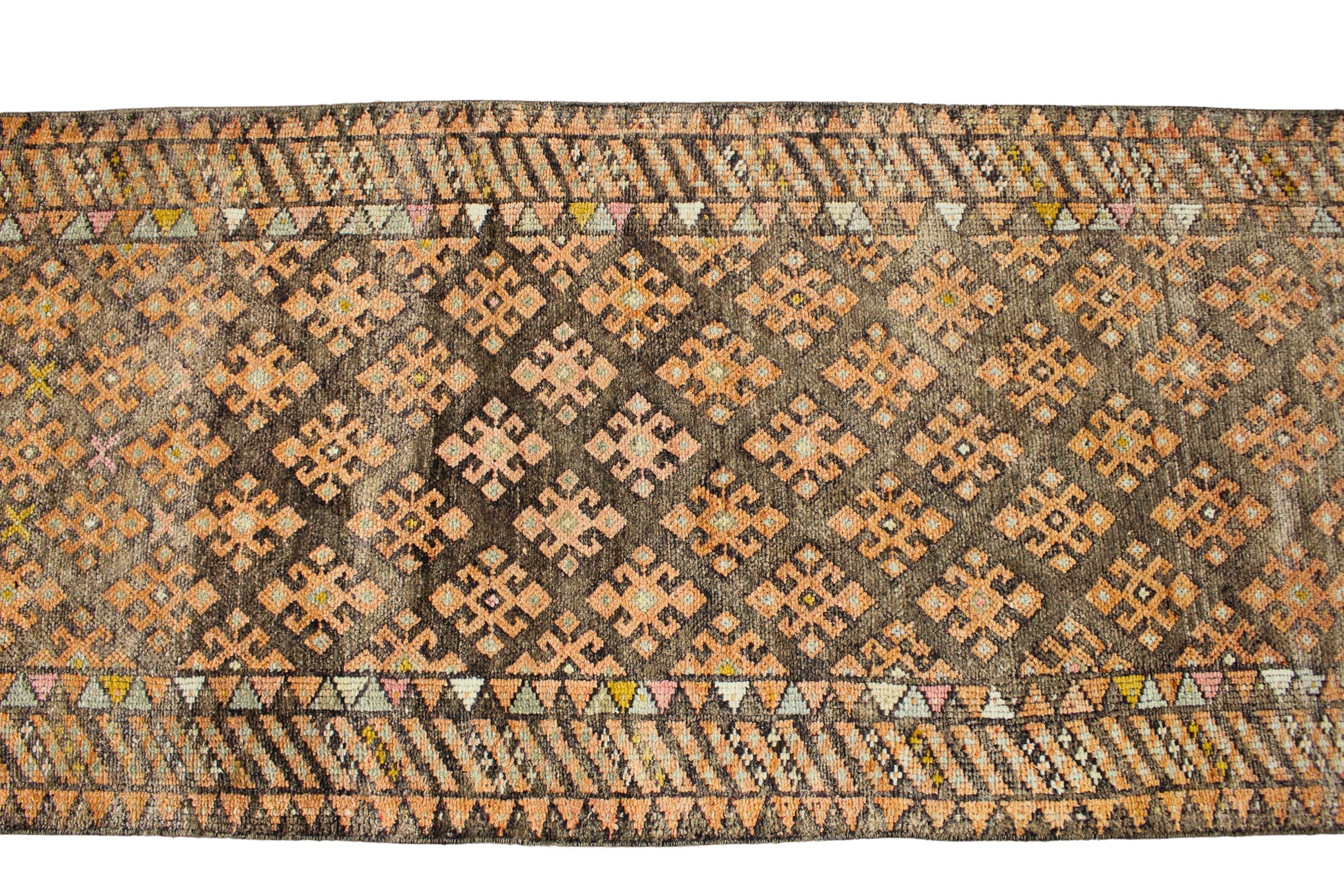 This striking antique Oushak runner (2.11 × 12.5 ft) features an intensely rhythmic grid of cross-like motifs, hand-knotted in muted apricot, chestnut brown, and faded rust. The geometric design unfolds across a field of weathered charcoal, framed by diagonally striped borders that amplify the rug’s tribal movement and visual tension.