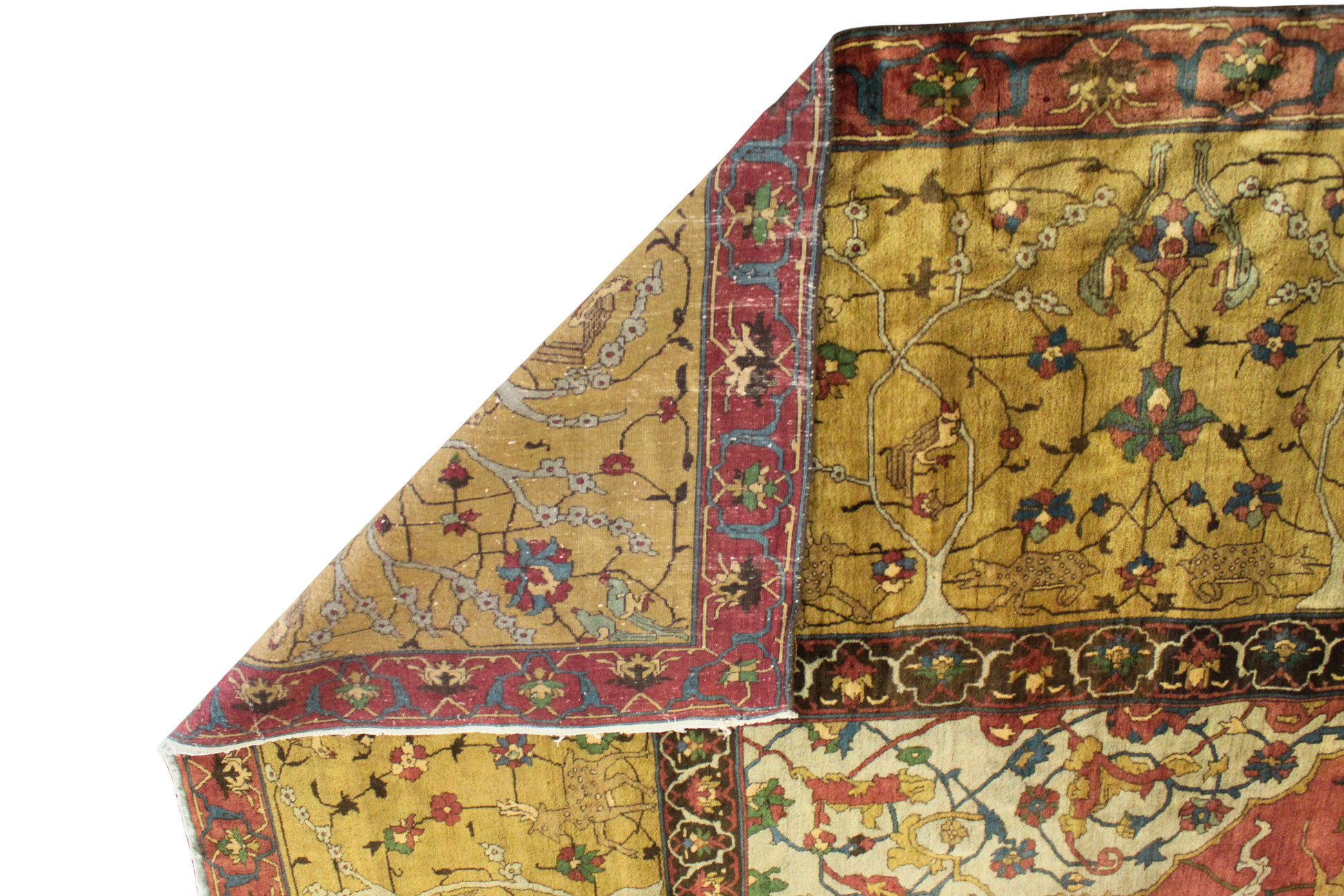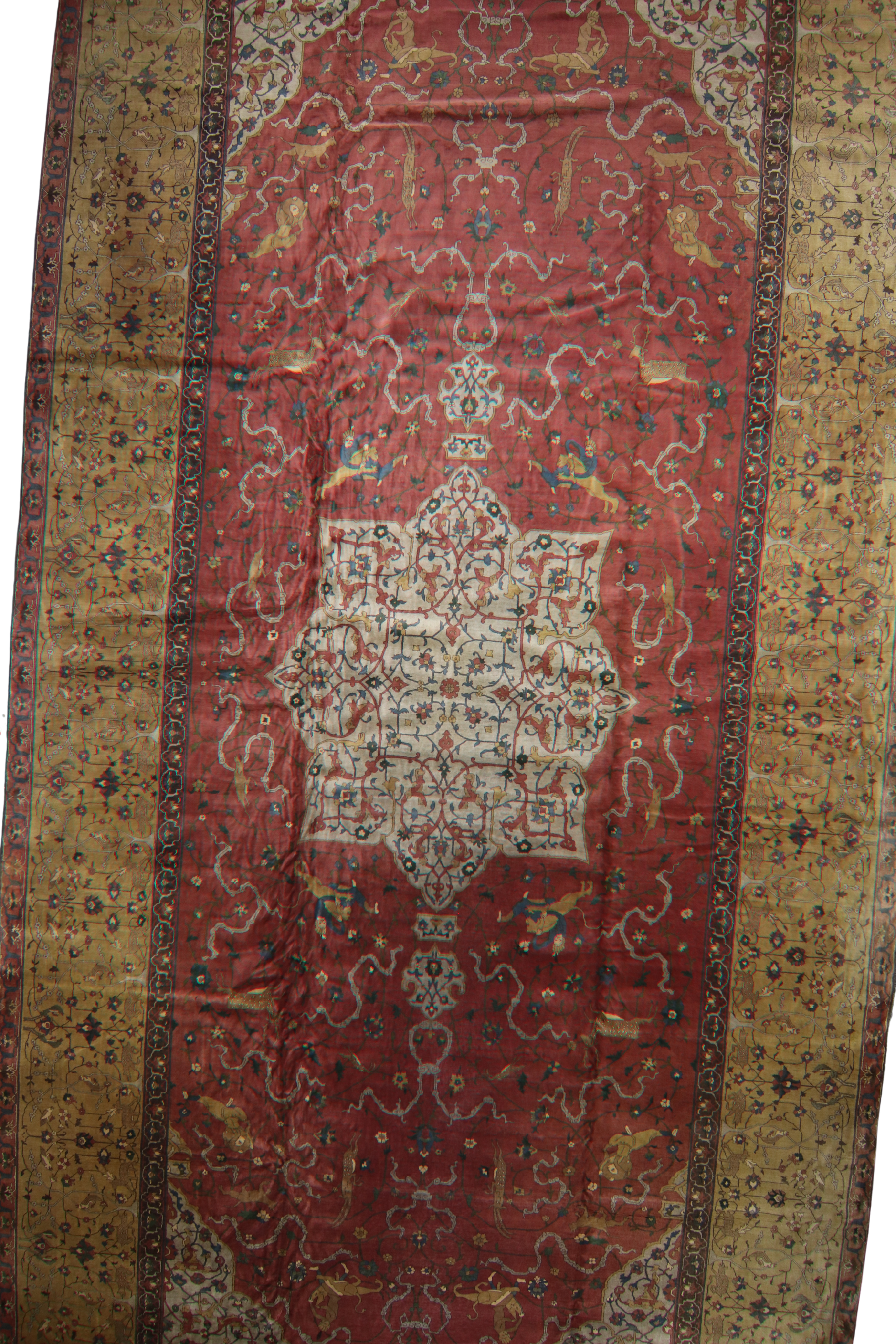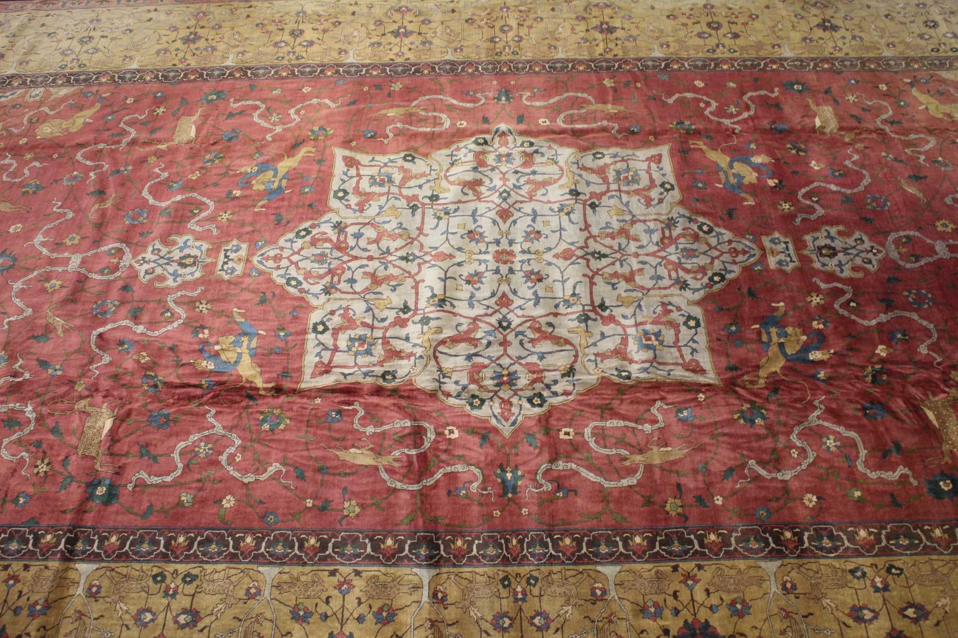 A monumental masterpiece of scale and craftsmanship, this antique Larestan rug from India (15′3″ × 30′) commands attention with regal confidence and museum-worthy detail. Its sprawling medallion design unfolds in a lavish composition of carnelian red, saffron gold, and parchment ivory, with intricate floral scrolls and stylized animal figures forming an opulent tapestry of symbolism and artistry.