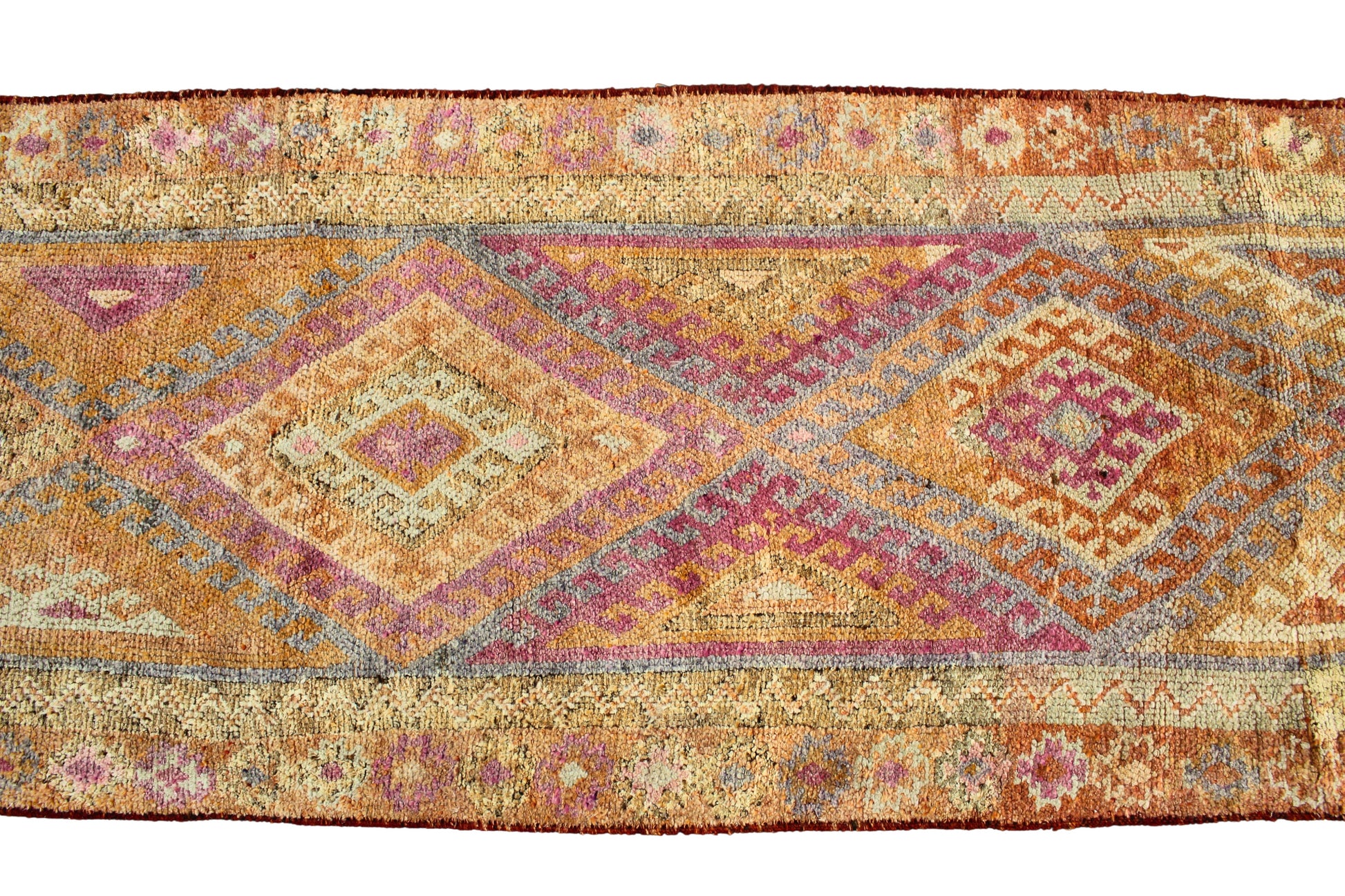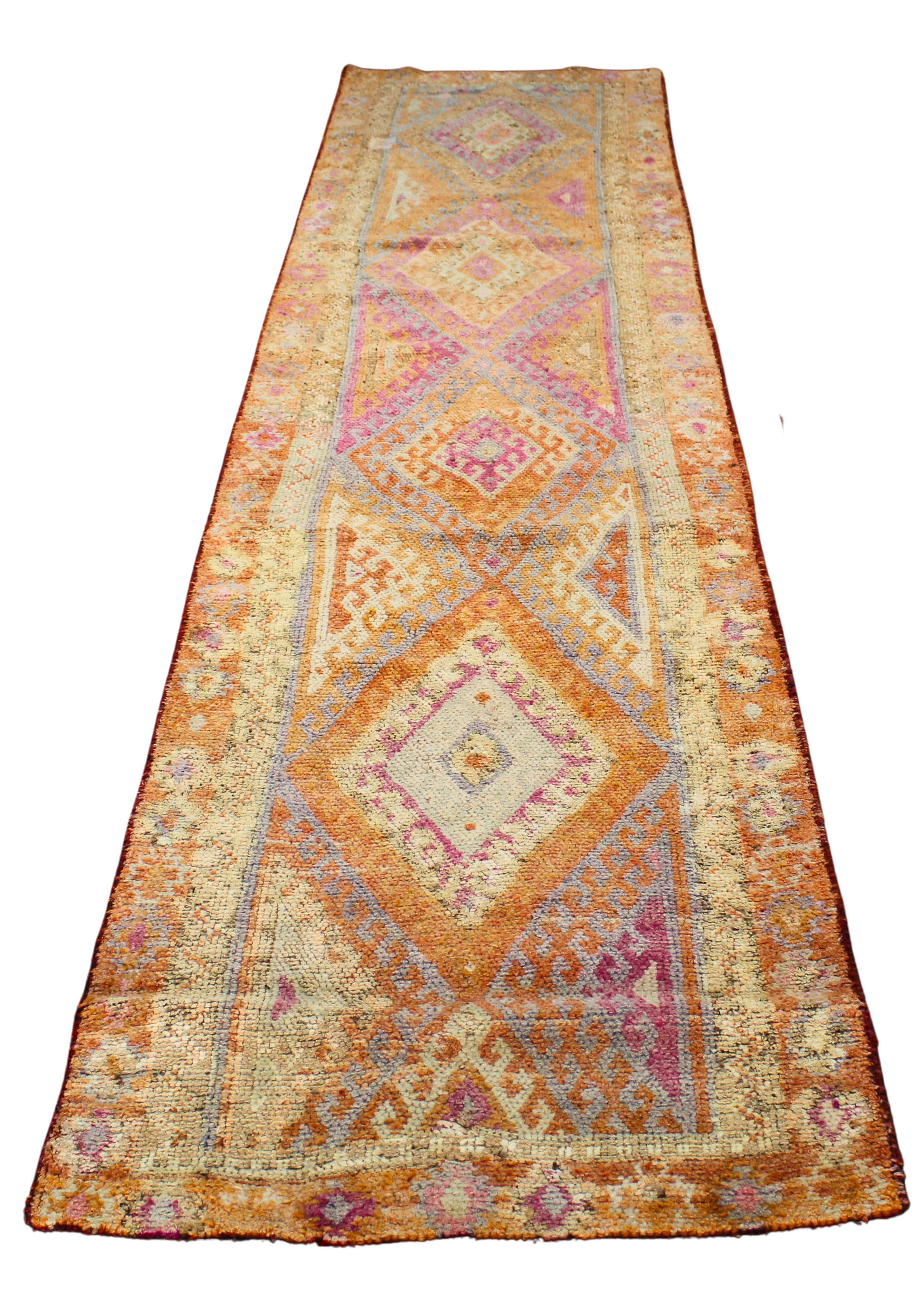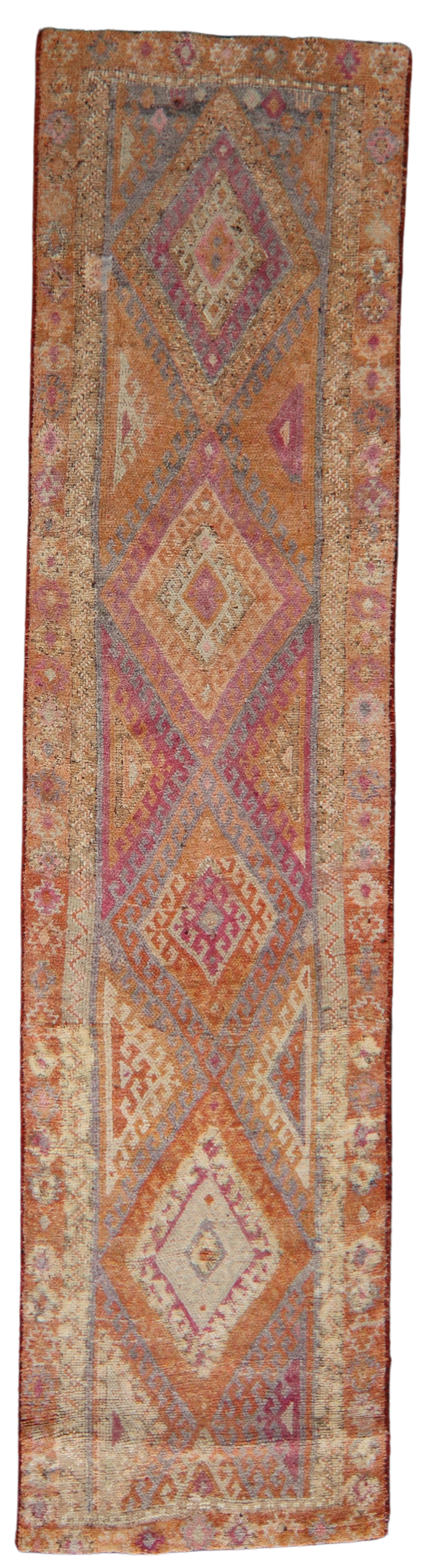 This radiant antique Oushak runner (3.1 × 12.7 ft) feels like a tapestry of fire and faded jewel tones, anchored by a strong tribal rhythm. Large stepped diamond medallions march down the field in a palette of terracotta, violet, coral, lavender, and faded ochre — evocative of Turkish village weaving at its most expressive.