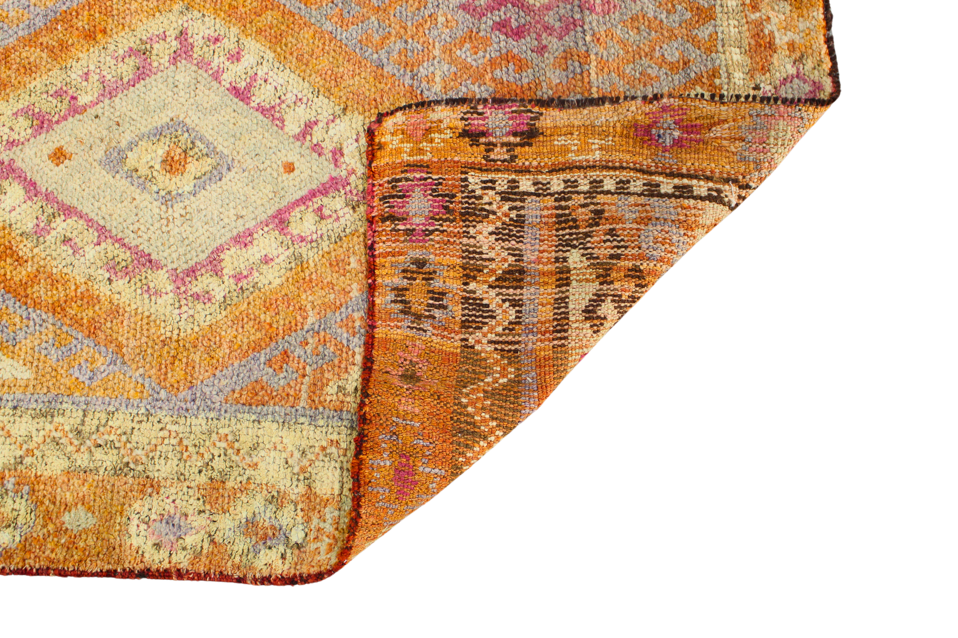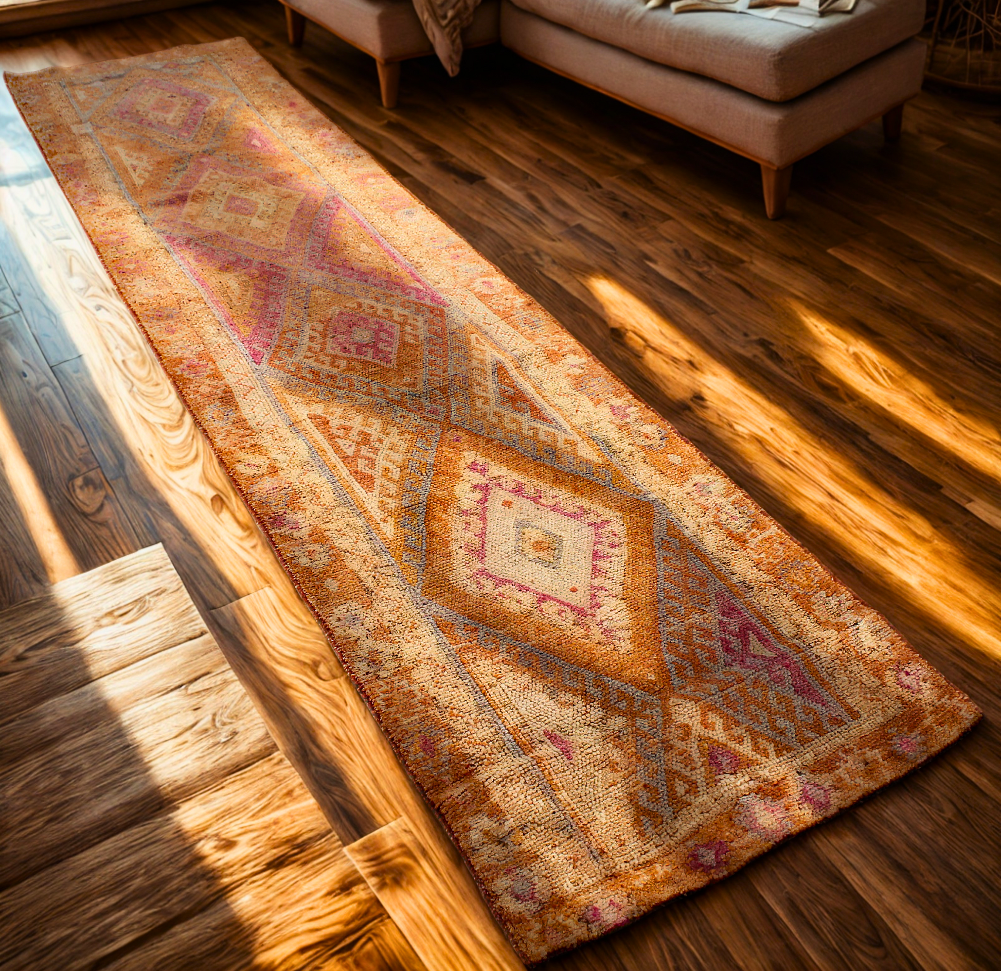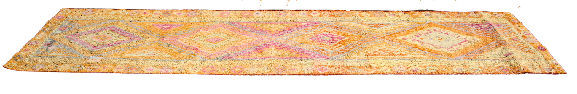 This radiant antique Oushak runner (3.1 × 12.7 ft) feels like a tapestry of fire and faded jewel tones, anchored by a strong tribal rhythm. Large stepped diamond medallions march down the field in a palette of terracotta, violet, coral, lavender, and faded ochre — evocative of Turkish village weaving at its most expressive.