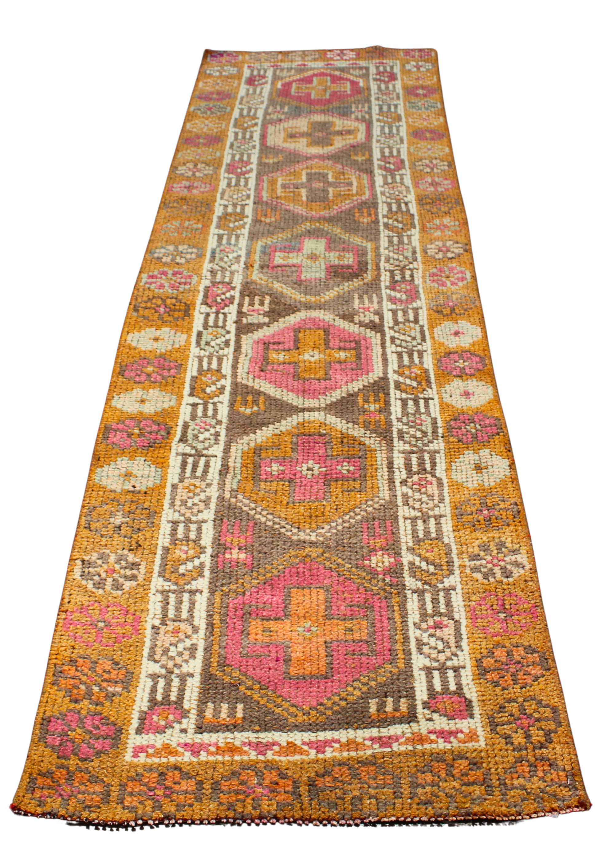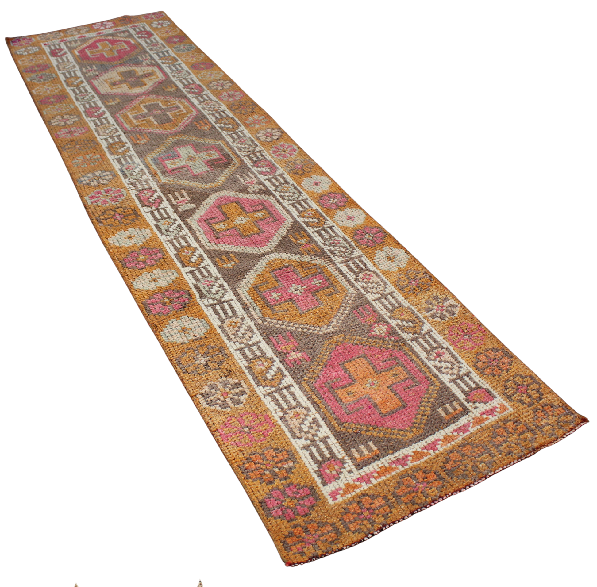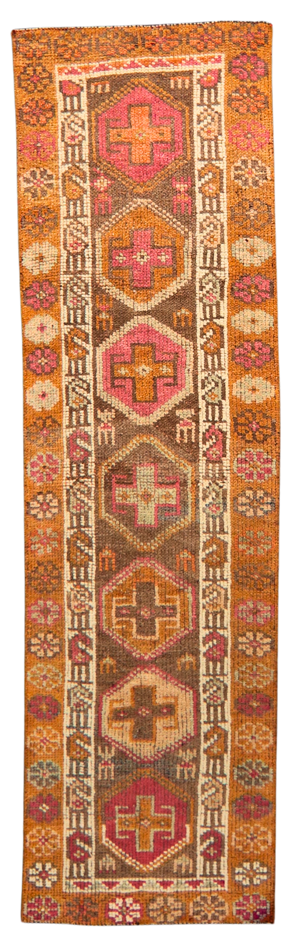 This vivid antique Oushak runner (2.9 × 9.8 ft) captures the bold soul of Anatolian weaving with its striking use of color and geometric form. Centered with a chain of medallions bearing stylized cross motifs, the rug glows in hues of apricot, burnt sienna, rose red, and rustic clay, accented with ivory outlines for a grounded tribal rhythm.