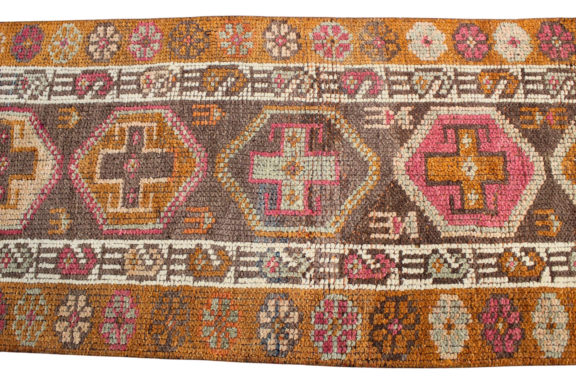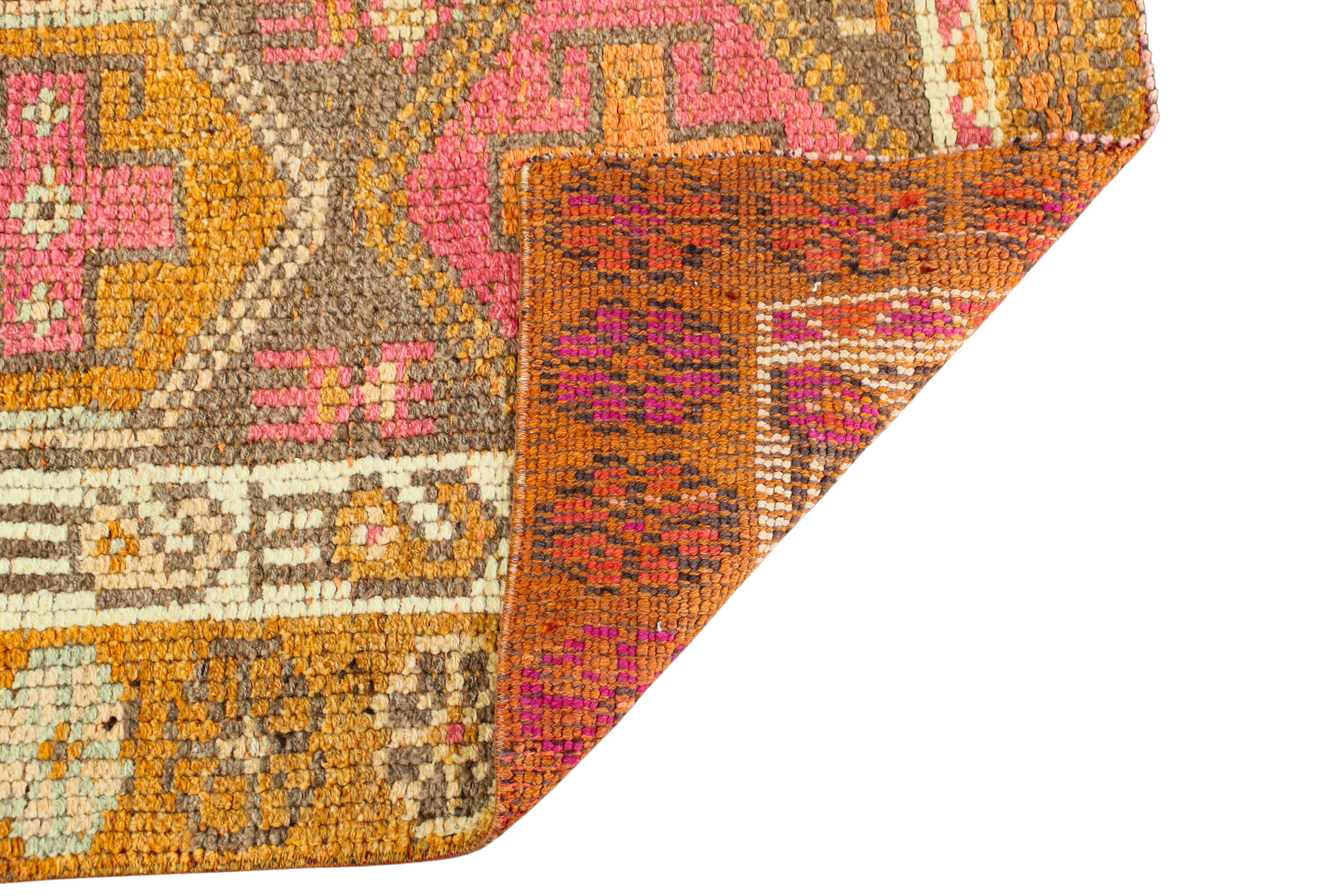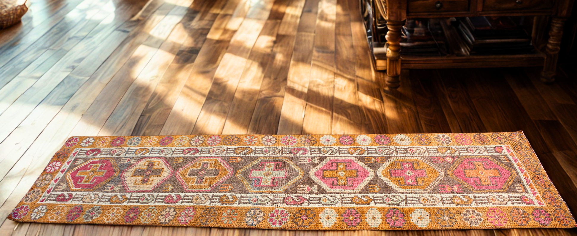 This vivid antique Oushak runner (2.9 × 9.8 ft) captures the bold soul of Anatolian weaving with its striking use of color and geometric form. Centered with a chain of medallions bearing stylized cross motifs, the rug glows in hues of apricot, burnt sienna, rose red, and rustic clay, accented with ivory outlines for a grounded tribal rhythm.