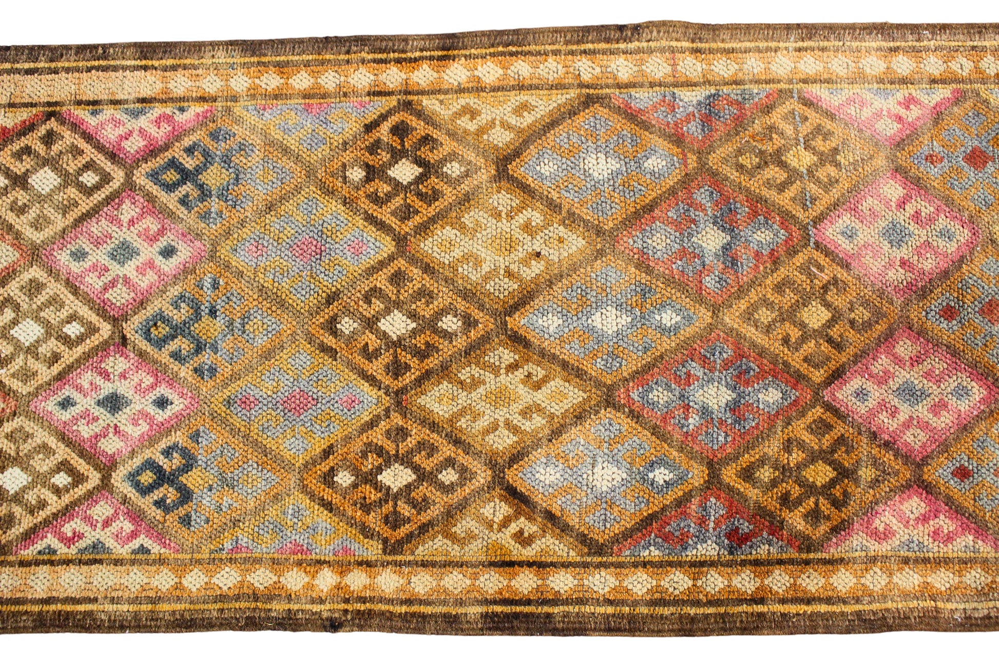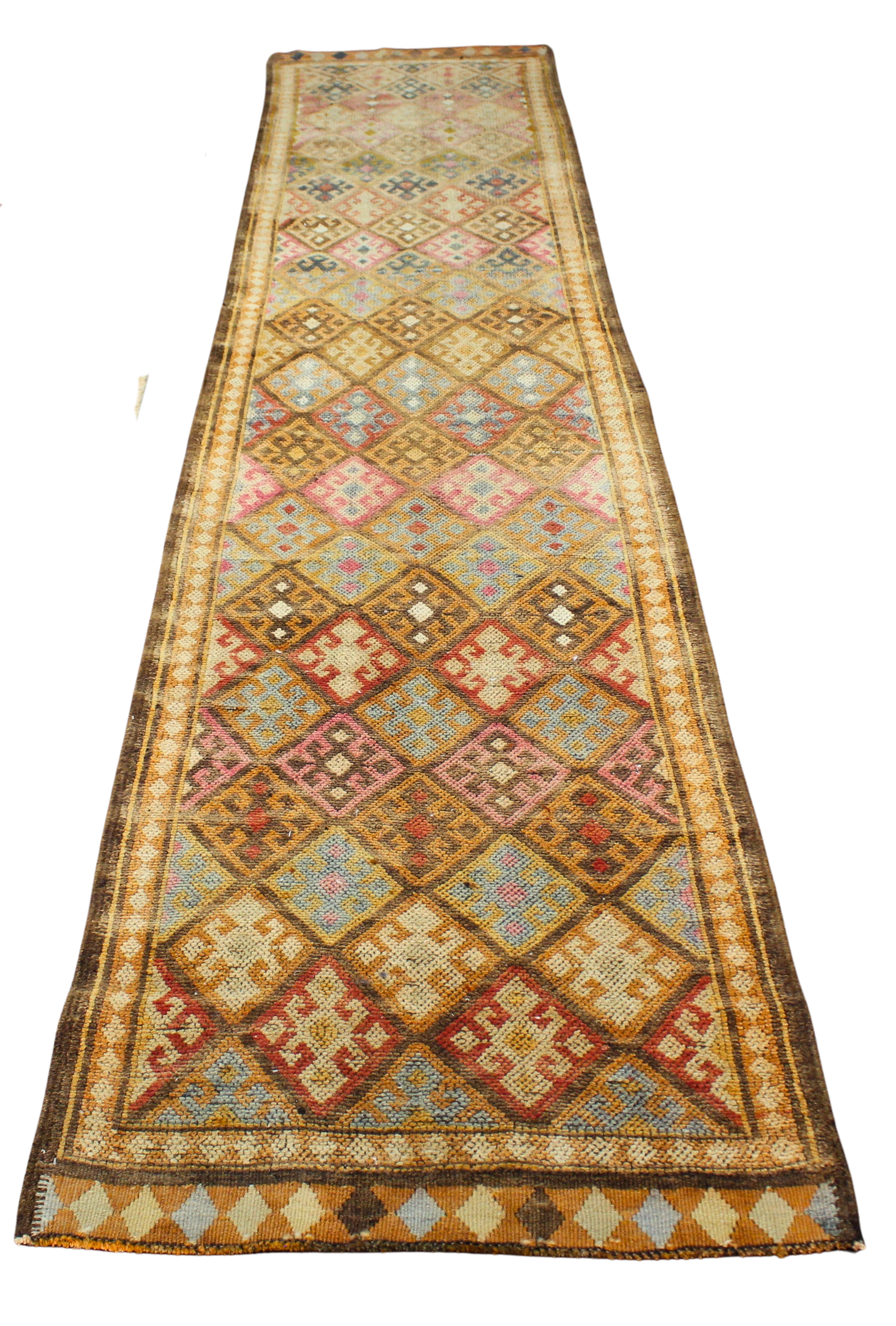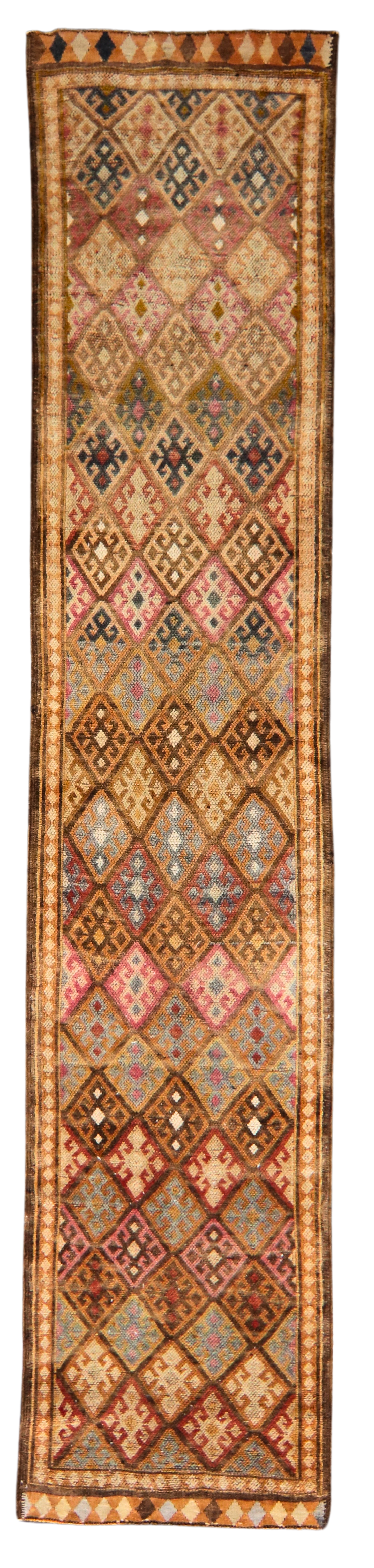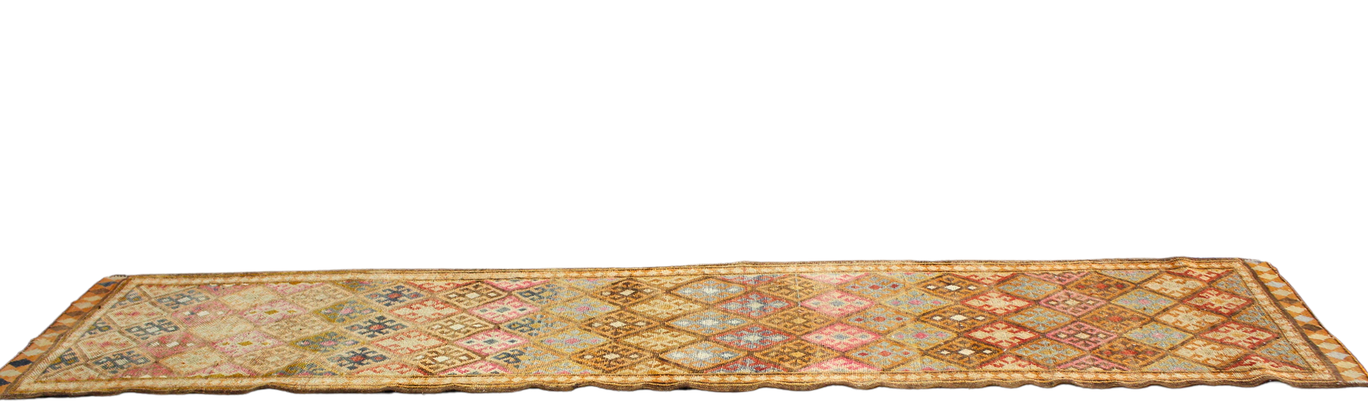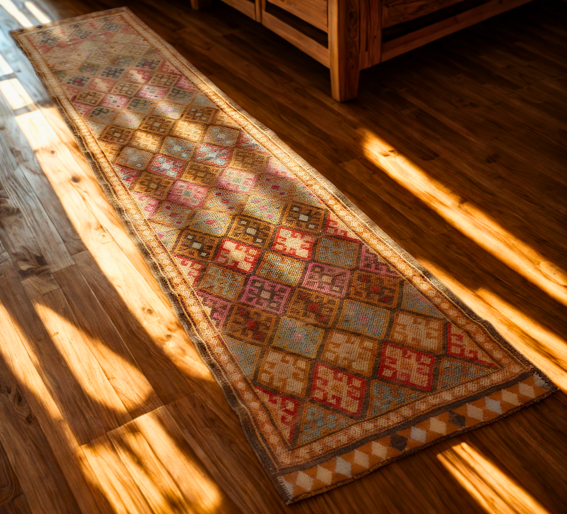 This elongated antique Oushak runner (2.8 × 13.8 ft) presents a mesmerizing lattice of small-scale diamond motifs, hand-knotted in a rhythm that moves like woven music. Each lozenge holds its own unique accent—stylized medallions, blossoms, or latch-hook forms—layered in a warm, weathered palette of peach, camel, rust, faded coral, indigo, and soft ivory.