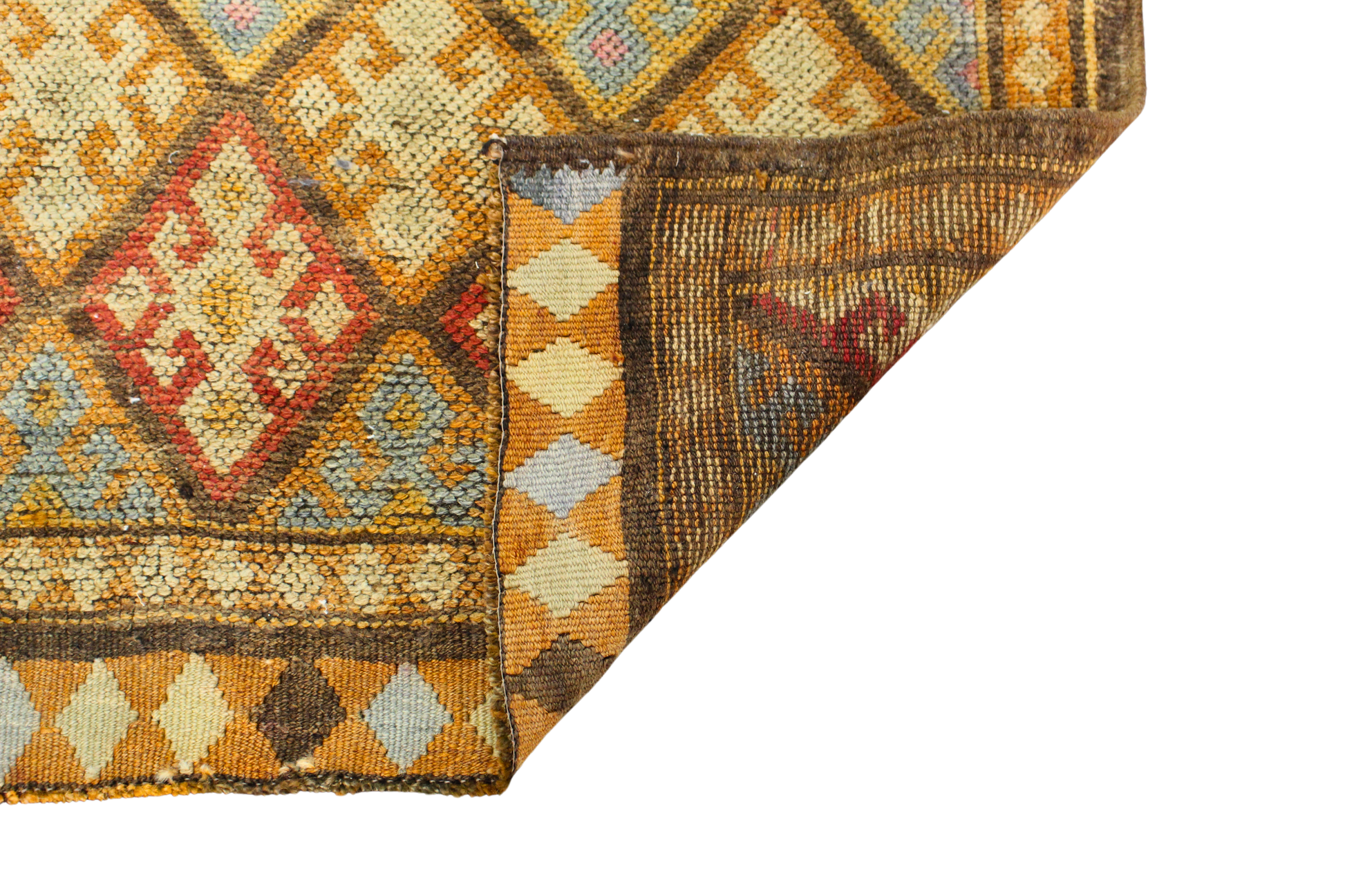 A narrow border of ochre and ivory triangle motifs frames the rug, evoking traditional Anatolian mountain patterns. The extended length and slim profile make it an ideal candidate for a dramatic hallway, galley kitchen, or even alongside a long dining banquette.