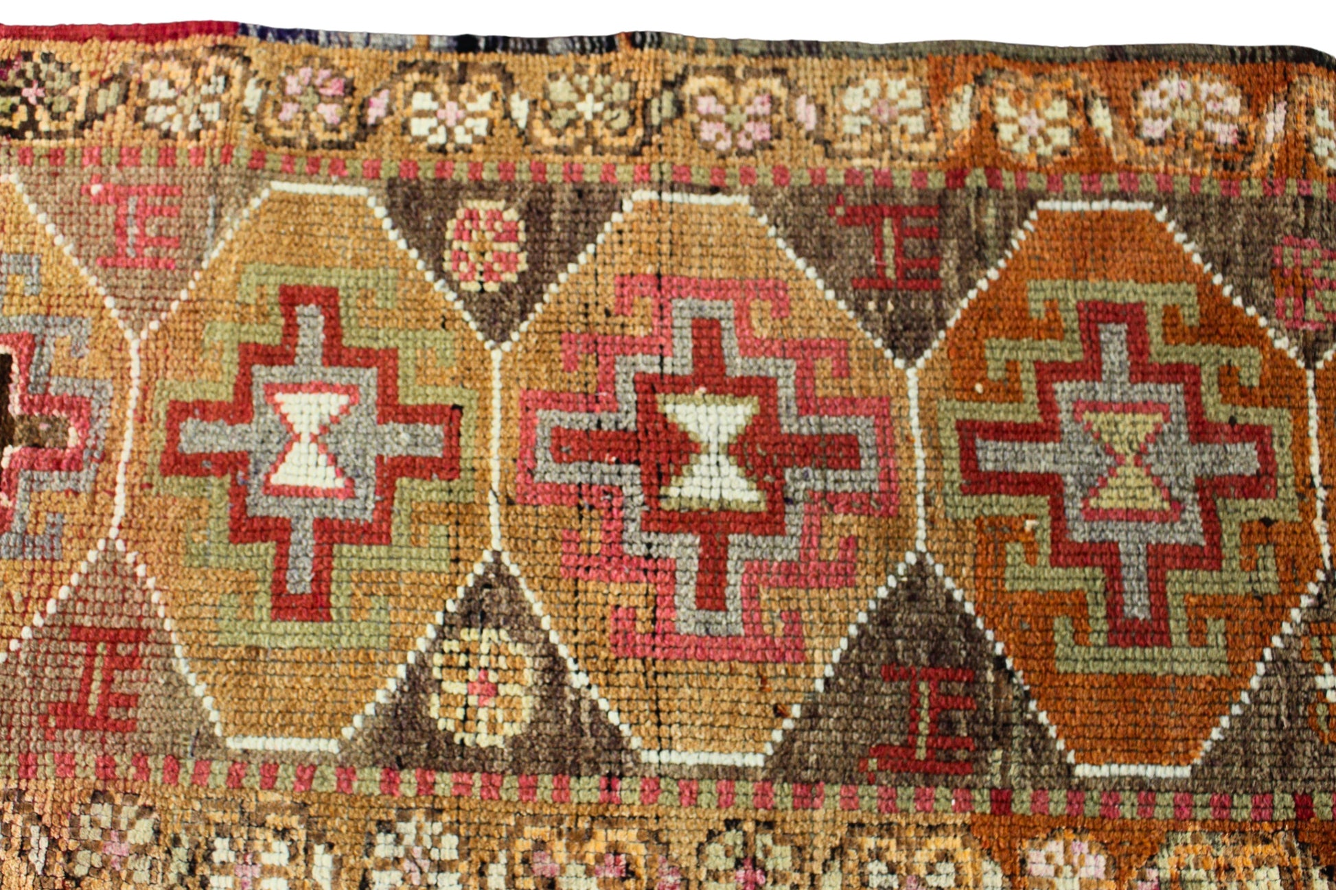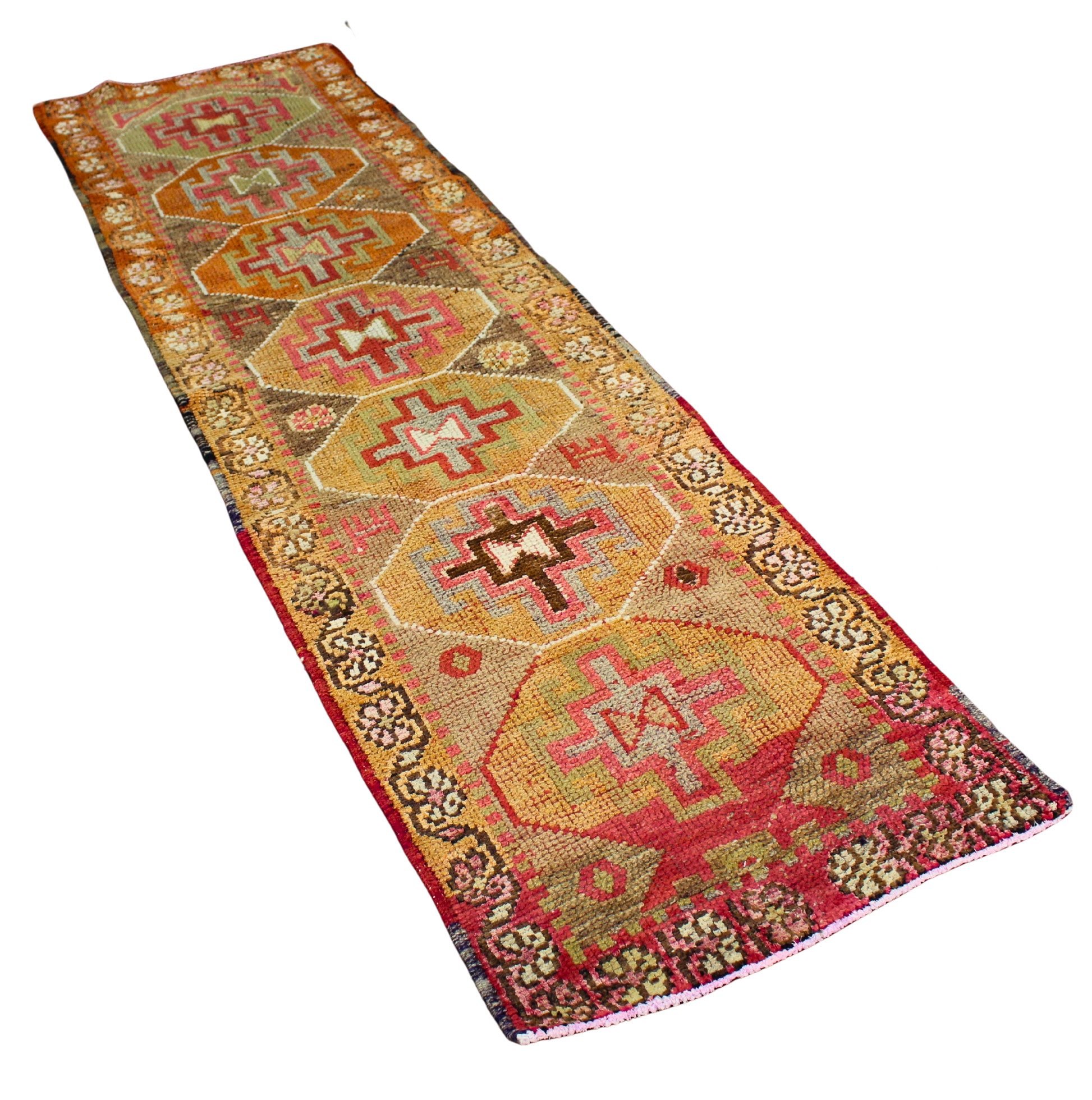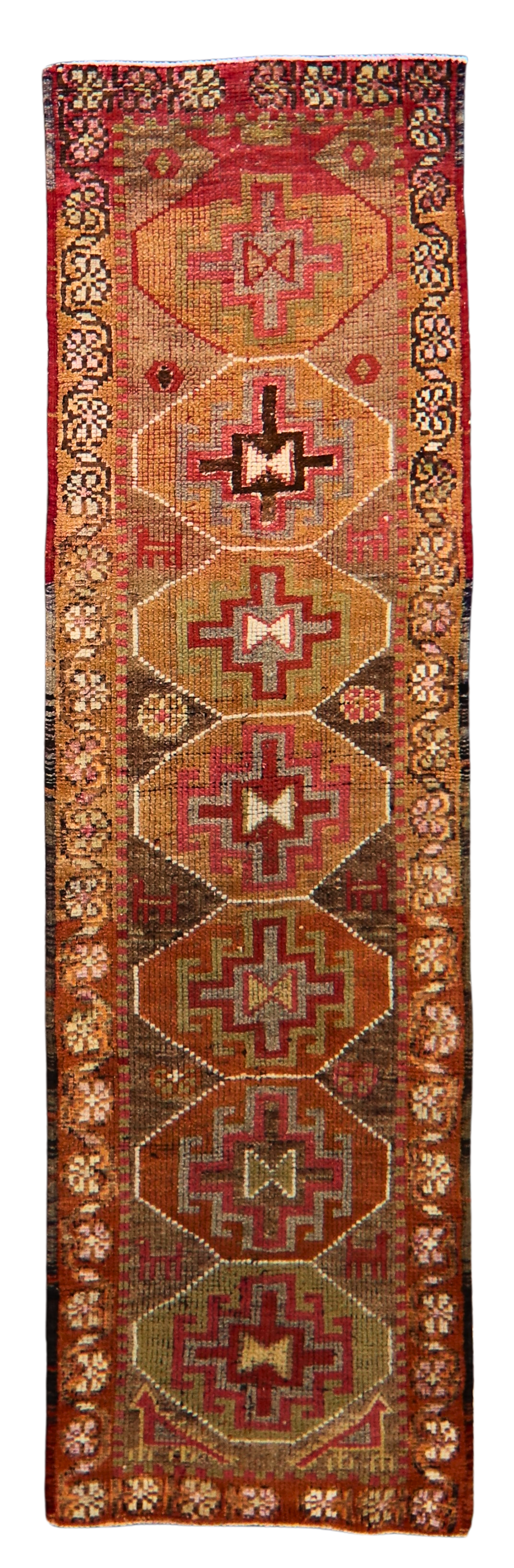 This 2.9 × 7.7 ft Turkish Oushak runner brings a bold and earthy presence to any narrow space with its tribal-inspired design and rich, time-softened colors. A series of interconnected medallions — each bearing a stylized double hook motif — runs the length of the rug, framed by a border of small floral rosettes. The palette blends warm rust, moss green, faded apricot, and dusky red, offering a naturally distressed look that speaks to the piece’s age and authenticity.