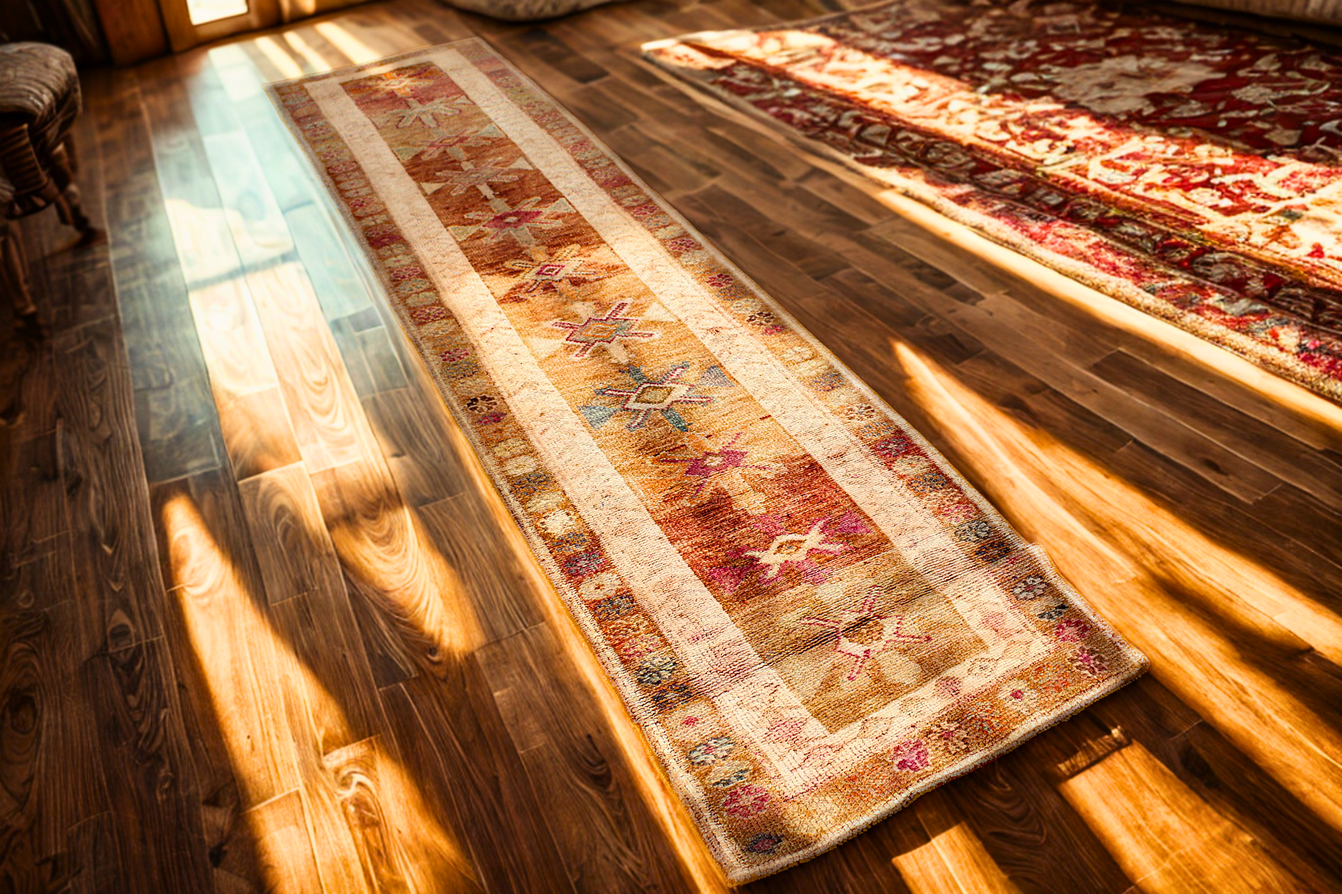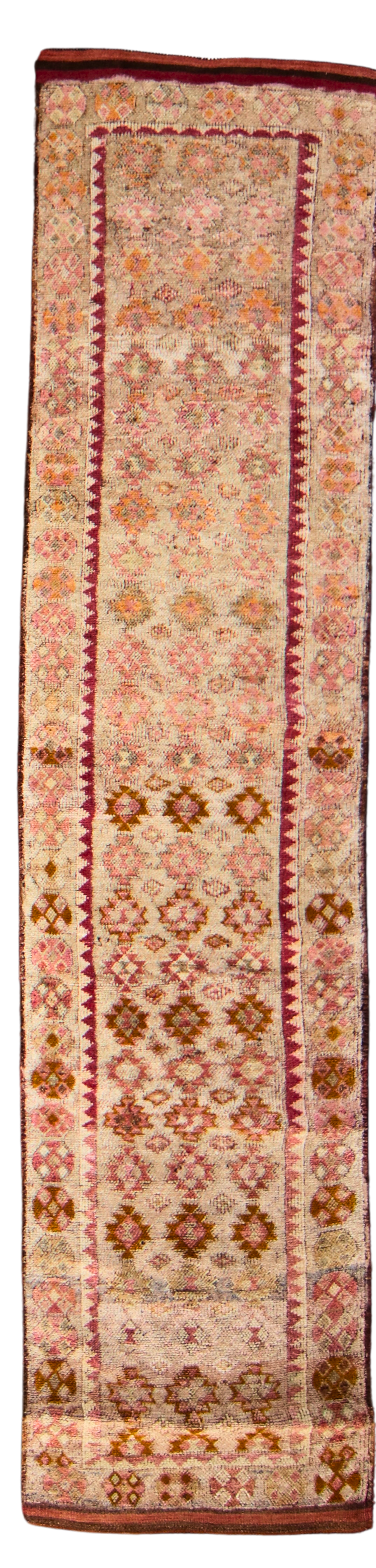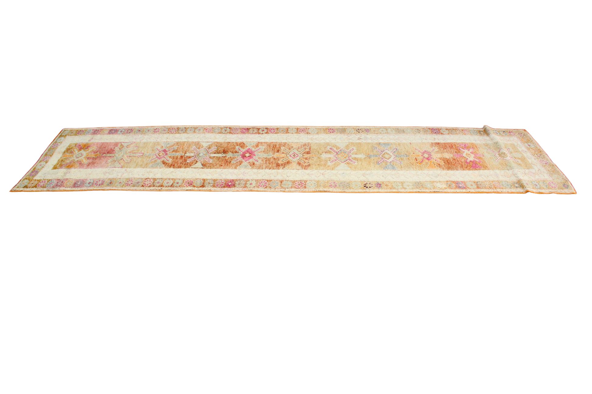 With its barely-there palette and timeworn beauty, this antique Oushak runner (2.11 × 11.6 ft) feels like a memory softened by sunlight. Rows of delicate floral rosettes and small geometric motifs drift across the rug in shades of blush, ivory, dusty gold, and faded rust, all grounded by a crimson zigzag inner border that adds a subtle rhythmic structure.