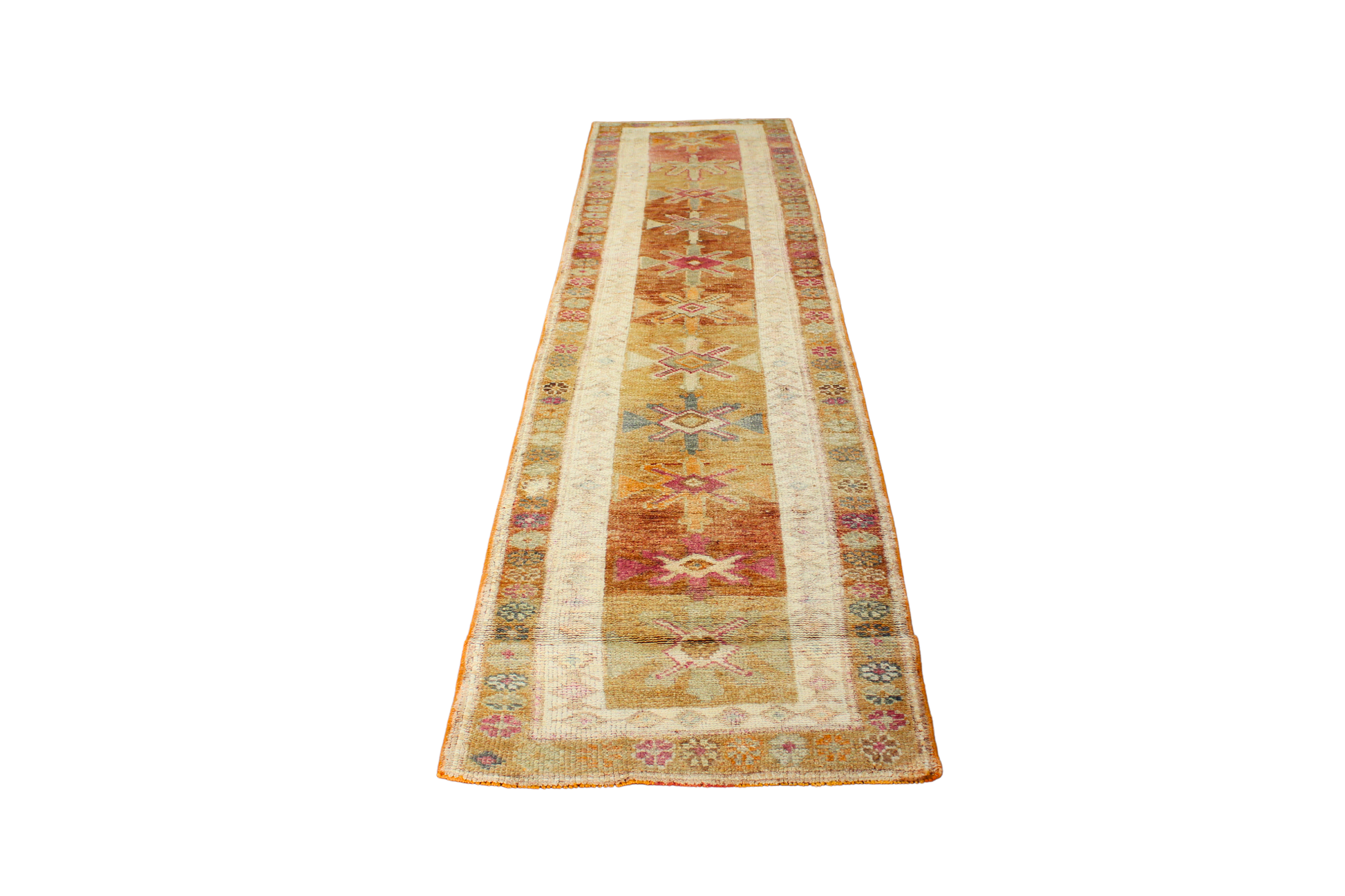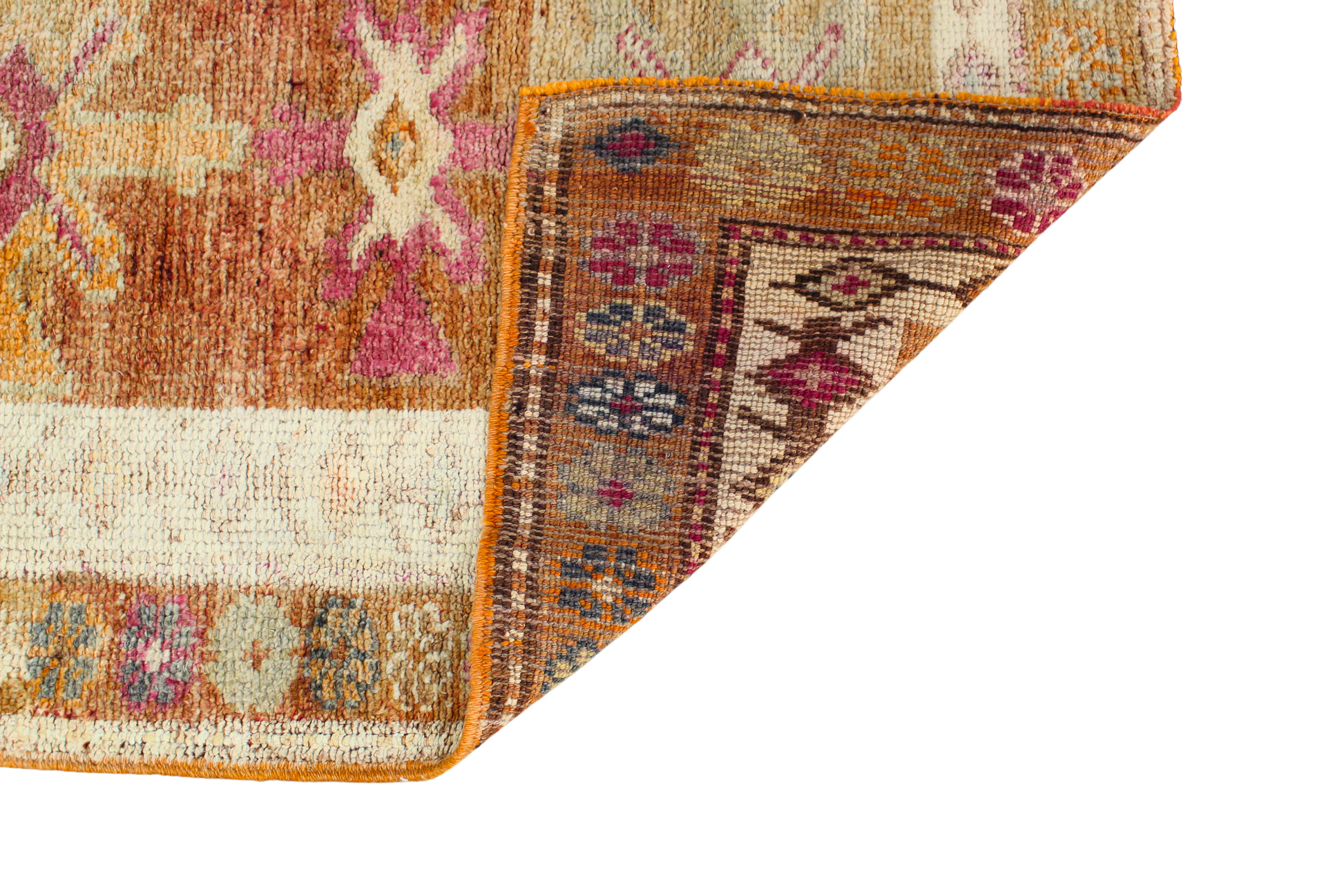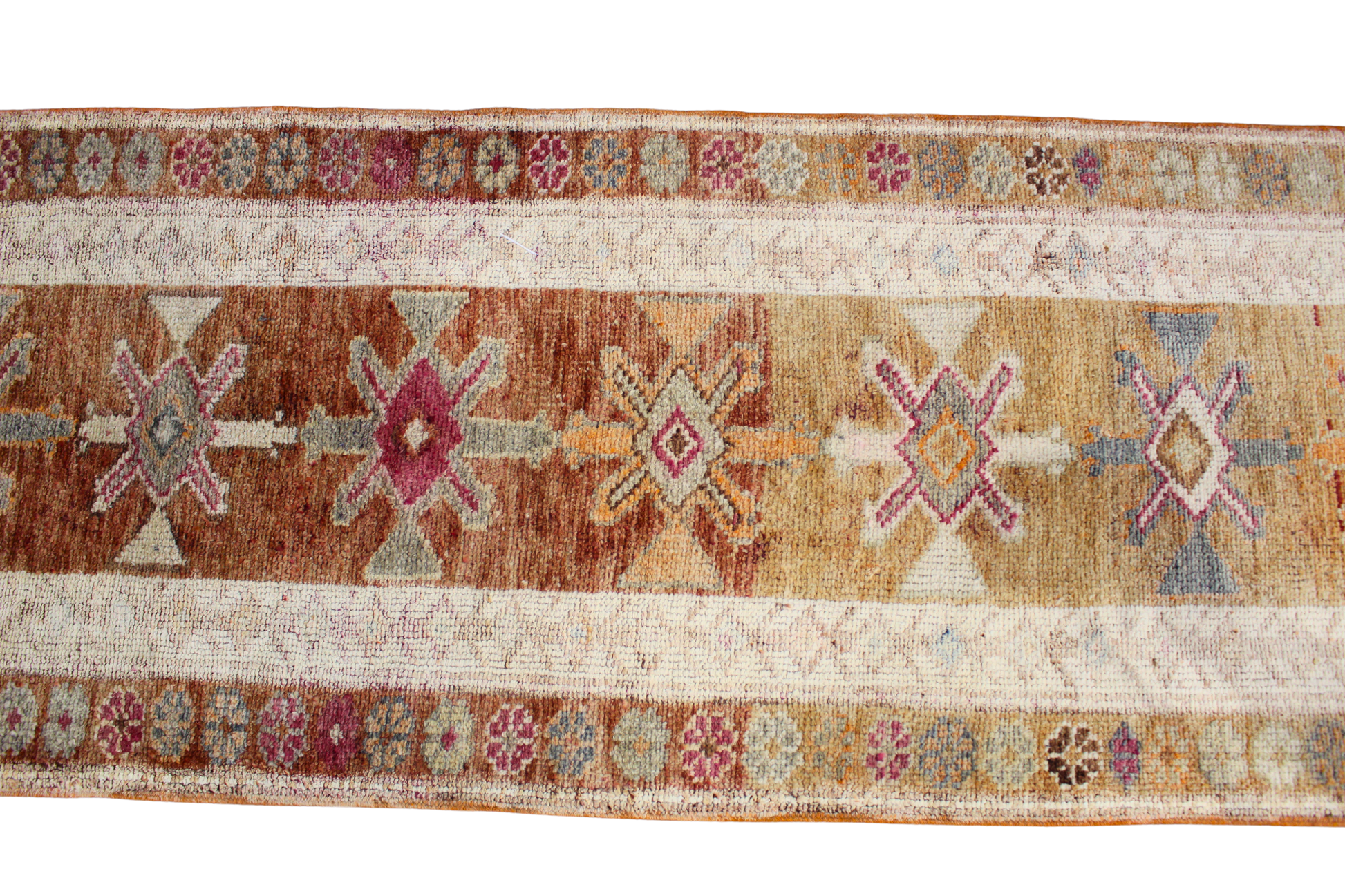 With its barely-there palette and timeworn beauty, this antique Oushak runner (2.11 × 11.6 ft) feels like a memory softened by sunlight. Rows of delicate floral rosettes and small geometric motifs drift across the rug in shades of blush, ivory, dusty gold, and faded rust, all grounded by a crimson zigzag inner border that adds a subtle rhythmic structure.