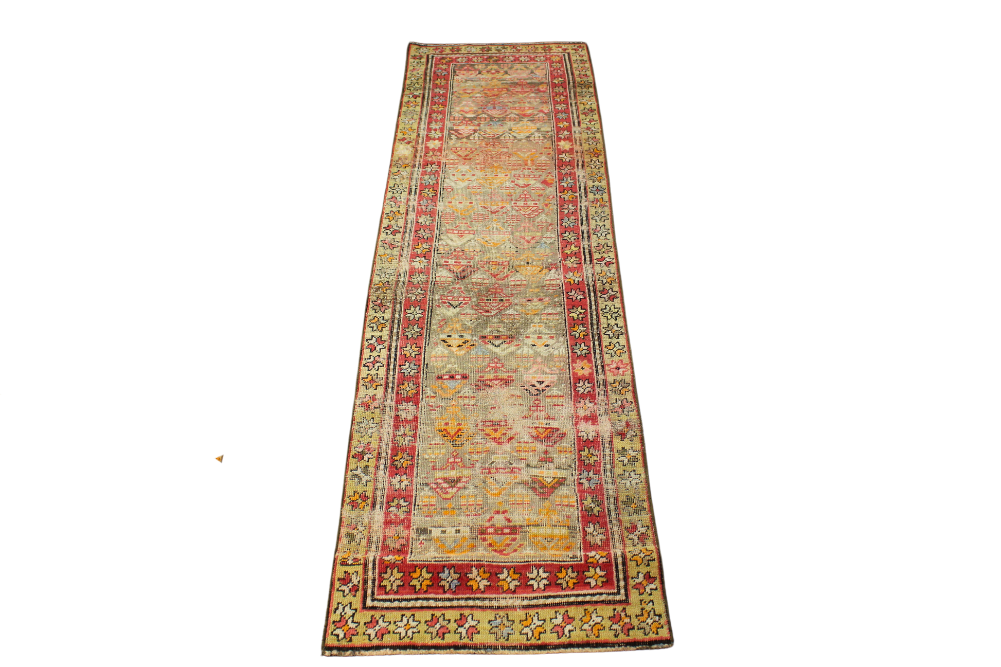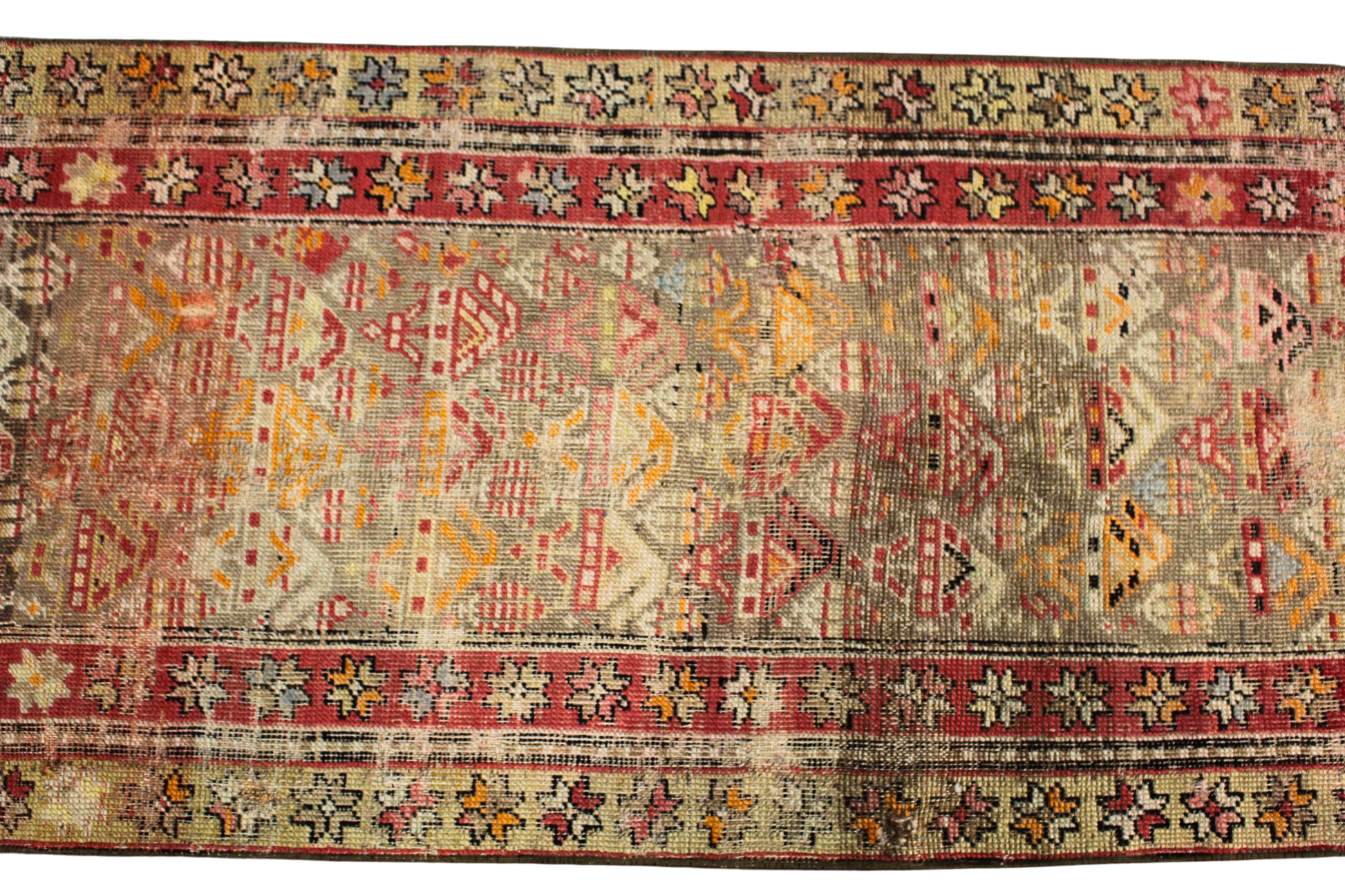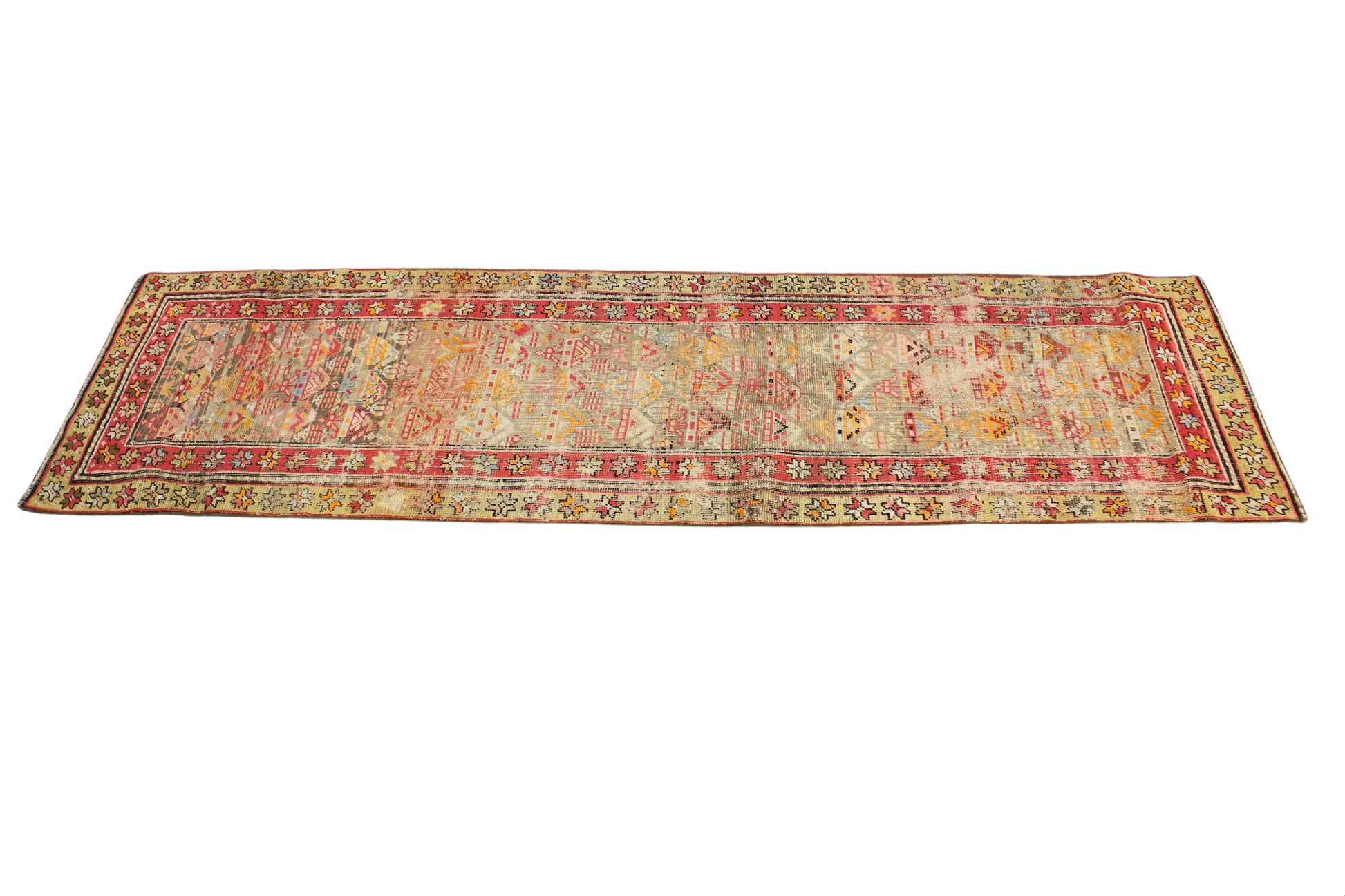 Petite in size but rich in history, this antique Turkish Oushak runner (2.1 × 7 ft) offers a lively dose of Anatolian folk art. Its central field features a softly aged lattice of geometric motifs in terracotta, ochre, and faded peach — echoing the hues of desert stone and sunbaked earth. What sets this piece apart is the bold outer border, alive with eight-pointed stars in alternating shades of ivory, saffron, olive, and crimson, framed by delicate inner guard stripes.