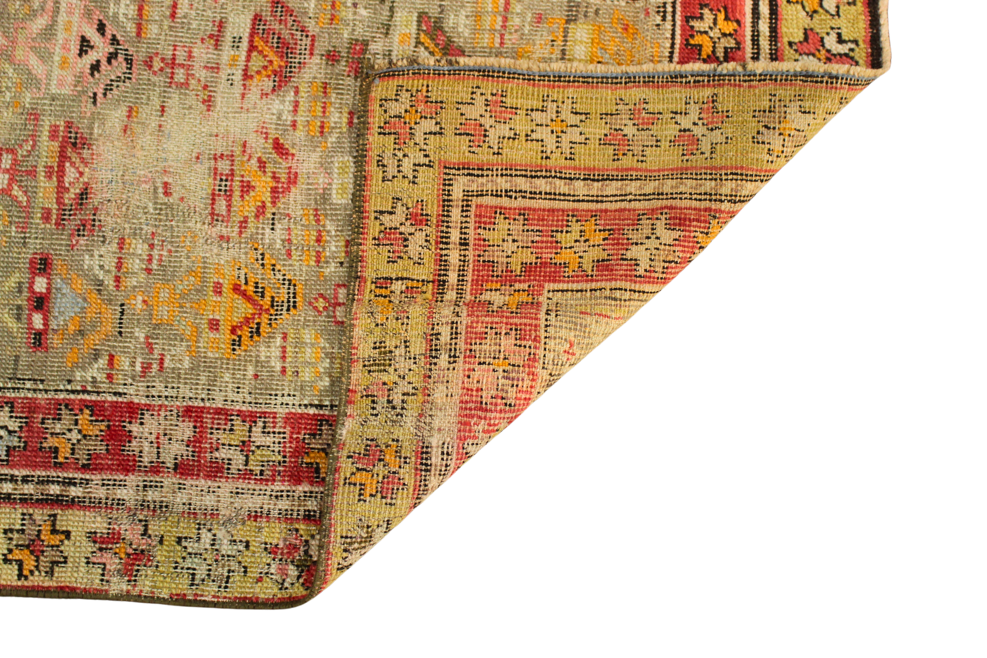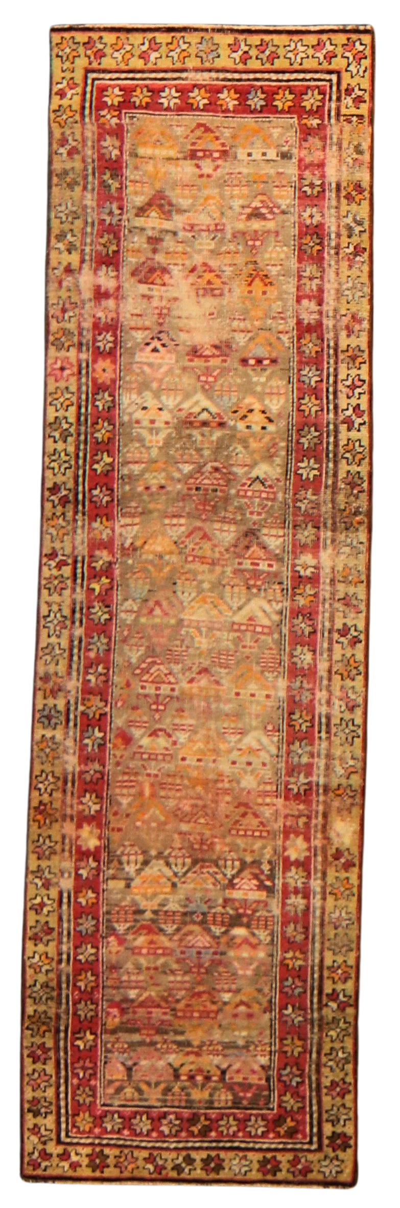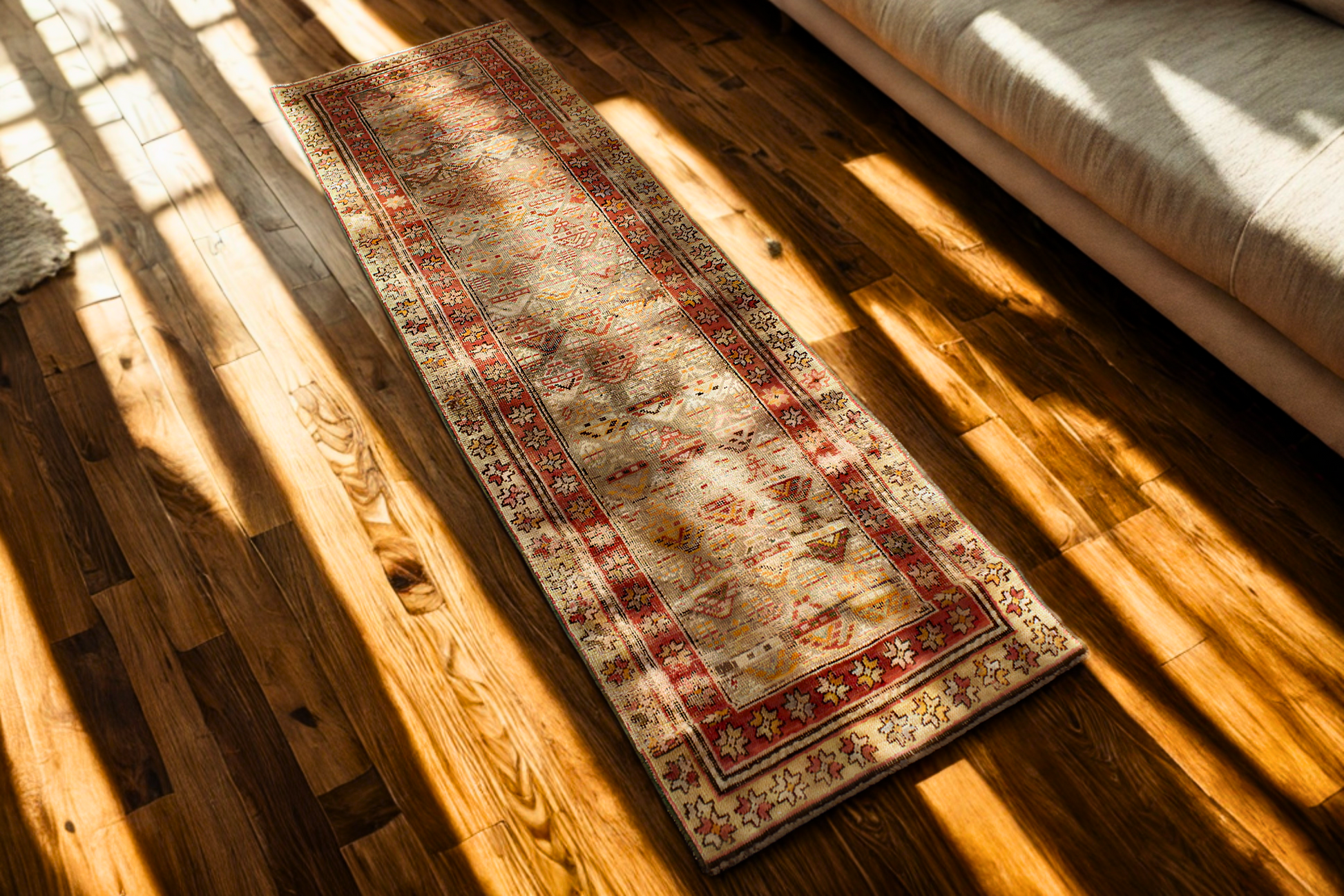 Petite in size but rich in history, this antique Turkish Oushak runner (2.1 × 7 ft) offers a lively dose of Anatolian folk art. Its central field features a softly aged lattice of geometric motifs in terracotta, ochre, and faded peach — echoing the hues of desert stone and sunbaked earth. What sets this piece apart is the bold outer border, alive with eight-pointed stars in alternating shades of ivory, saffron, olive, and crimson, framed by delicate inner guard stripes.