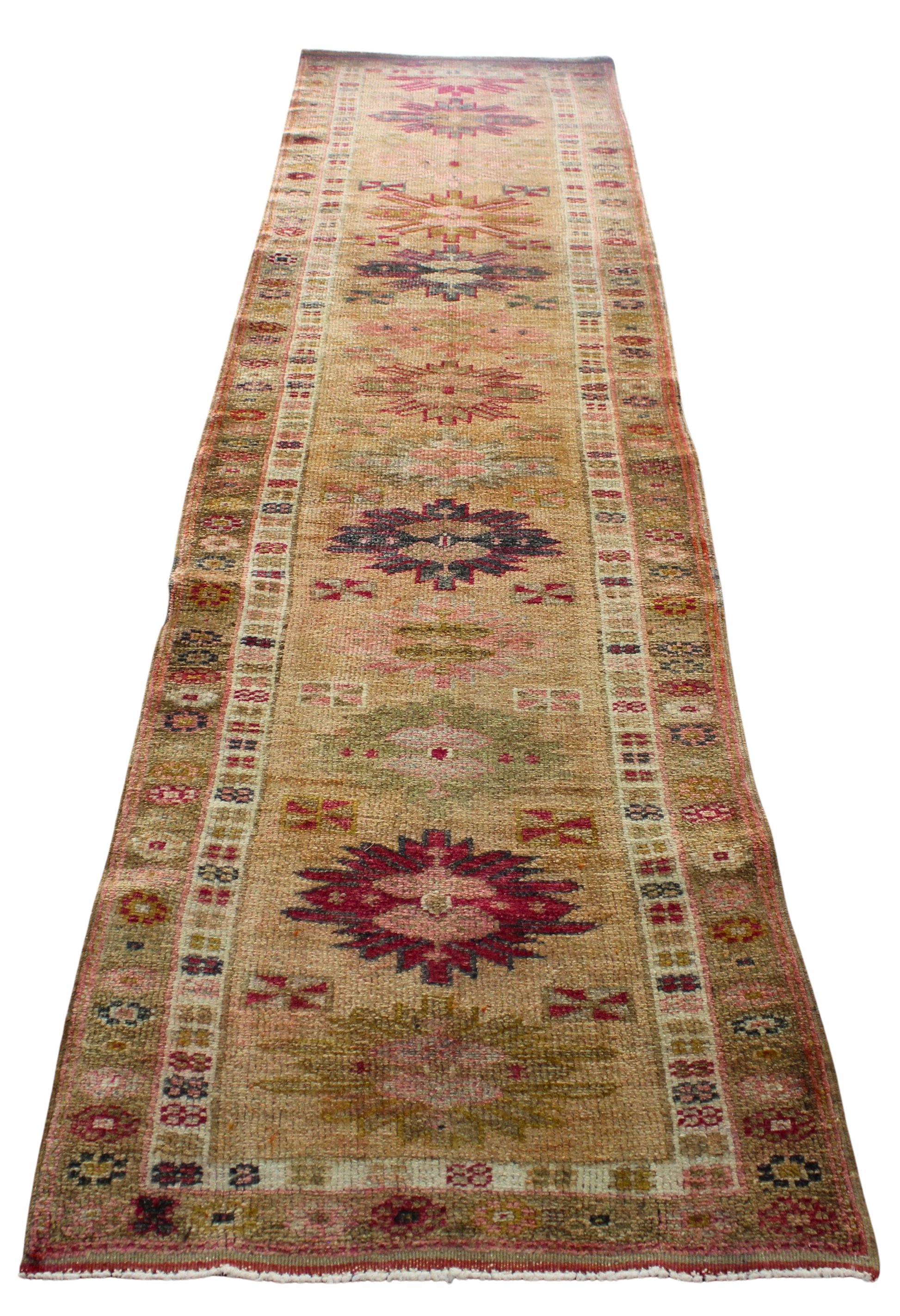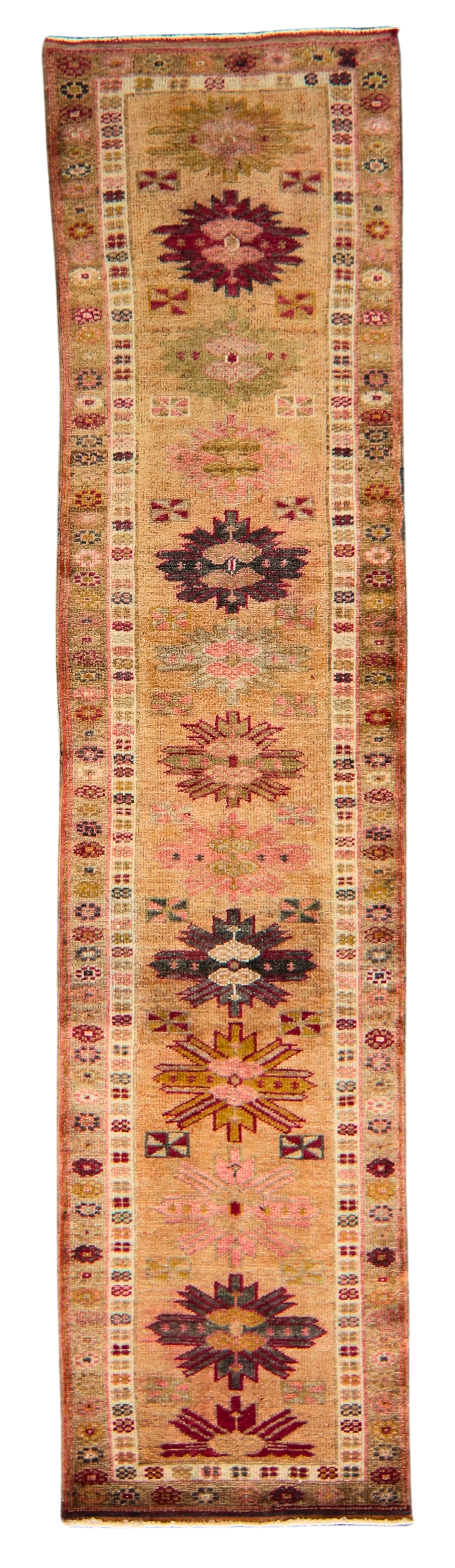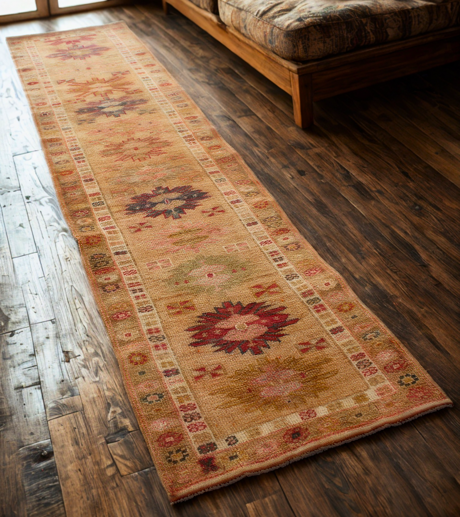 Bursting with graphic charm, this 2.9 × 11.8 ft antique Oushak runner showcases a striking medallion layout down its centerline, each motif radiating like a stylized floral star. Woven in rich reds, golden ochre, faded peach, and charcoal over a warm tan ground, the design pops with folkloric vibrance balanced by softened wear.
