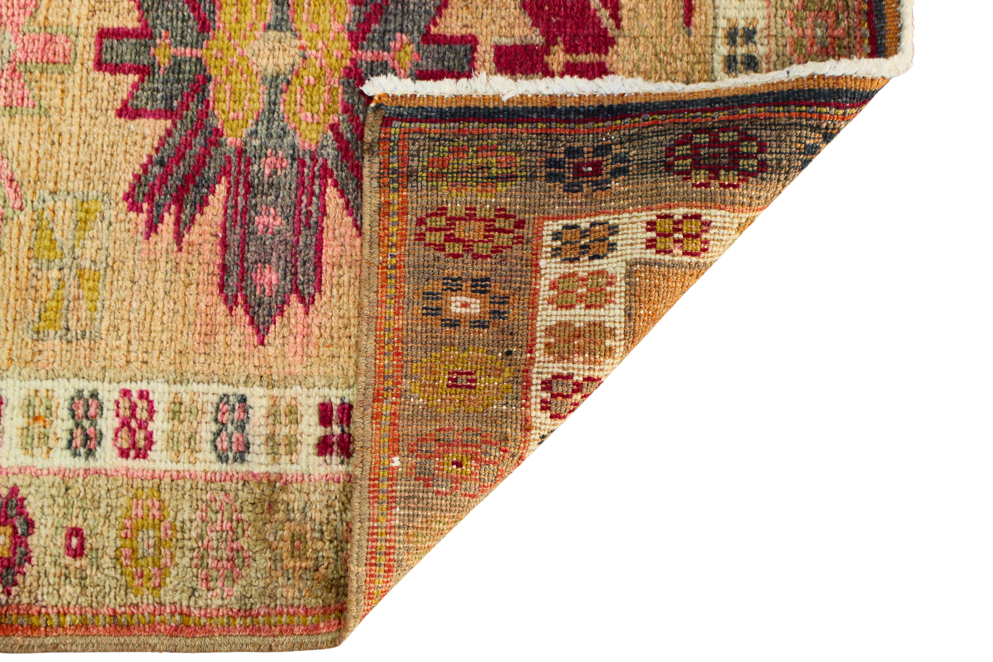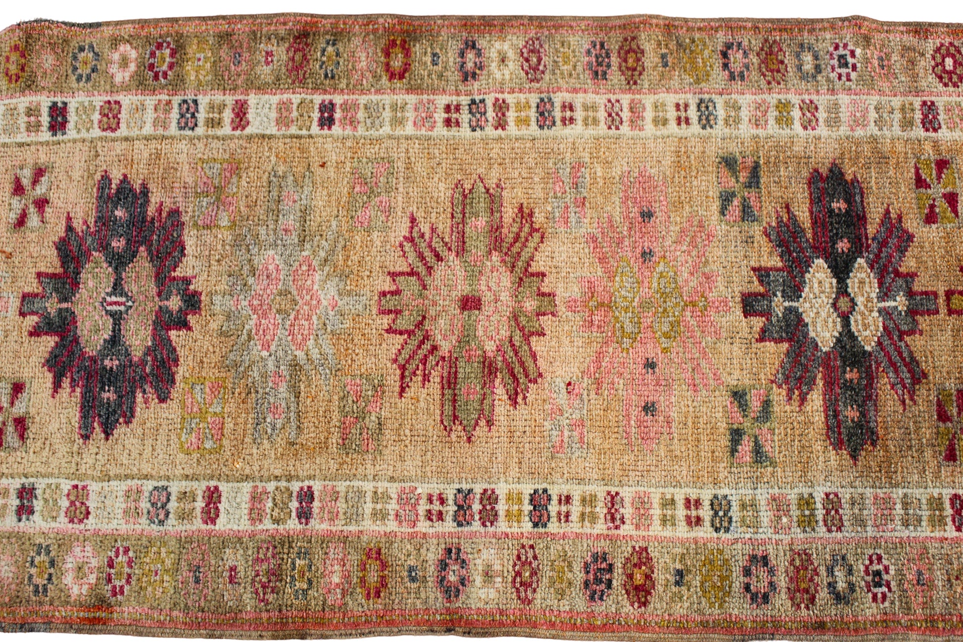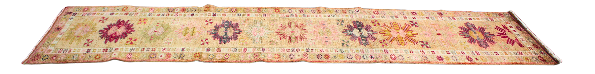 Bursting with graphic charm, this 2.9 × 11.8 ft antique Oushak runner showcases a striking medallion layout down its centerline, each motif radiating like a stylized floral star. Woven in rich reds, golden ochre, faded peach, and charcoal over a warm tan ground, the design pops with folkloric vibrance balanced by softened wear.