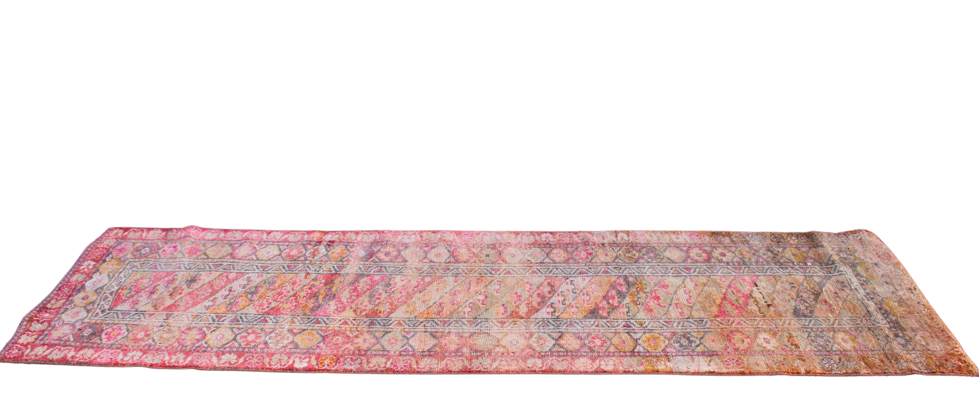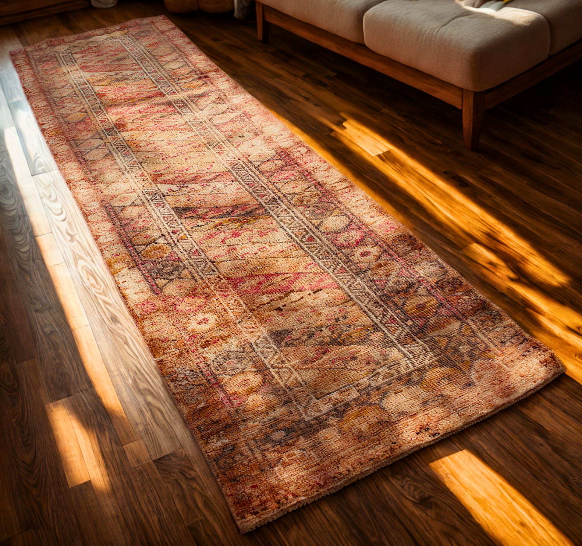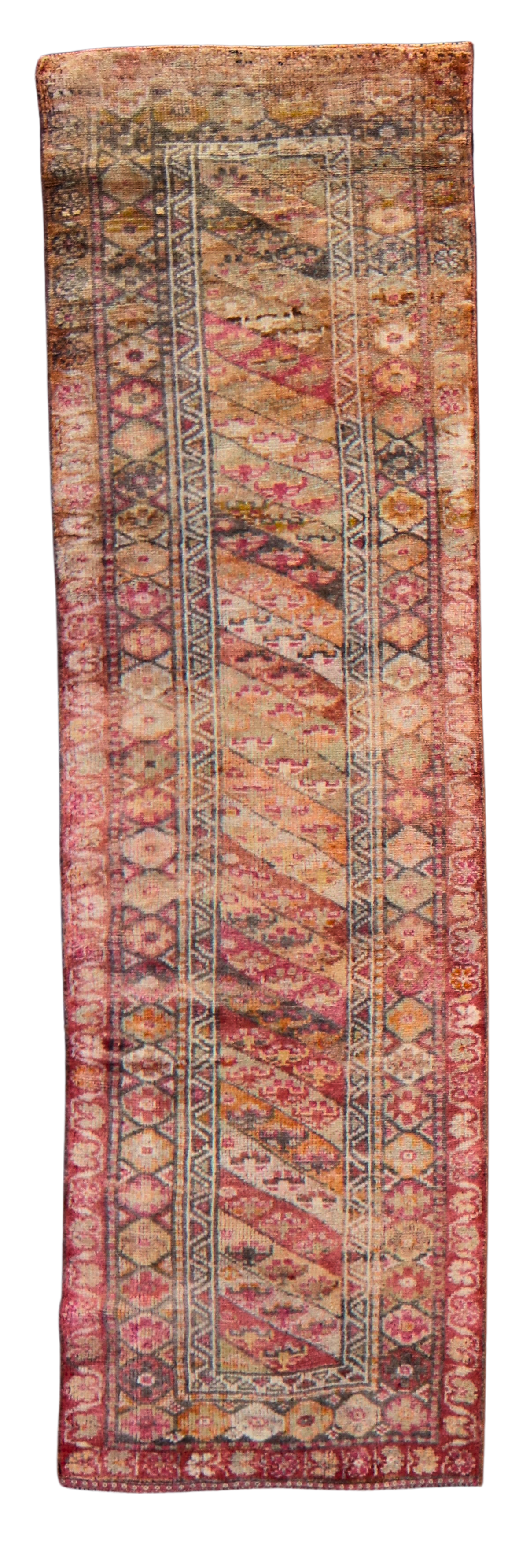 Time has worked its subtle magic on this antique 3 × 10 ft Turkish Oushak runner, softening its once-bright palette into a romantic wash of coral, dusty pink, faded gold, and stormy indigo. The diagonal lattice pattern, characteristic of village weaving, flows gracefully down the field, bordered by linked medallions and floral rosettes that whisper of Anatolian craftsmanship.