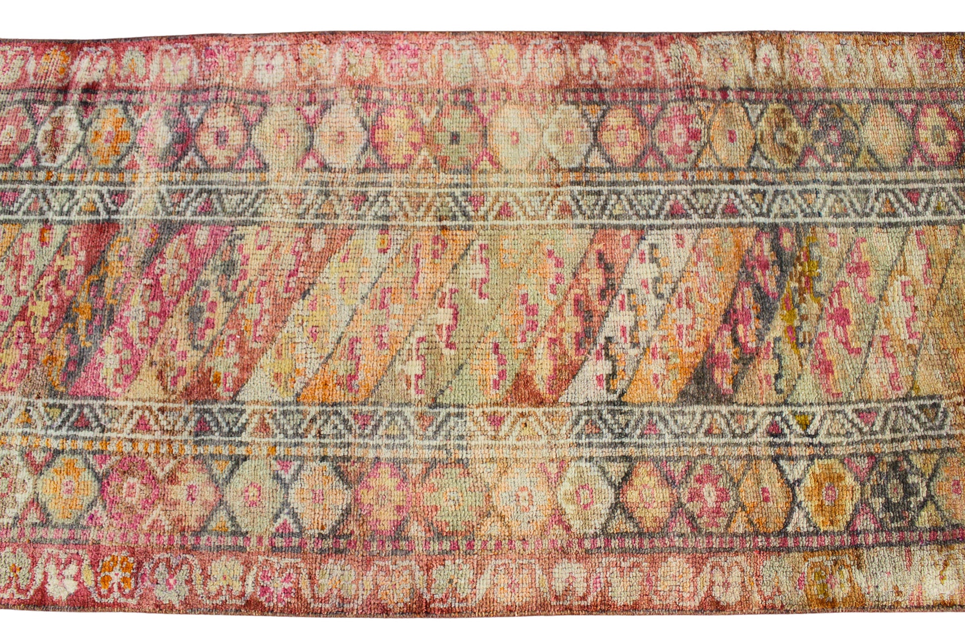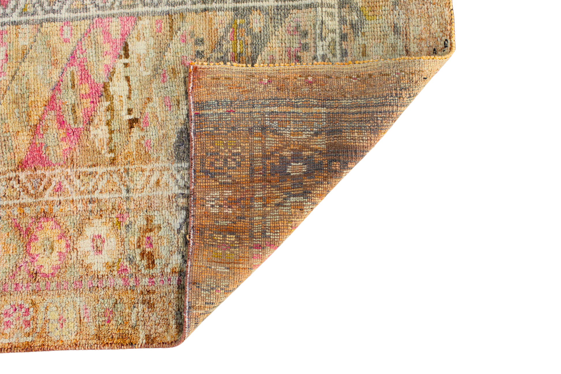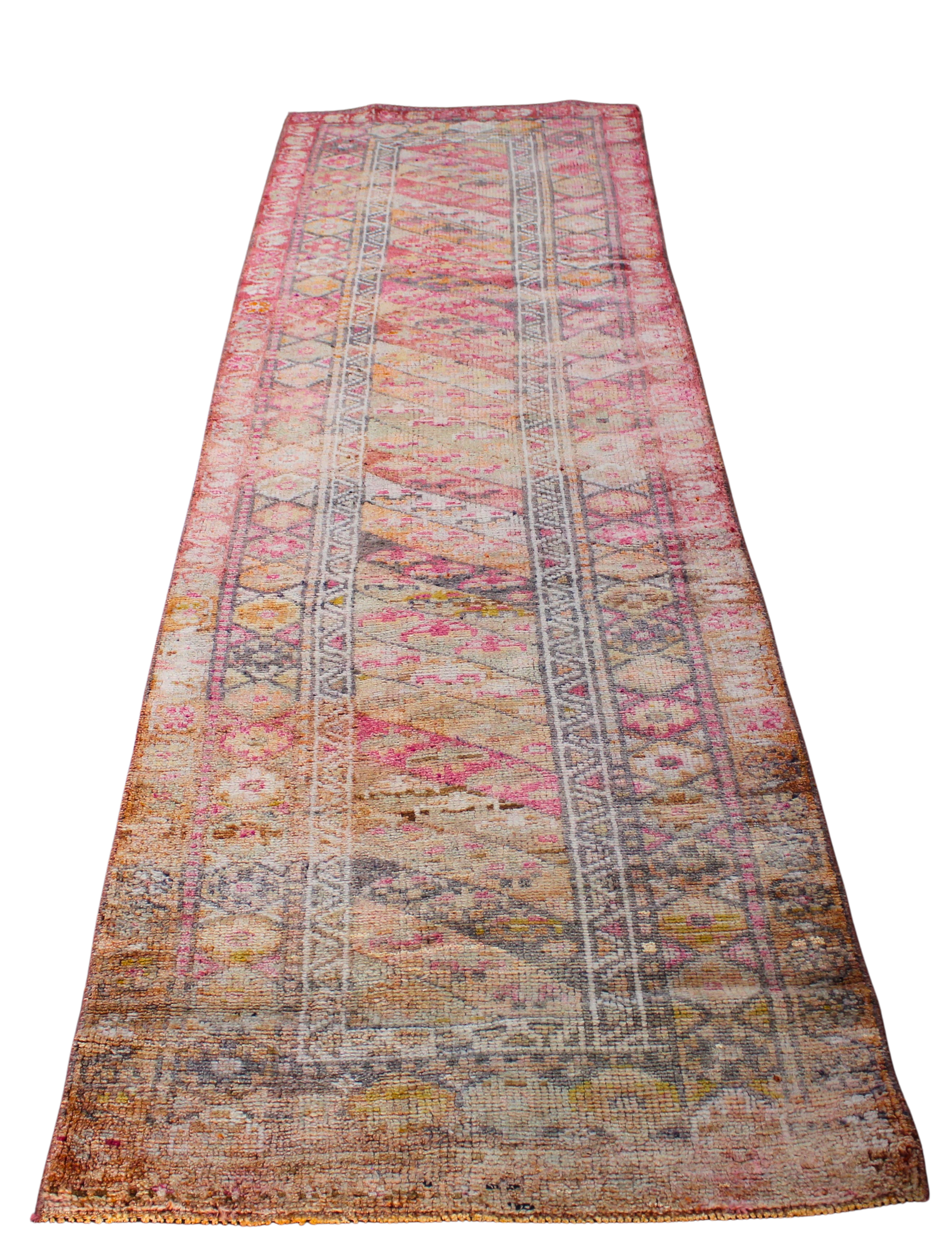 Time has worked its subtle magic on this antique 3 × 10 ft Turkish Oushak runner, softening its once-bright palette into a romantic wash of coral, dusty pink, faded gold, and stormy indigo. The diagonal lattice pattern, characteristic of village weaving, flows gracefully down the field, bordered by linked medallions and floral rosettes that whisper of Anatolian craftsmanship.