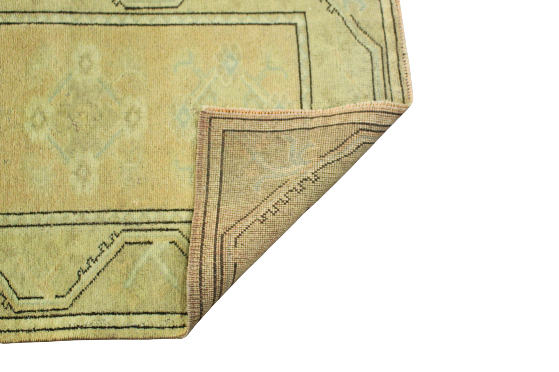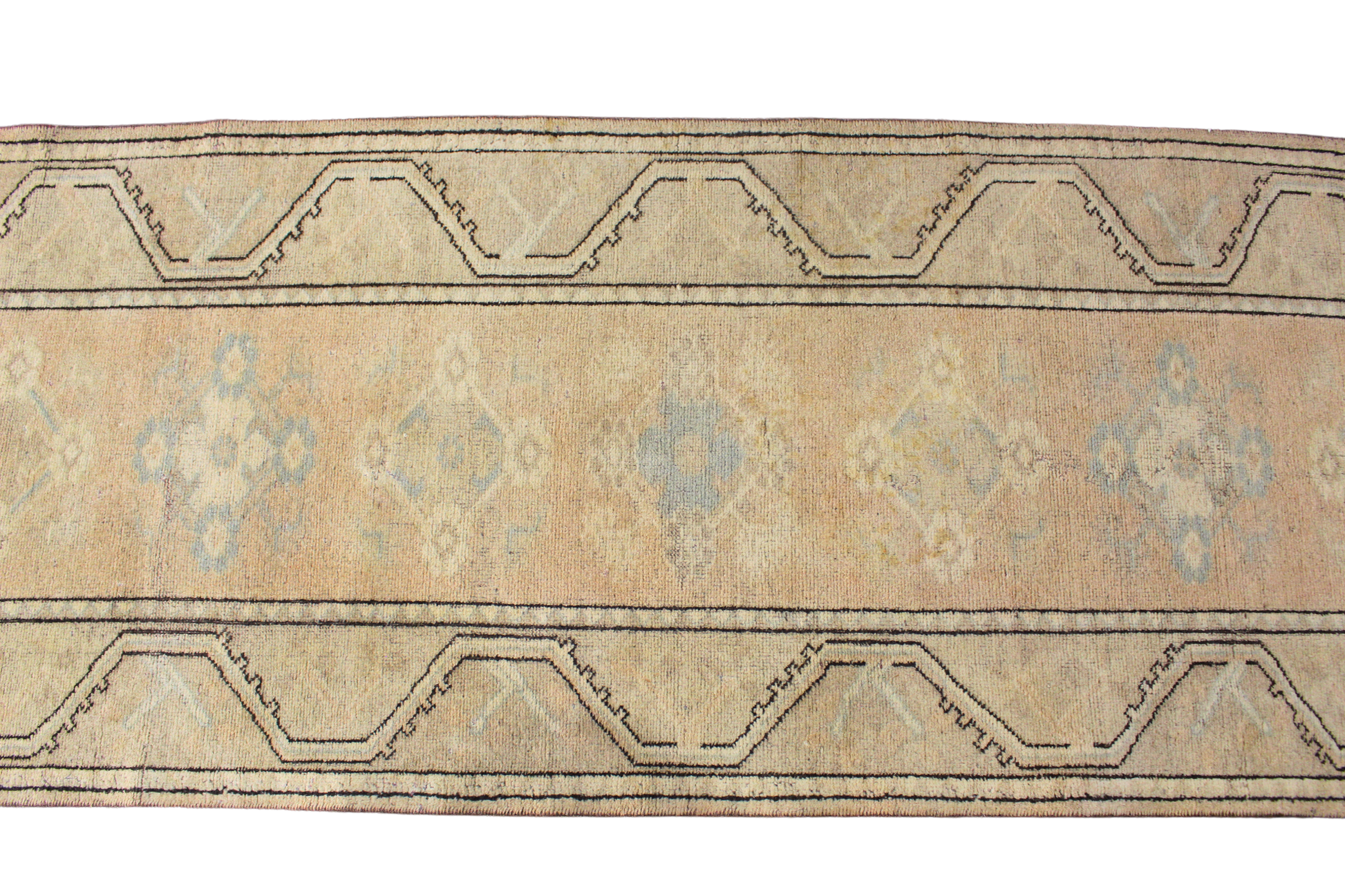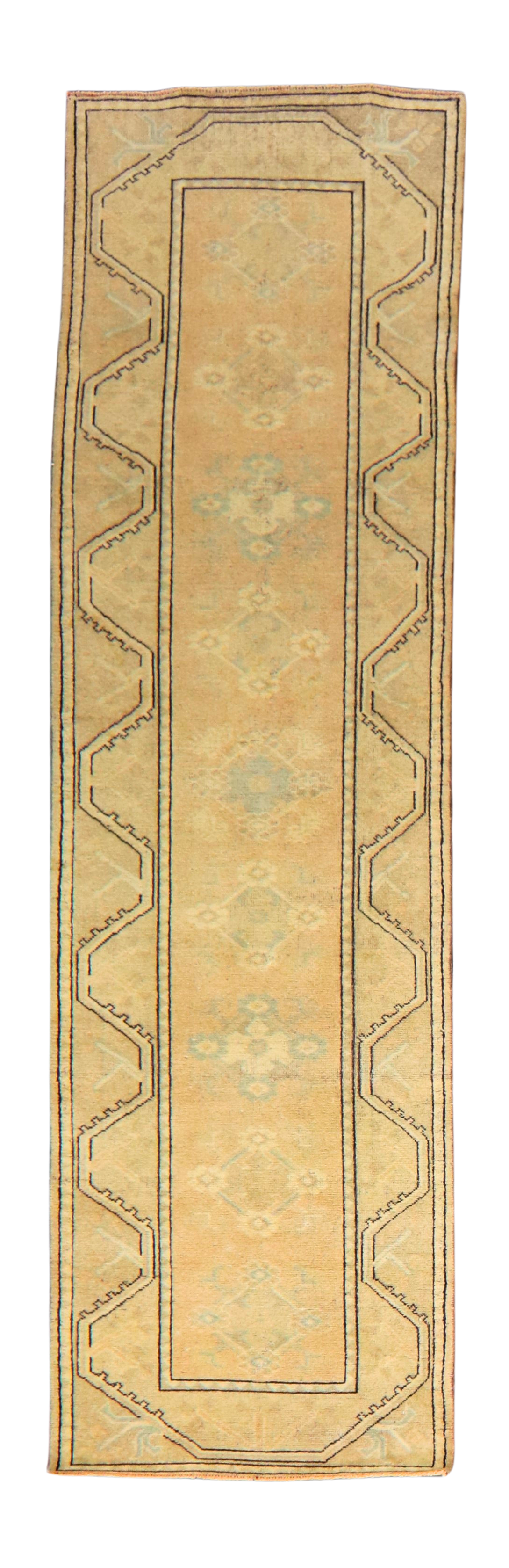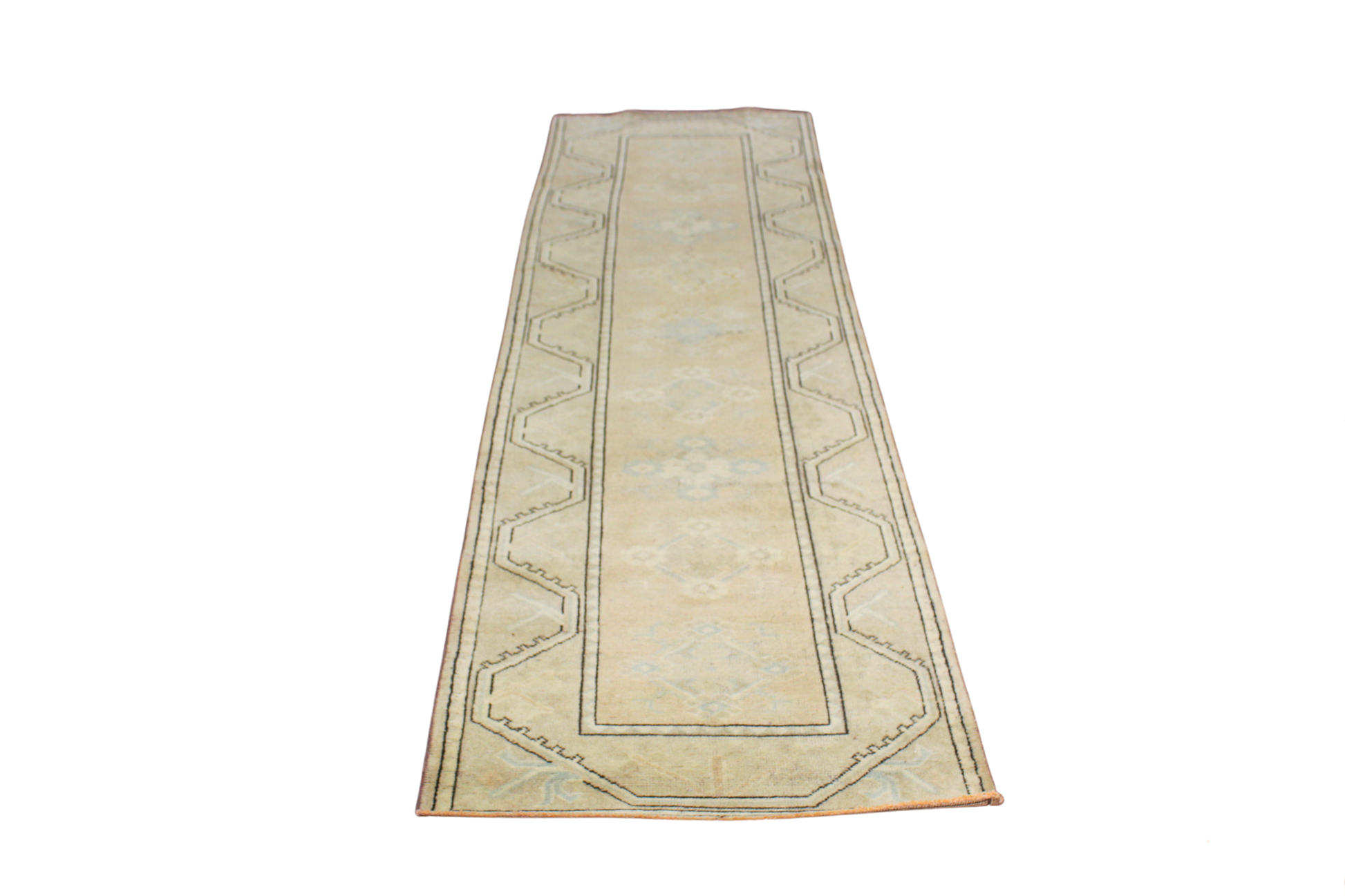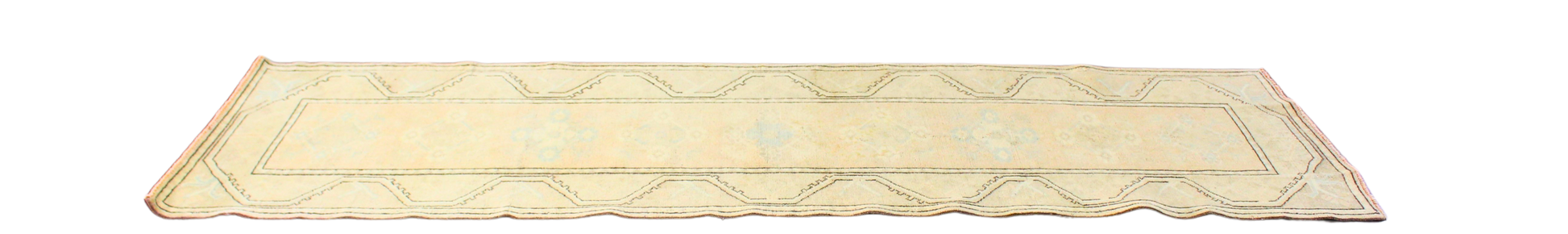 Graceful and understated, this 2.9 × 9.3 ft Oushak runner features a rare palette of cool celadon, driftwood beige, and faded ivory that brings an airy elegance to any space. The open central field holds faint geometric medallions in barely-there blues and creams, enclosed by zigzagging side borders that add rhythm without overwhelming the composition.