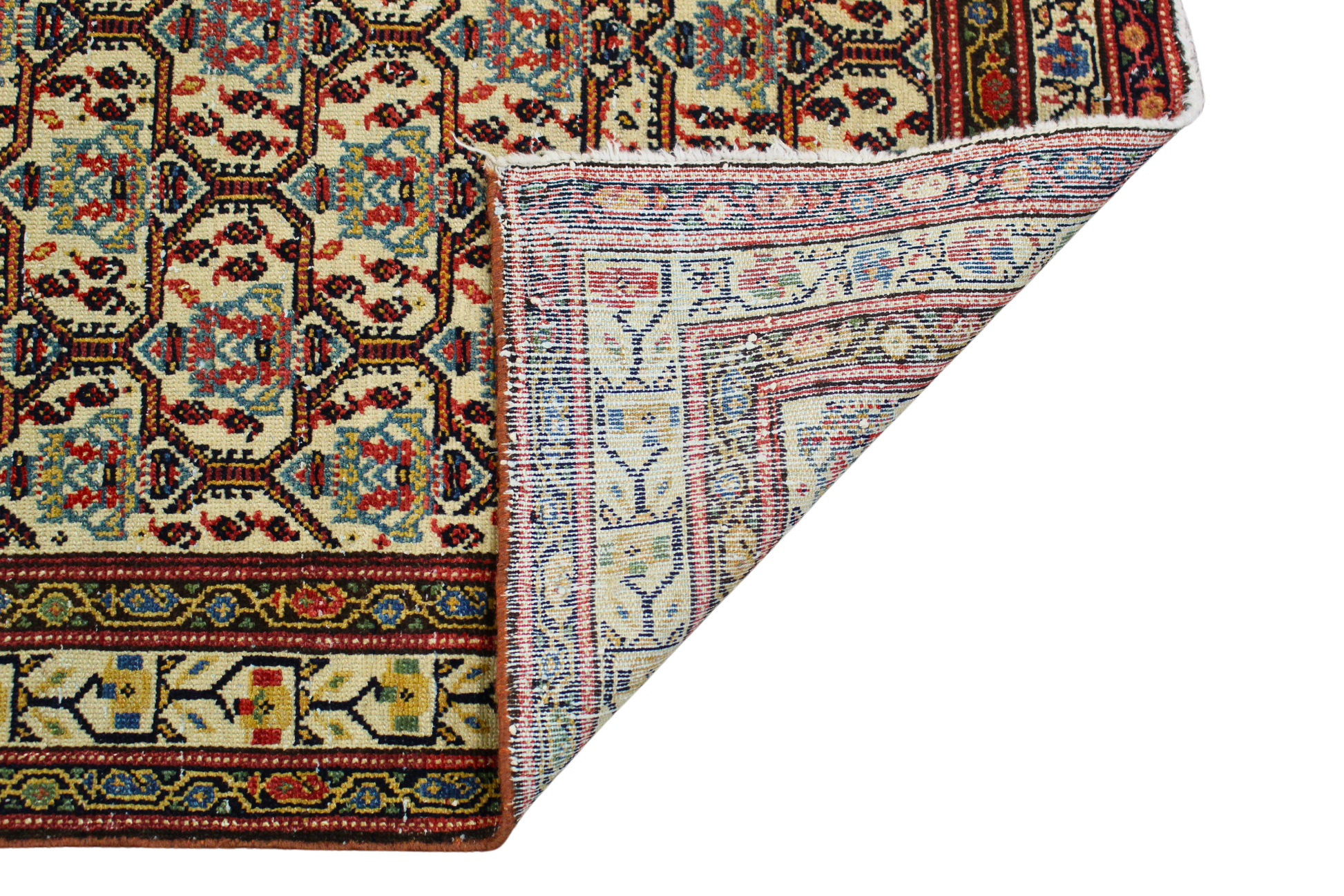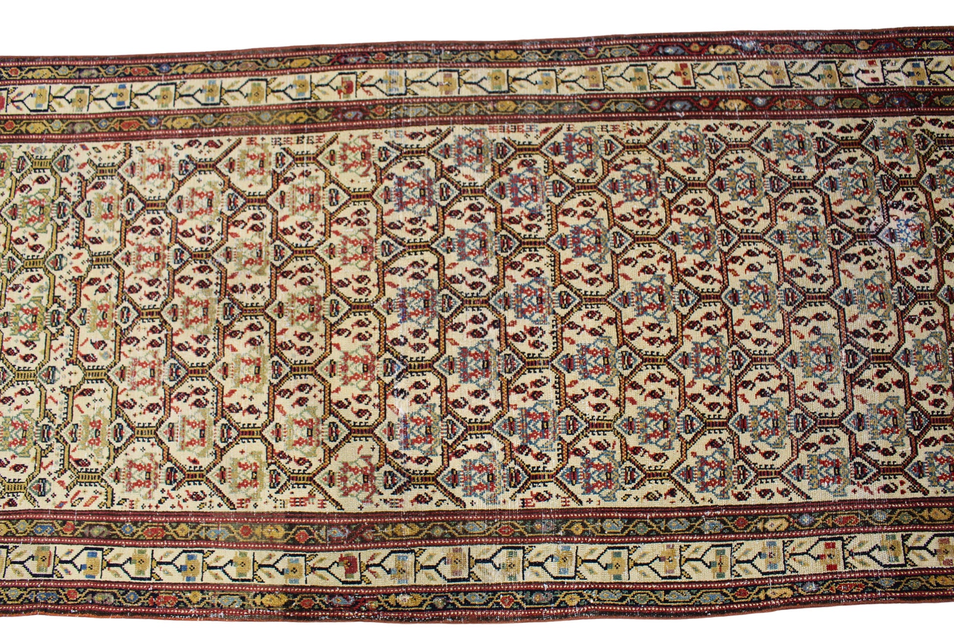 This striking antique Malayer runner (3.3 × 12.8 ft) showcases the rich heritage of Persian village weaving with its densely detailed latticework design. The field features a repeating pattern of lozenge-shaped medallions, each enclosing floral rosettes and vine scrolls, all set against a creamy ivory ground. Subtle shades of dusty rose, faded teal, walnut brown, and sky blue bring layered elegance to this traditional piece.