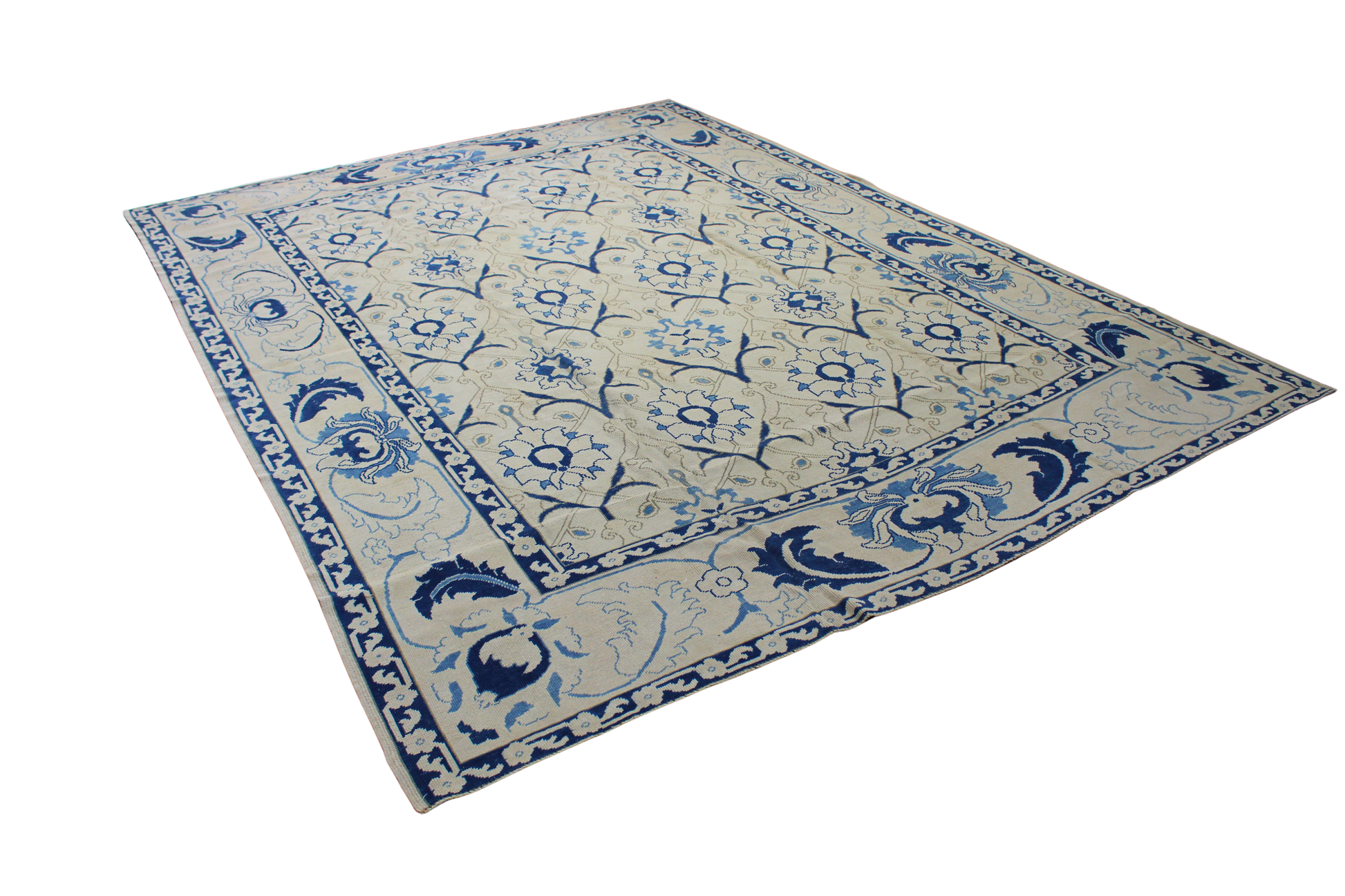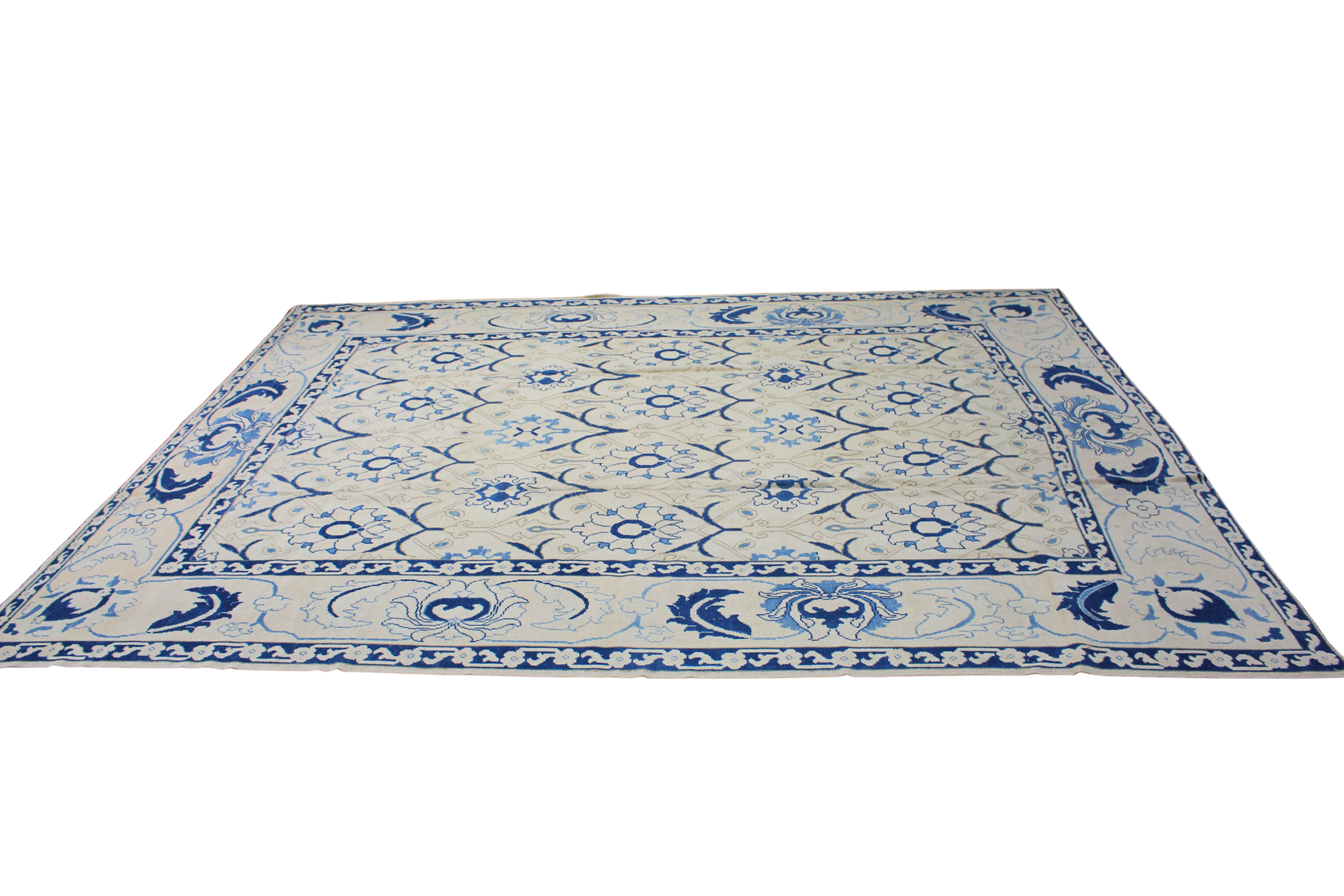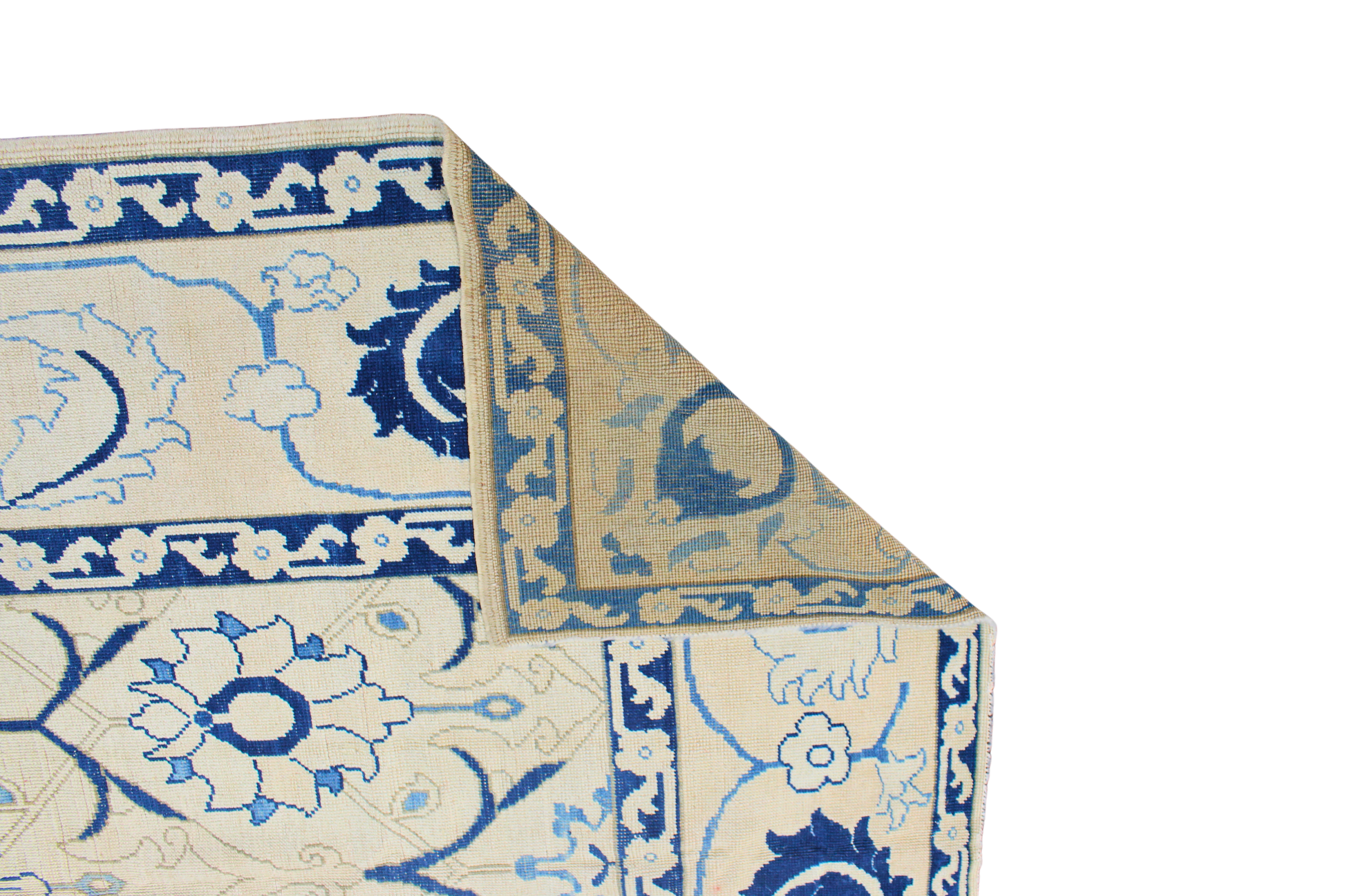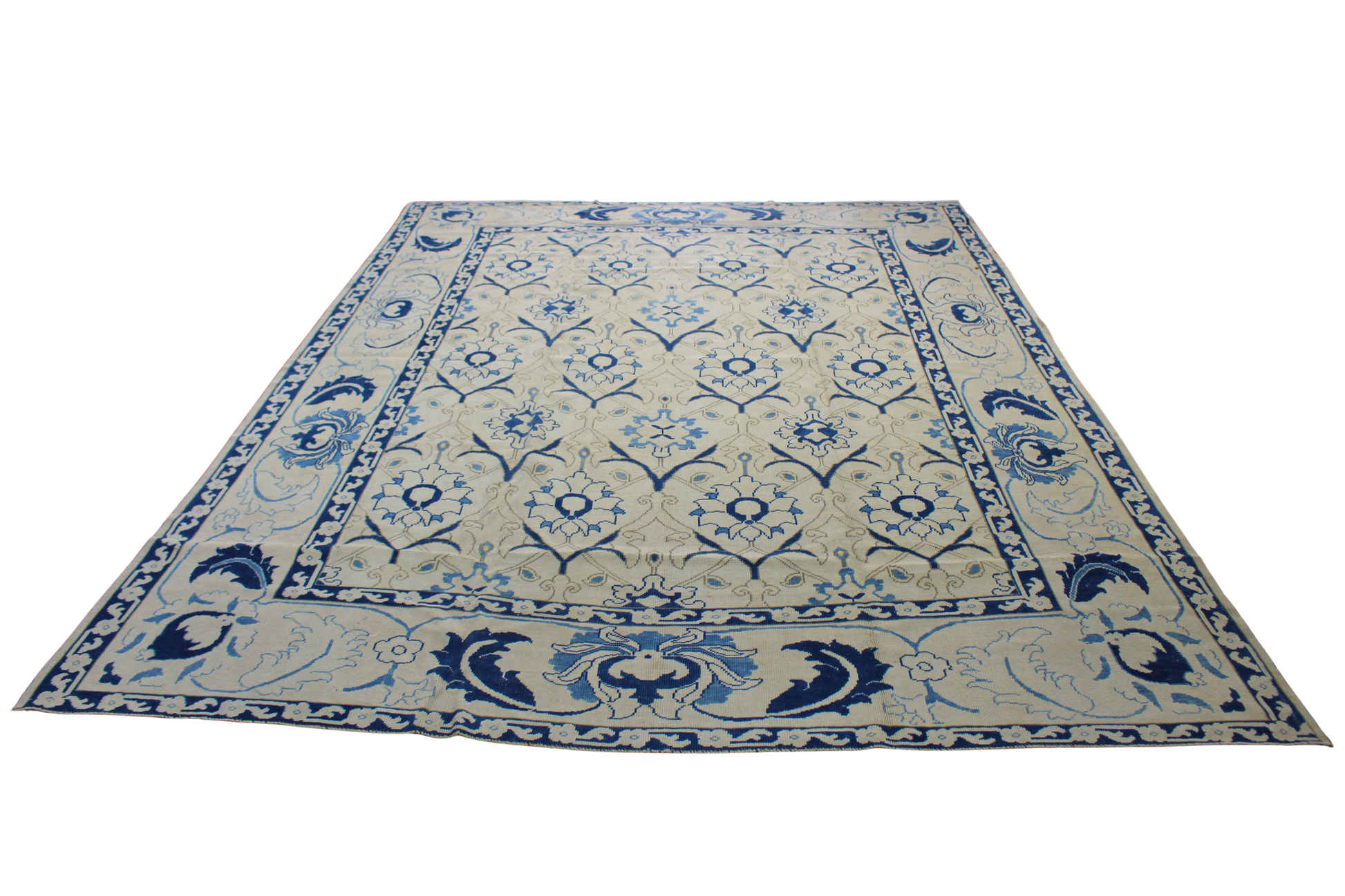 Elegant and commanding, this antique Oushak rug from Turkey (9′6″ × 12′3″) is a refined example of classical design executed with striking clarity. Its luminous ivory field hosts a sophisticated arrangement of tulip-like rosettes and scrolling vines, forming a rhythmic lattice pattern rendered in deep navy, slate blue, and soft teal, accented by subtle touches of coral red.