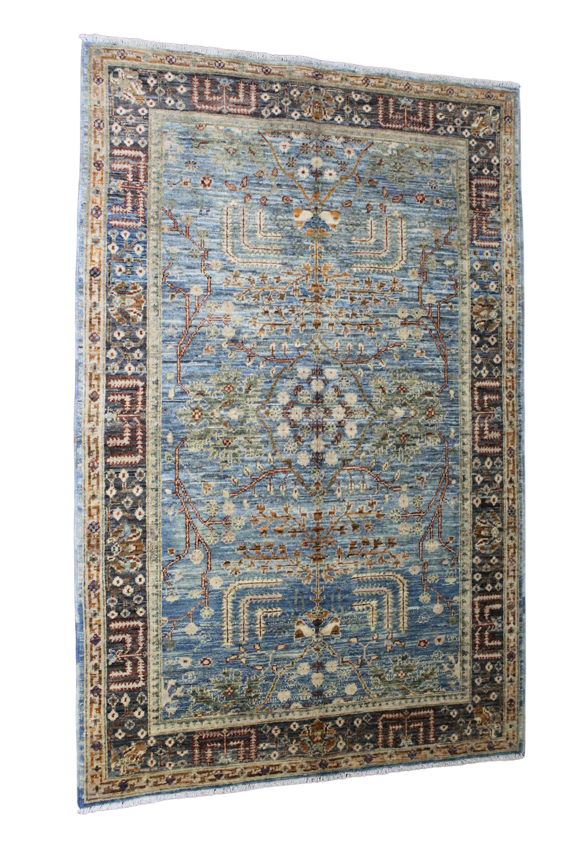 This 4.1 × 6.2 ft Aryana rug from Afghanistan exudes refined elegance with its tranquil blue field and intricate botanical patterning. The symmetrical latticework of vines, blossoms, and angular motifs gives the piece a sophisticated yet organic feel, enhanced by the artful contrast between icy blue, muted ivory, soft olive, and hints of rust.