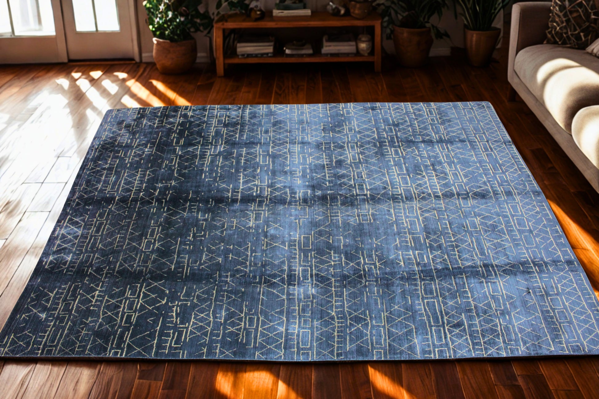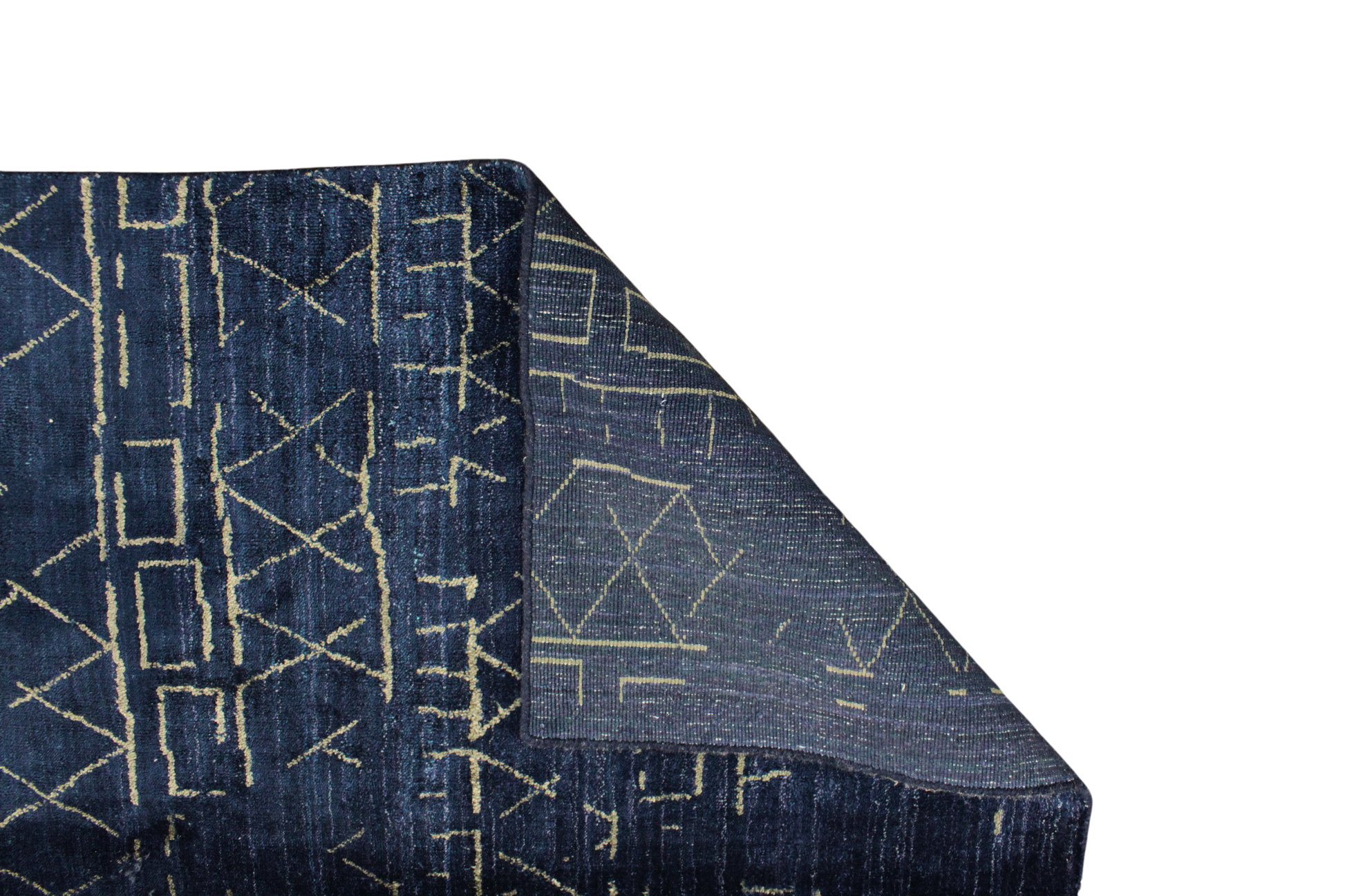 The hand-knotted wool construction gives it a rich, tactile depth, while the deep blue palette adds a dramatic edge — ideal for interiors that lean minimalist, bohemian, or global-chic.