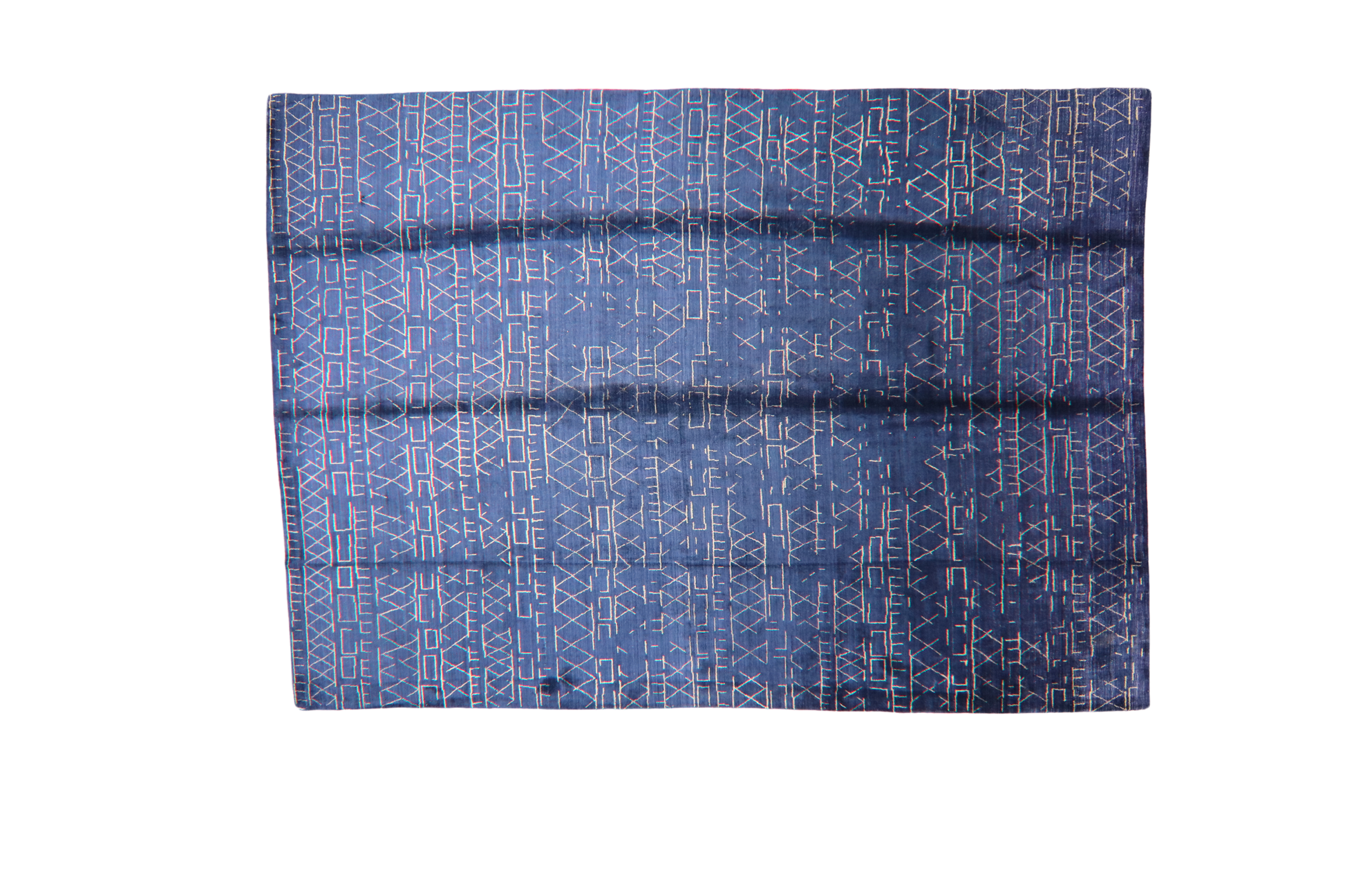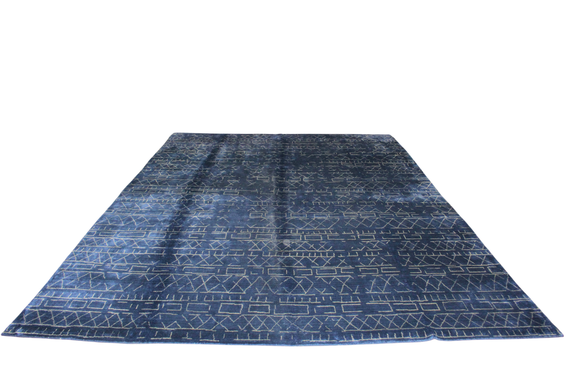 Striking and sophisticated, this 9.10 × 13.11 ft modern Nepali rug anchors a room with its bold indigo base and abstract linear motifs. The tribal-inspired white patterning dances rhythmically across the surface, creating a visual dialogue between geometry and texture.