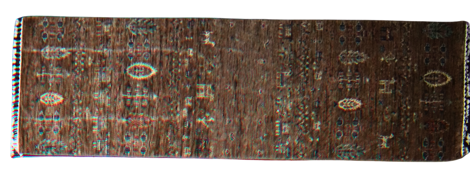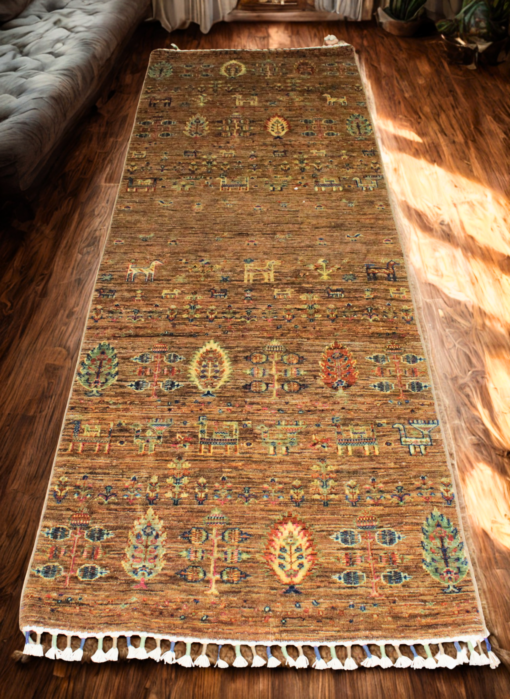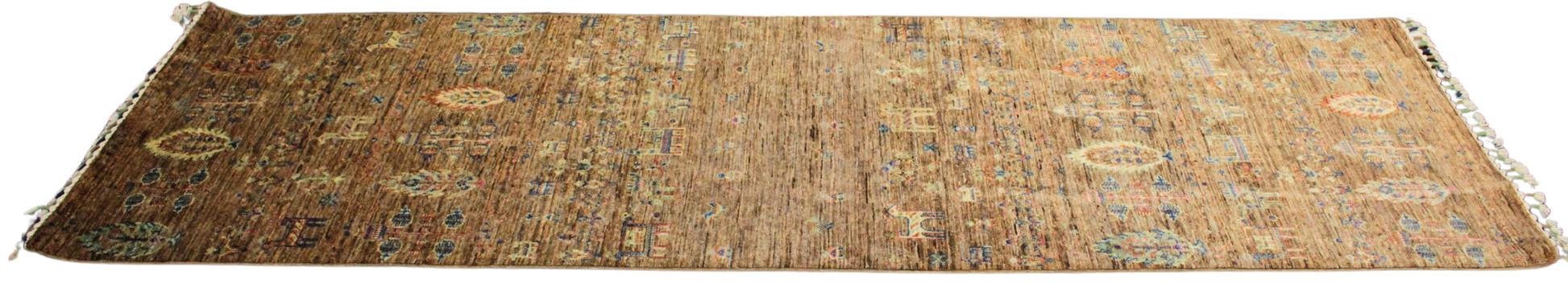 With a deep, earthy brown field and jewel-toned motifs, this Afghan Tabriz runner evokes the magic of a moonlit garden. Its scattered florals, geometric medallions, and botanical symbols feel like glowing embers against a dark soil backdrop. The rich, low-contrast palette and intricate detailing give it a grounded, modern elegance that works beautifully in transitional or contemporary spaces.