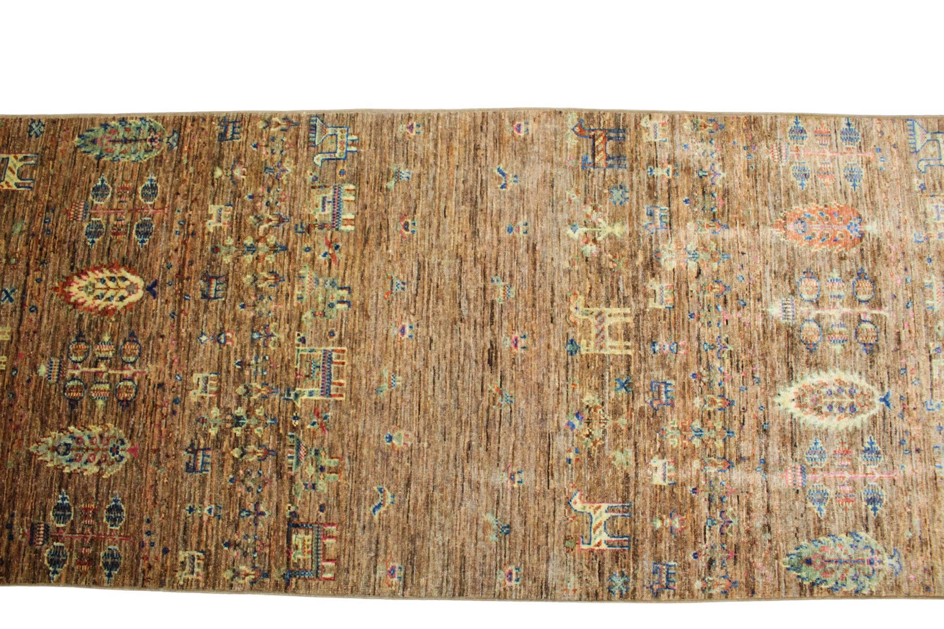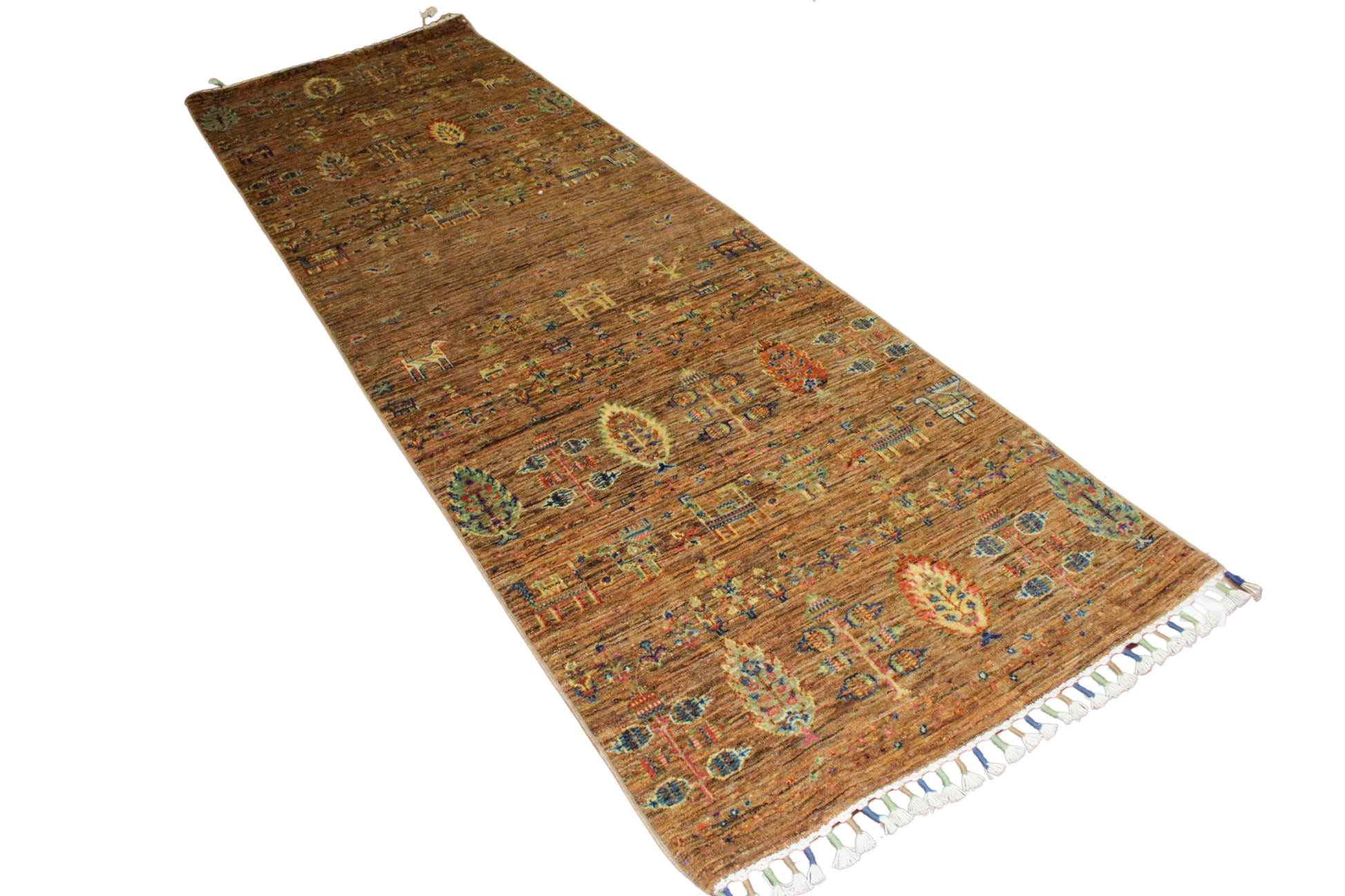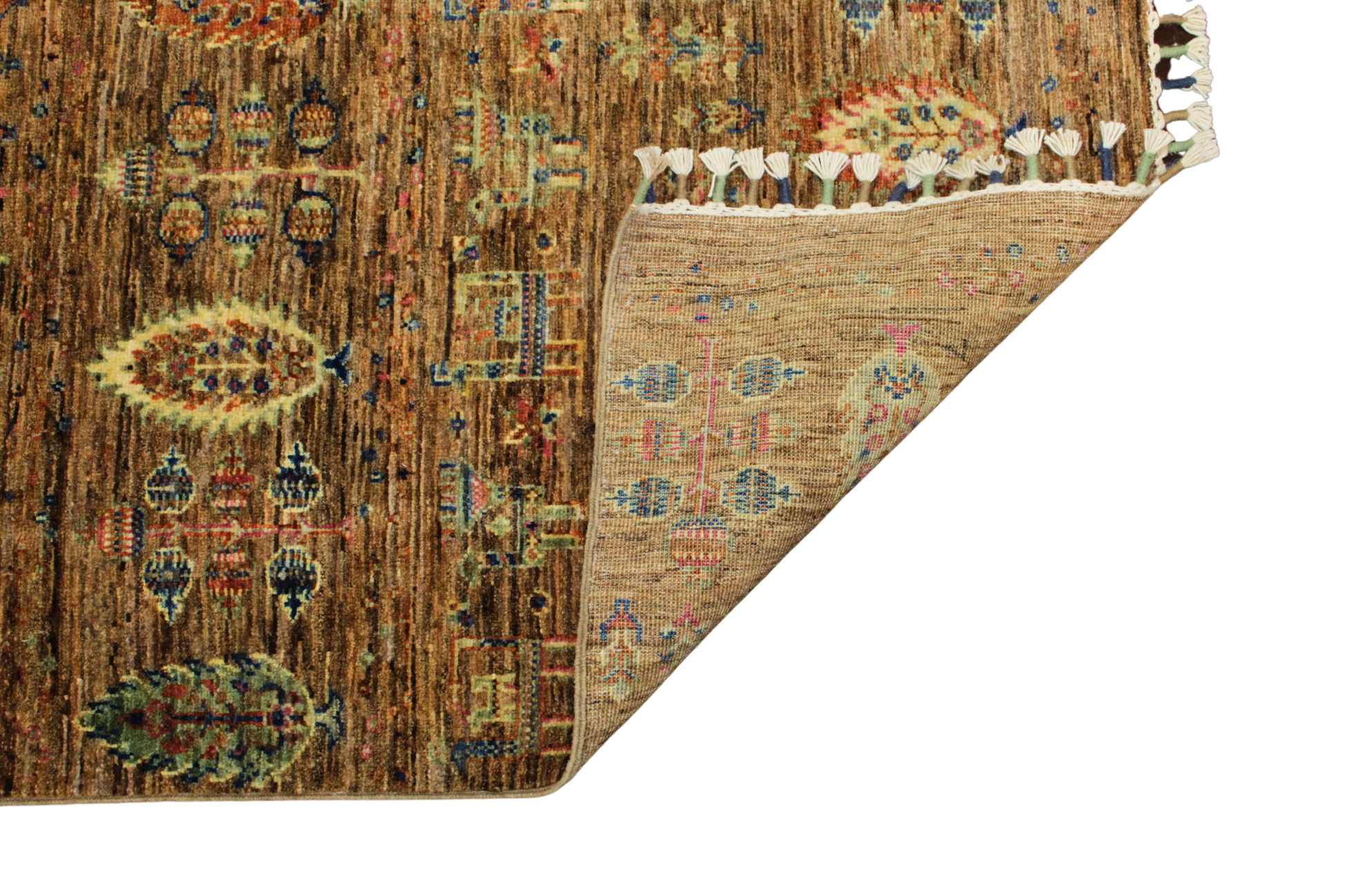 With a deep, earthy brown field and jewel-toned motifs, this Afghan Tabriz runner evokes the magic of a moonlit garden. Its scattered florals, geometric medallions, and botanical symbols feel like glowing embers against a dark soil backdrop. The rich, low-contrast palette and intricate detailing give it a grounded, modern elegance that works beautifully in transitional or contemporary spaces.