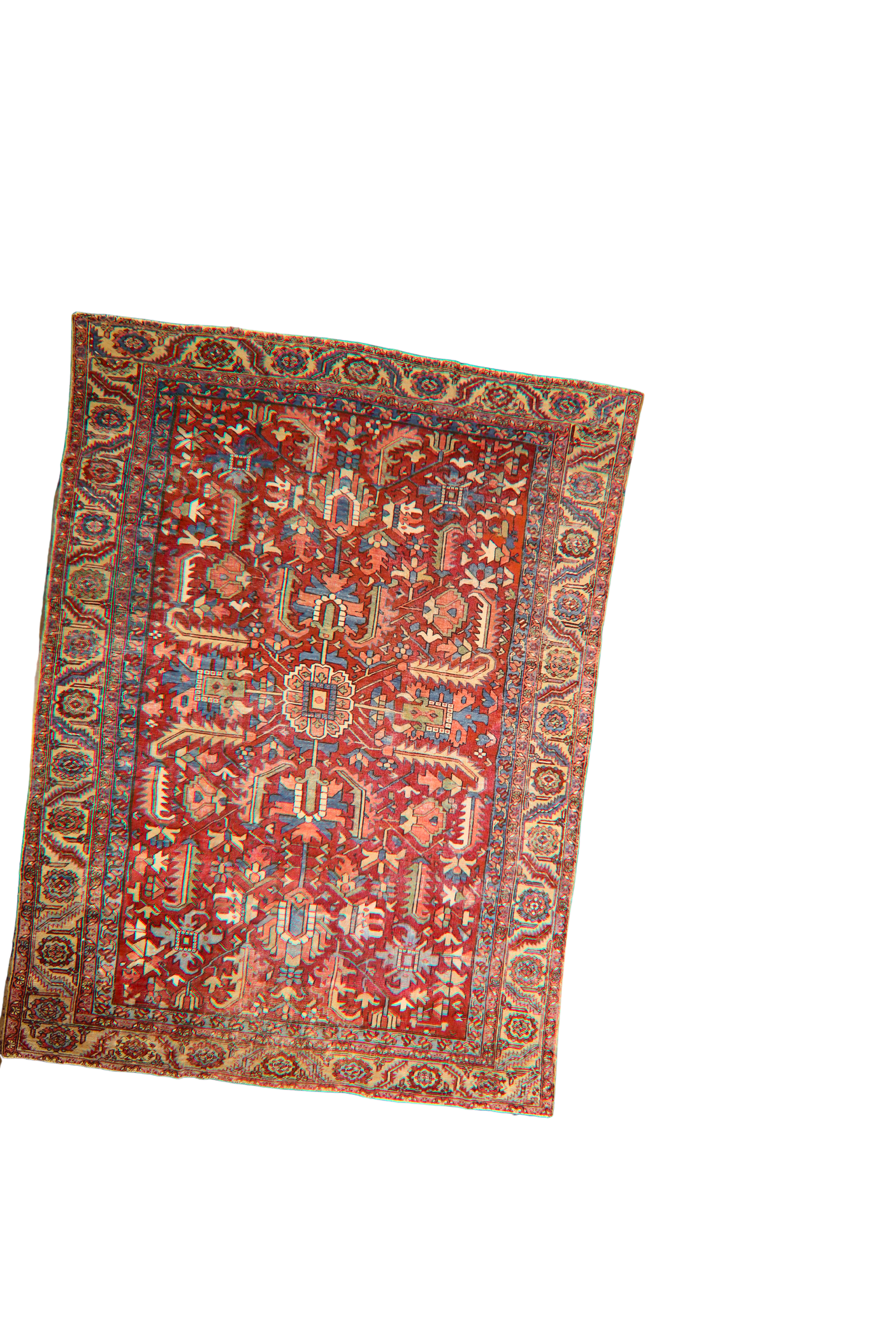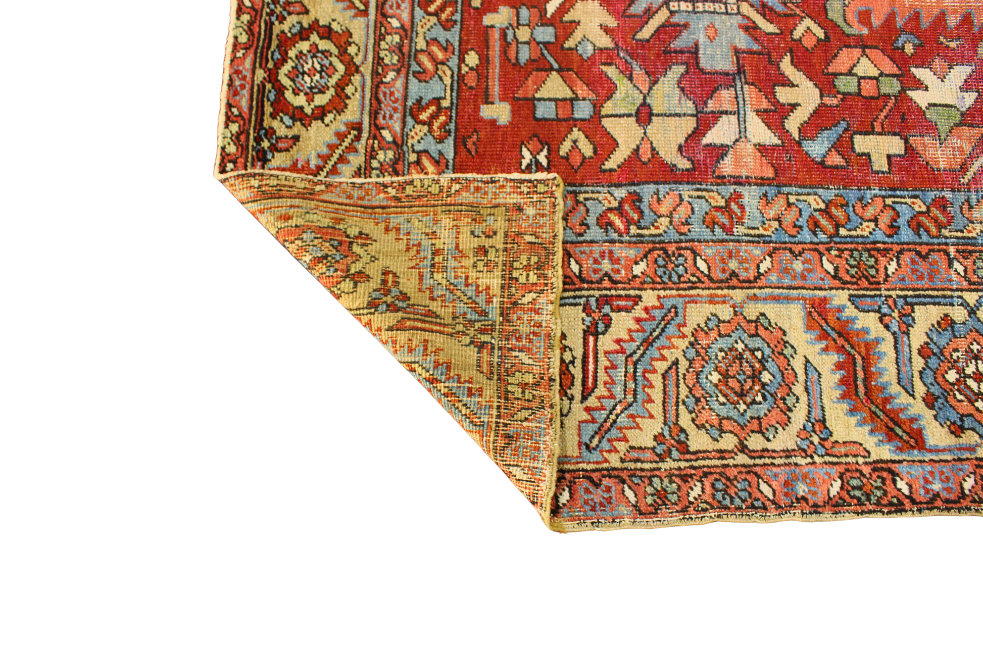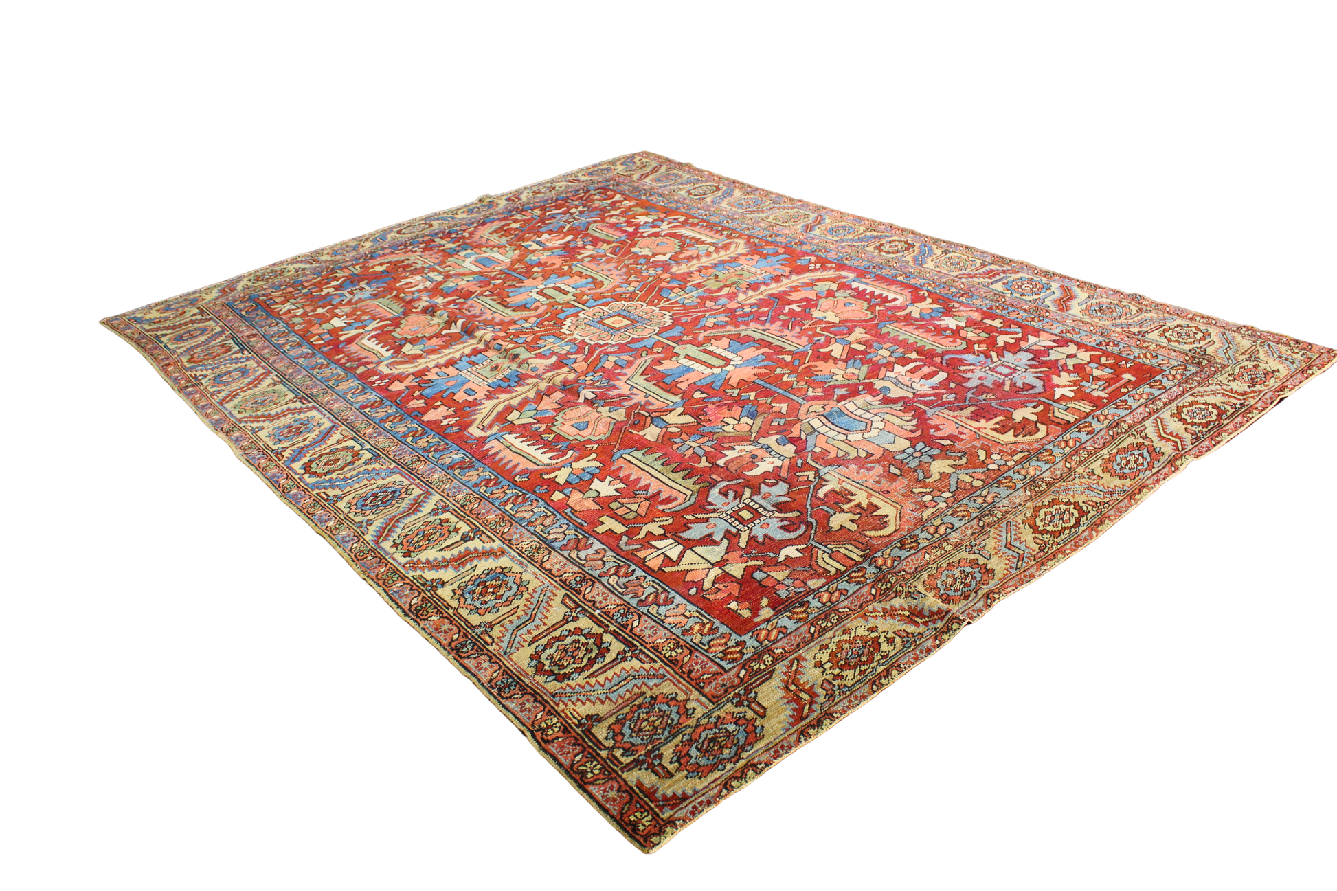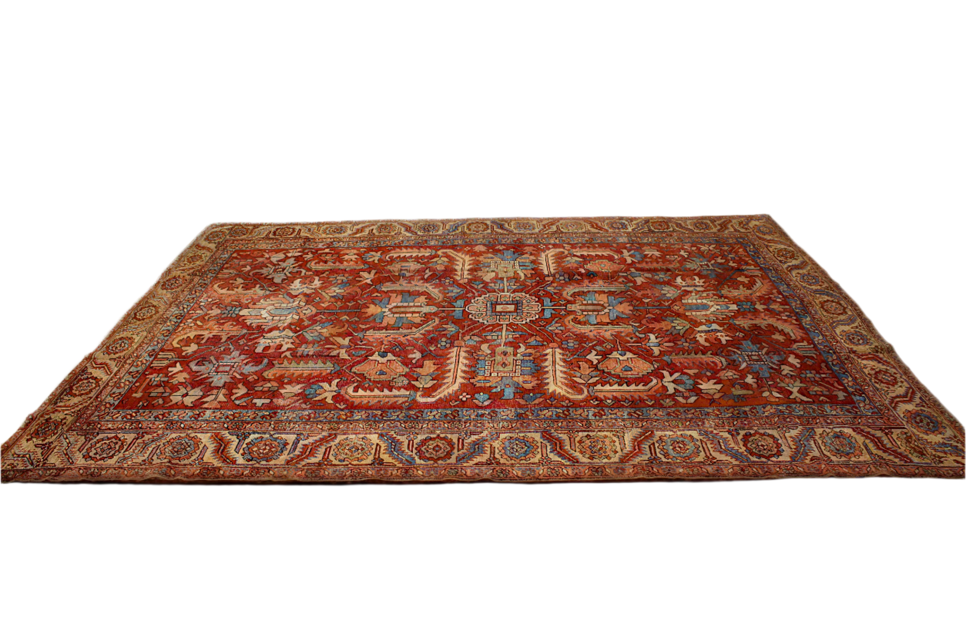 Bold and elemental, this antique Heriz rug from Persia (12′11″ × 9′8″) radiates the untamed spirit of the northwest mountains. Its vibrant brick-red field erupts with angular floral forms, stylized leaves, and dramatic geometric medallions in shades of midnight blue, pale ivory, sky blue, ochre, and saffron. Every motif pulses with energy and movement, woven with the signature clarity and strength of the Heriz tradition.