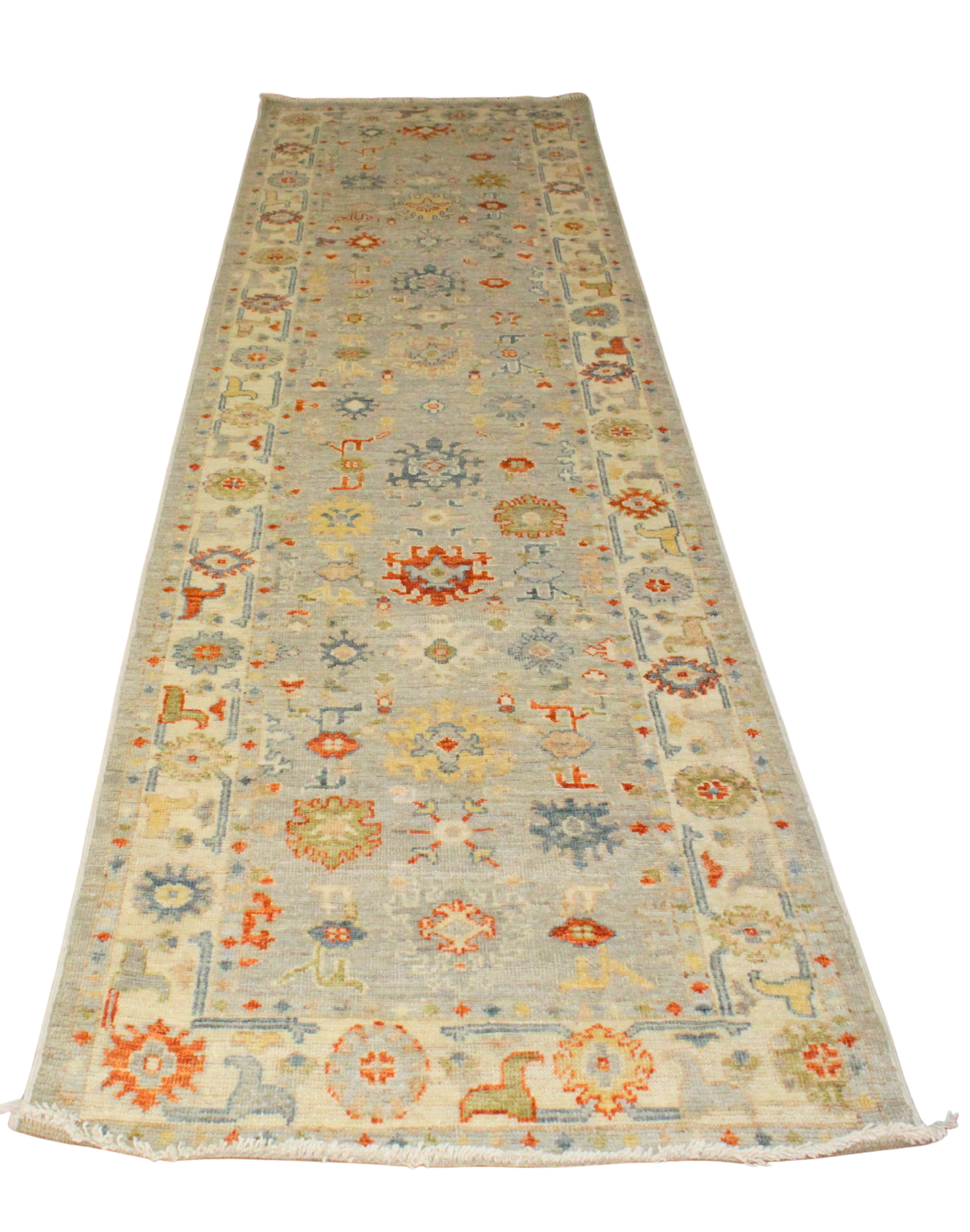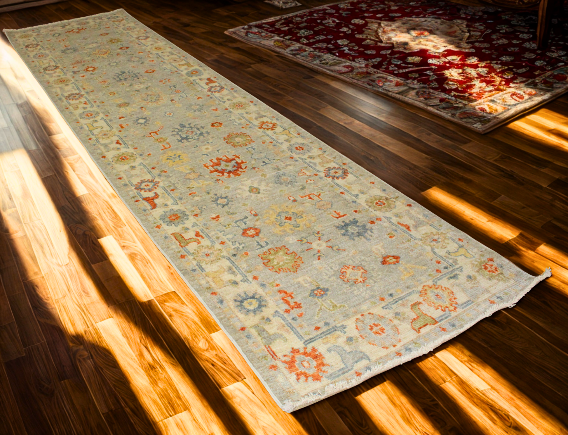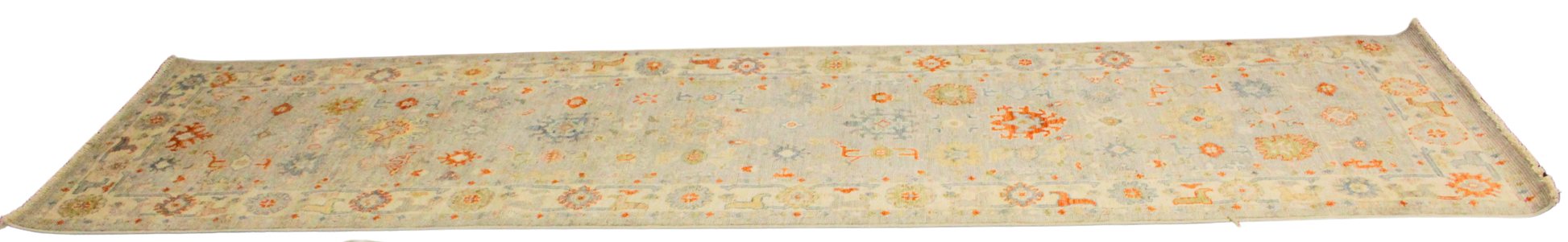 Soft and serene, this Afghan Oushak runner evokes the quiet elegance of a misty orchard at dawn. Set against a silvery grey-beige field, its playful floral motifs and primitive medallions bloom in subdued tones of rust, gold, powder blue, and faded coral. The wide border adds a classic frame, while the overall palette and airy composition make it perfect for bright, modern interiors. With its generous length, this piece is ideal for creating a gentle, graceful flow in extended hallways or along open kitchen islands.