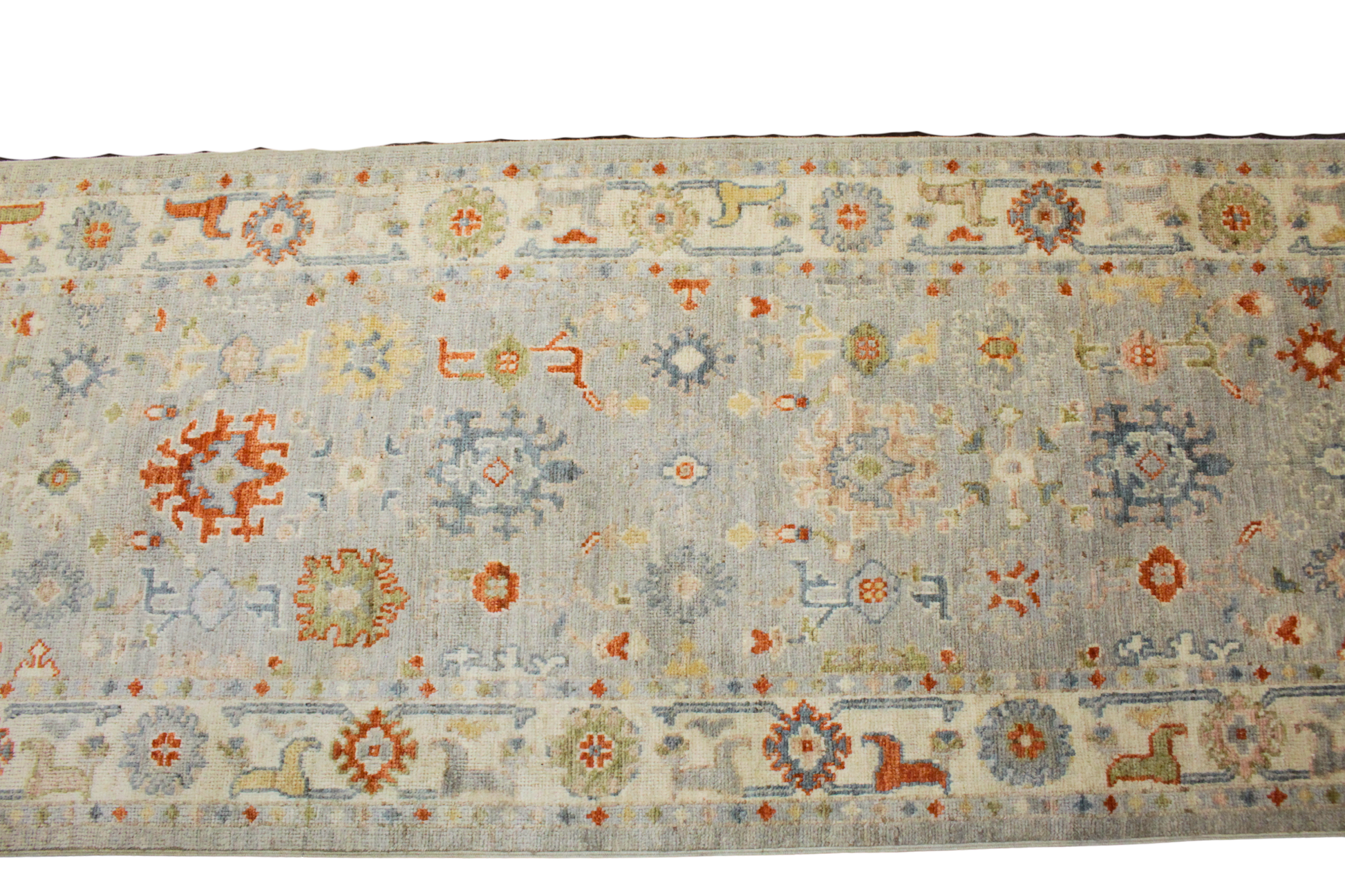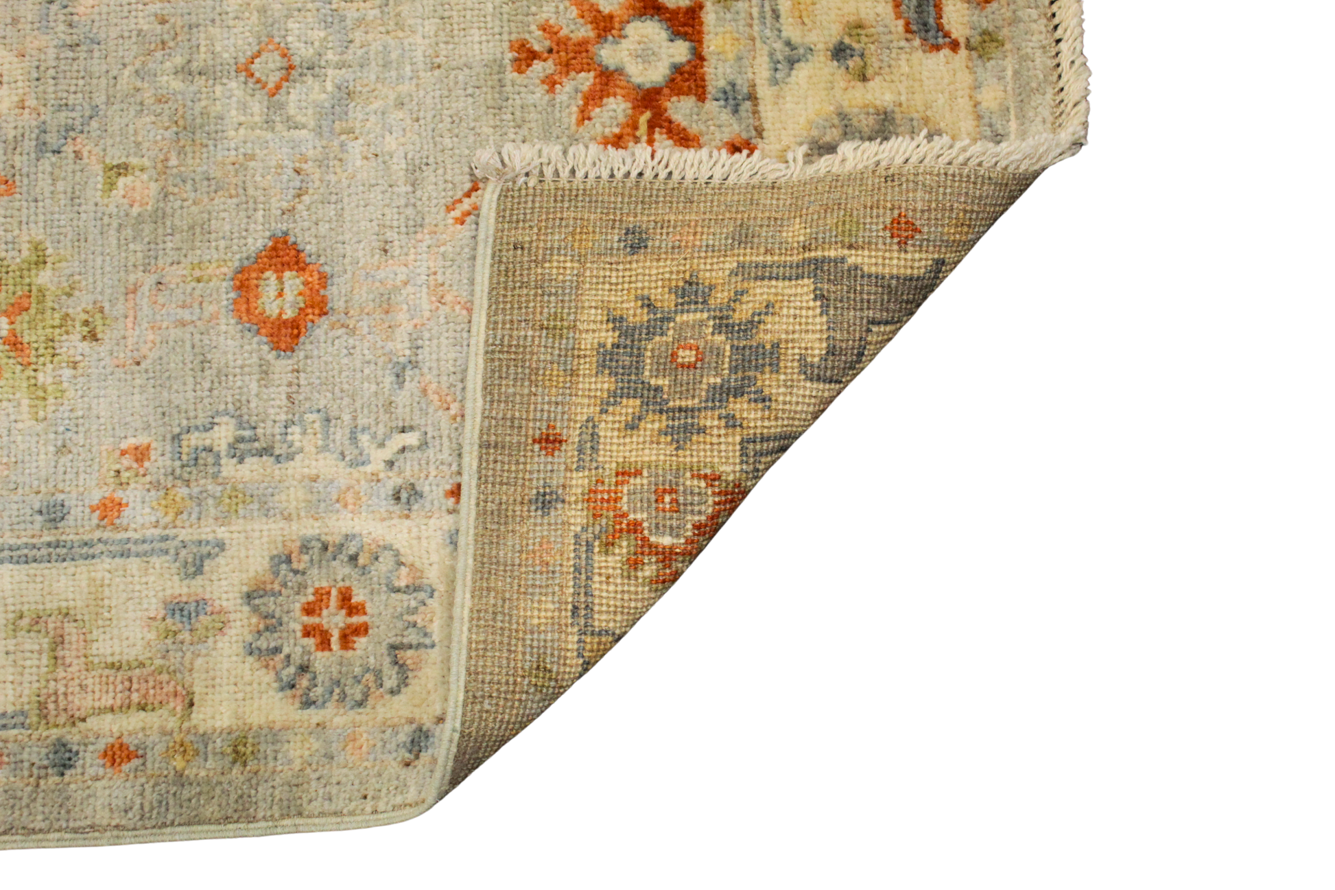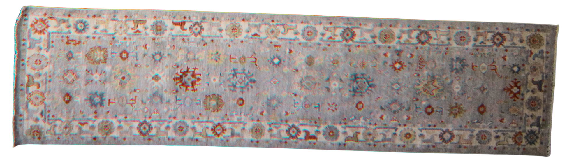 Soft and serene, this Afghan Oushak runner evokes the quiet elegance of a misty orchard at dawn. Set against a silvery grey-beige field, its playful floral motifs and primitive medallions bloom in subdued tones of rust, gold, powder blue, and faded coral. The wide border adds a classic frame, while the overall palette and airy composition make it perfect for bright, modern interiors. With its generous length, this piece is ideal for creating a gentle, graceful flow in extended hallways or along open kitchen islands.