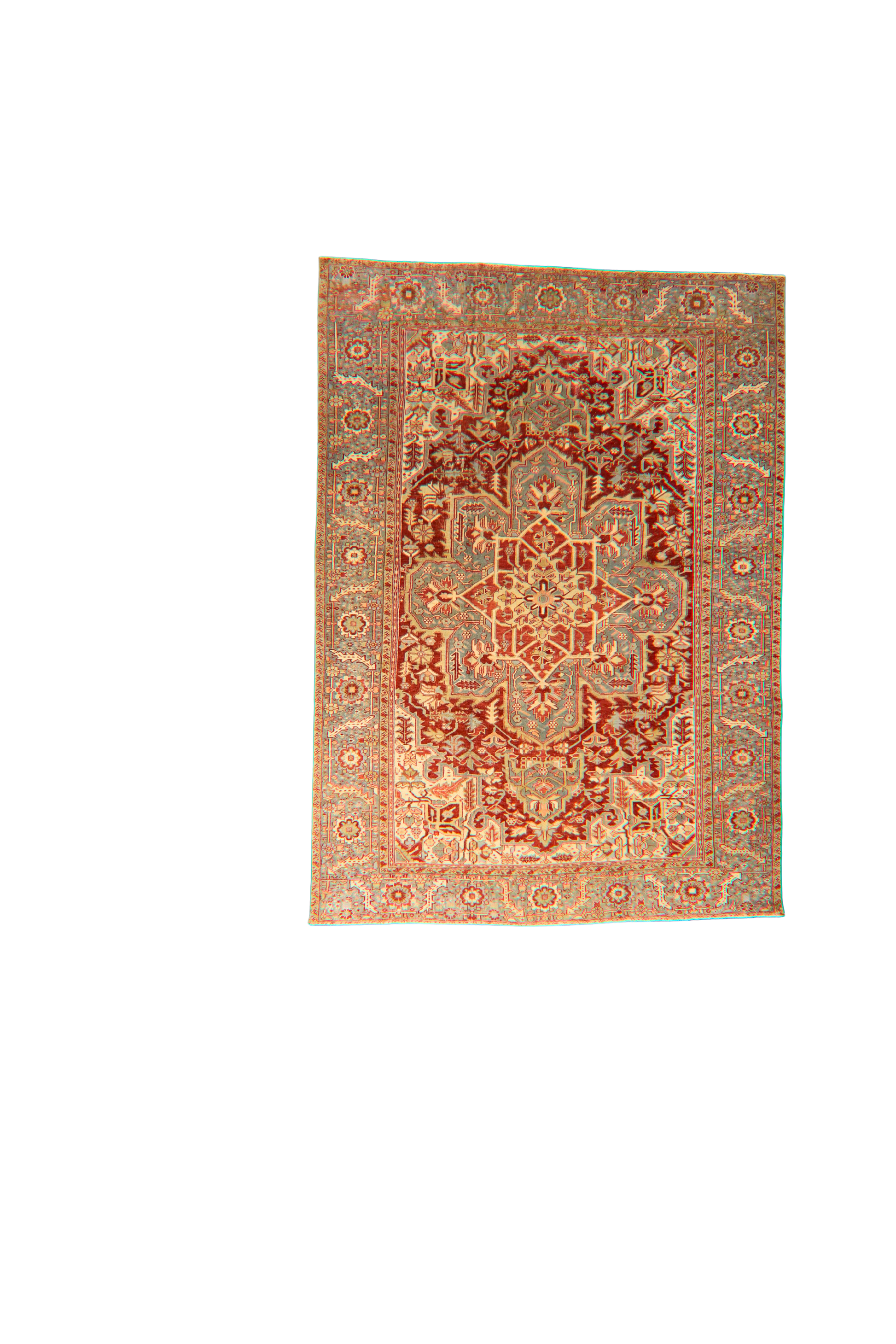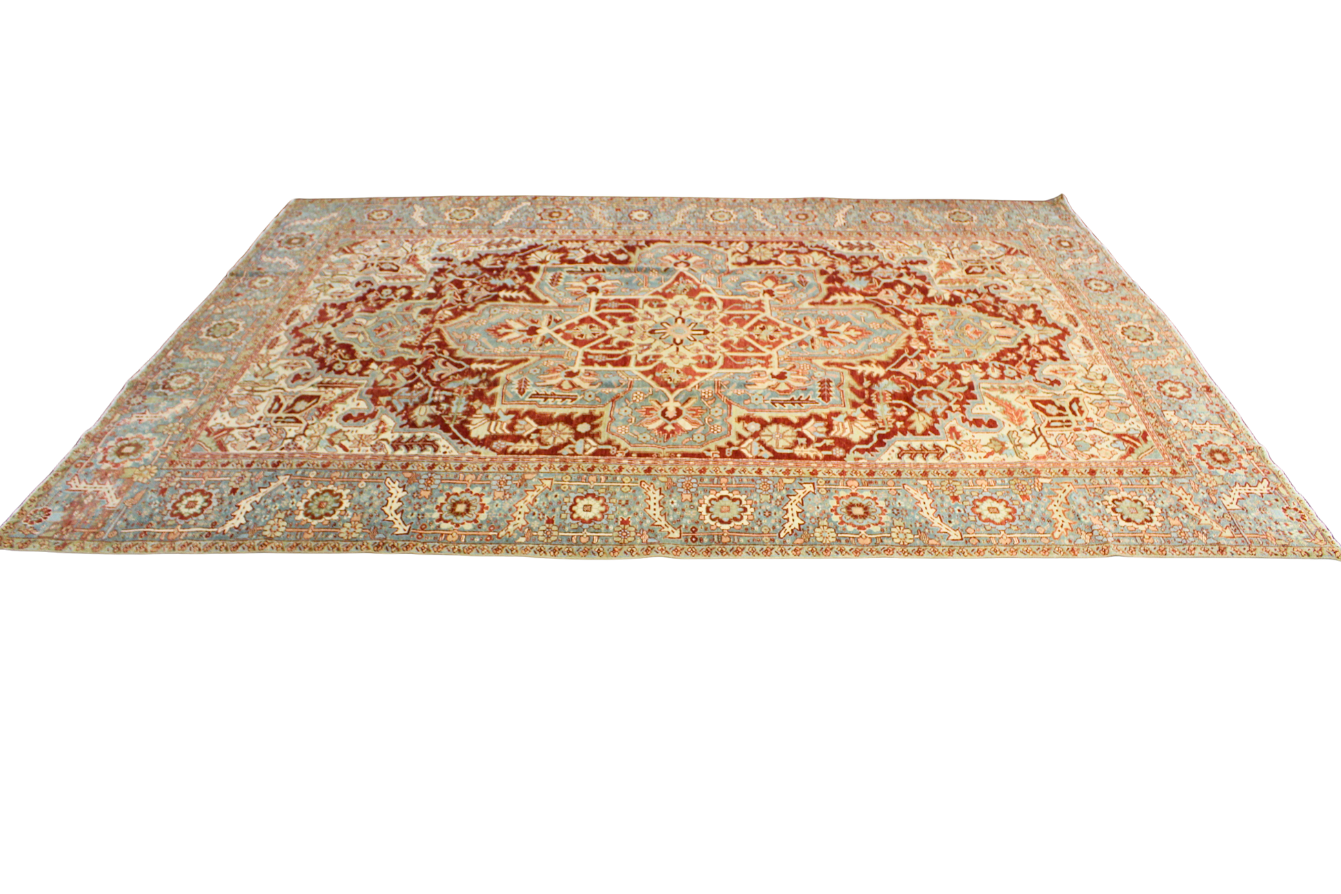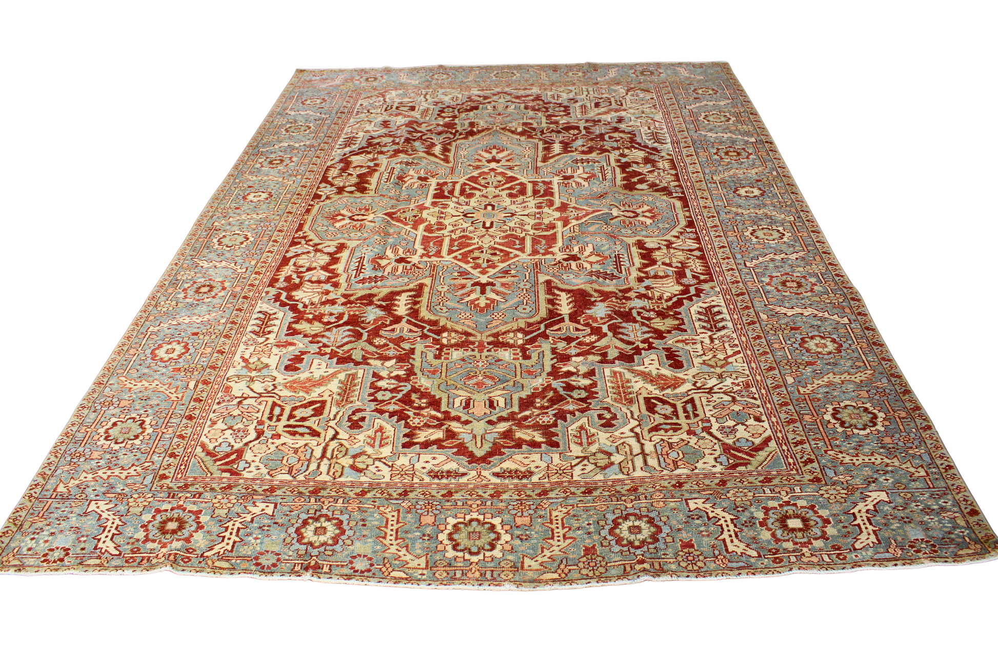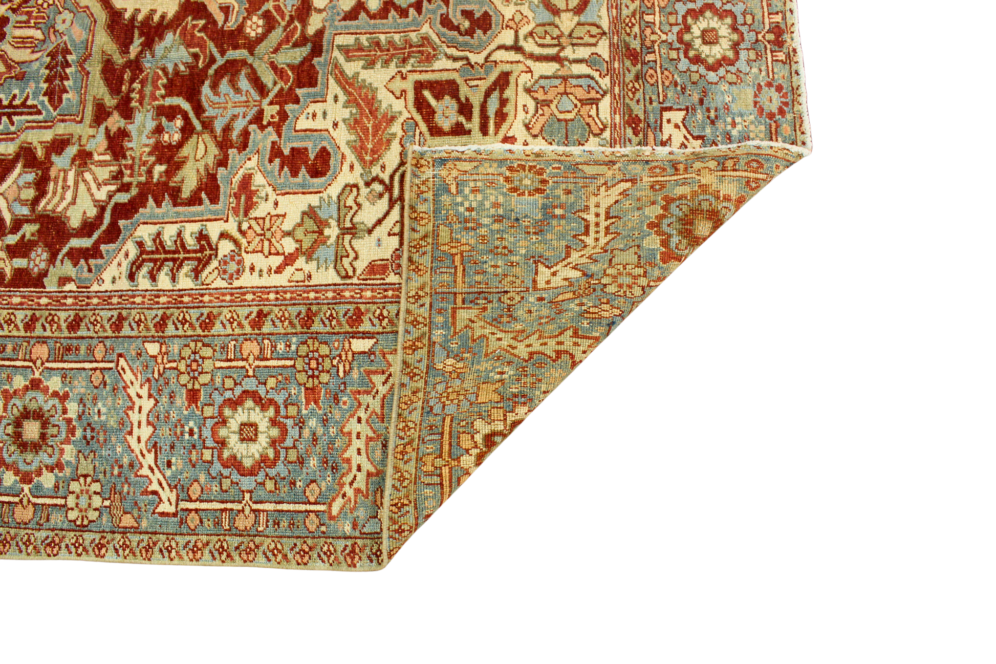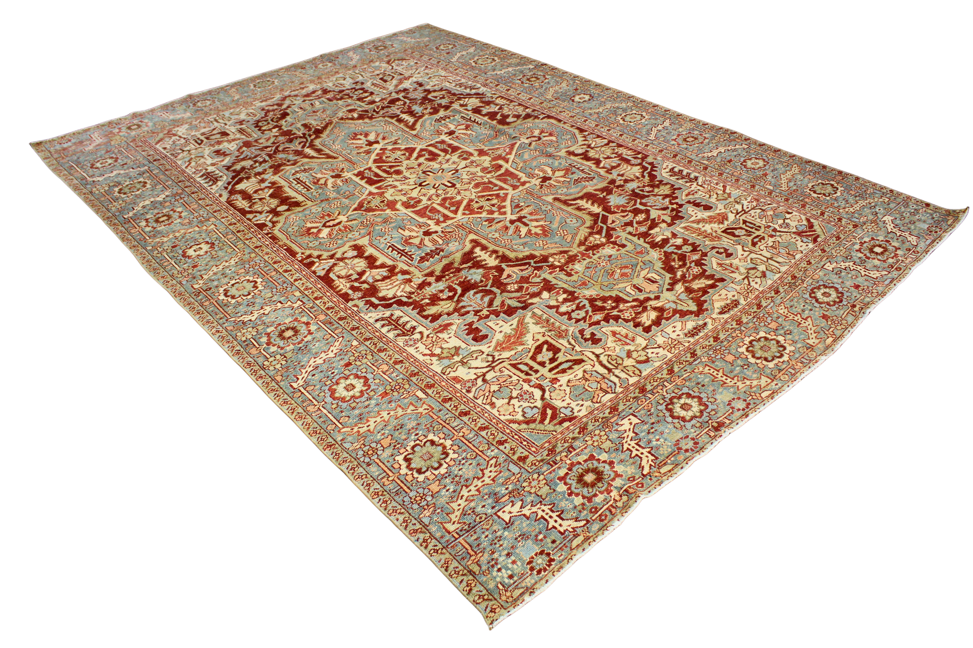 With its commanding central medallion and crisp tribal symmetry, this antique Persian Heriz rug (8′4″ × 11′7″) captures the rugged elegance and architectural precision that make Heriz carpets timeless design staples. A glowing terracotta red field anchors the composition, adorned with sky blue medallions and creamy ivory spandrels that together form a striking interplay of warmth and coolness.